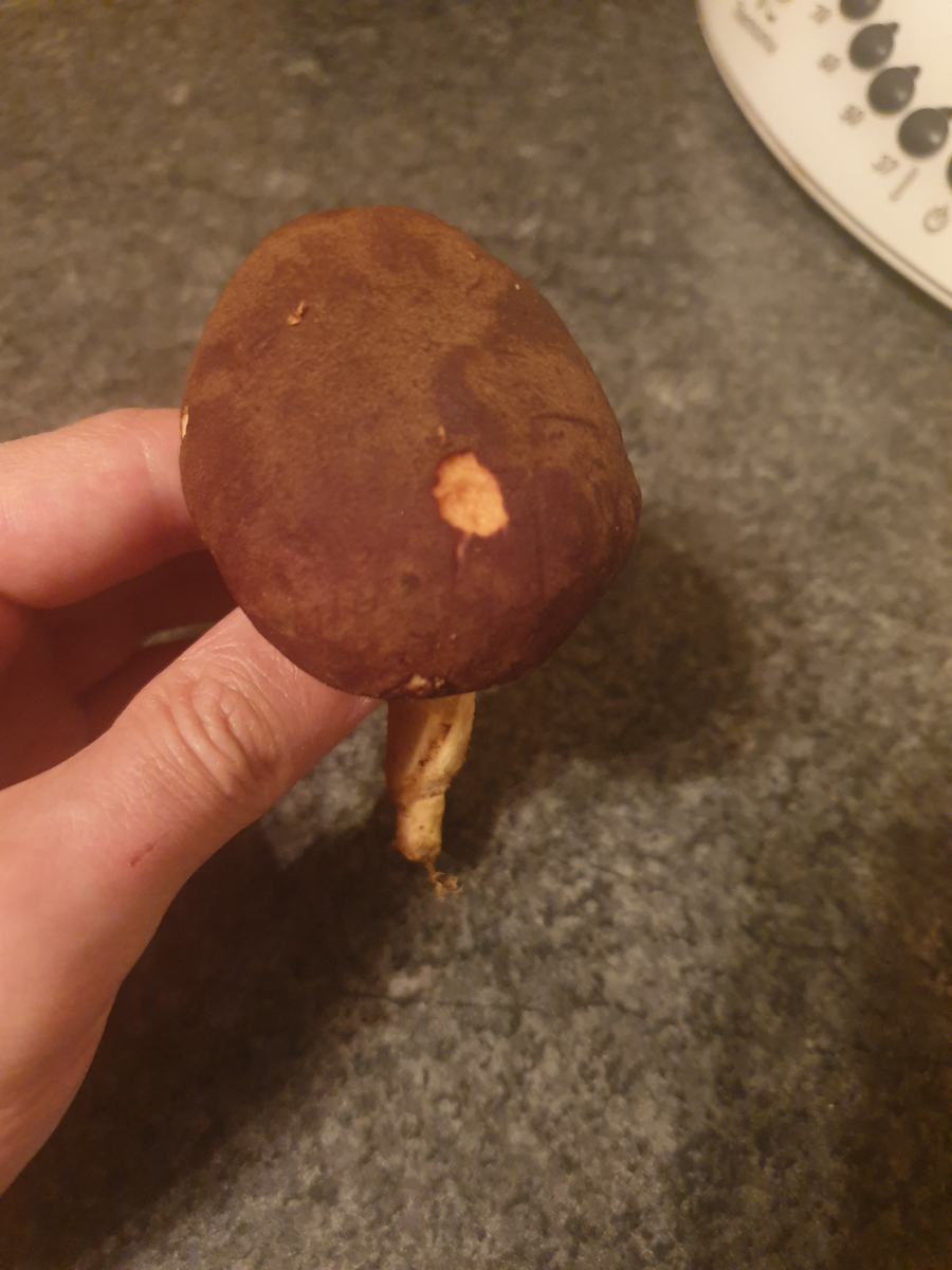 Hut: Dunkelbraun, identische Farbe wie bei einer Marone. Hutoberfläche fühlt sich angenehm feinsamtig an.