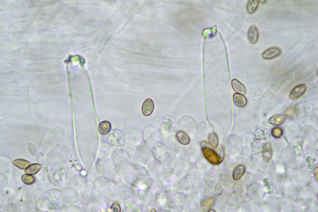 Sporen: nach vorne zugespitzt, 9-11 x 5-5,5 µm, im Lamellenpräparat zahlreiche unreife blassere Sporen, diese wurden nicht gemessen, Messung anhand abgefallener reifer Sporen an der Stielrinde