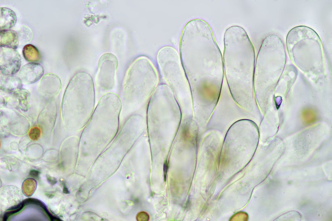 Cheilozystiden: keulig, selten etwas dickwandig, meist aber nicht, 33-52 x 11-18 µm