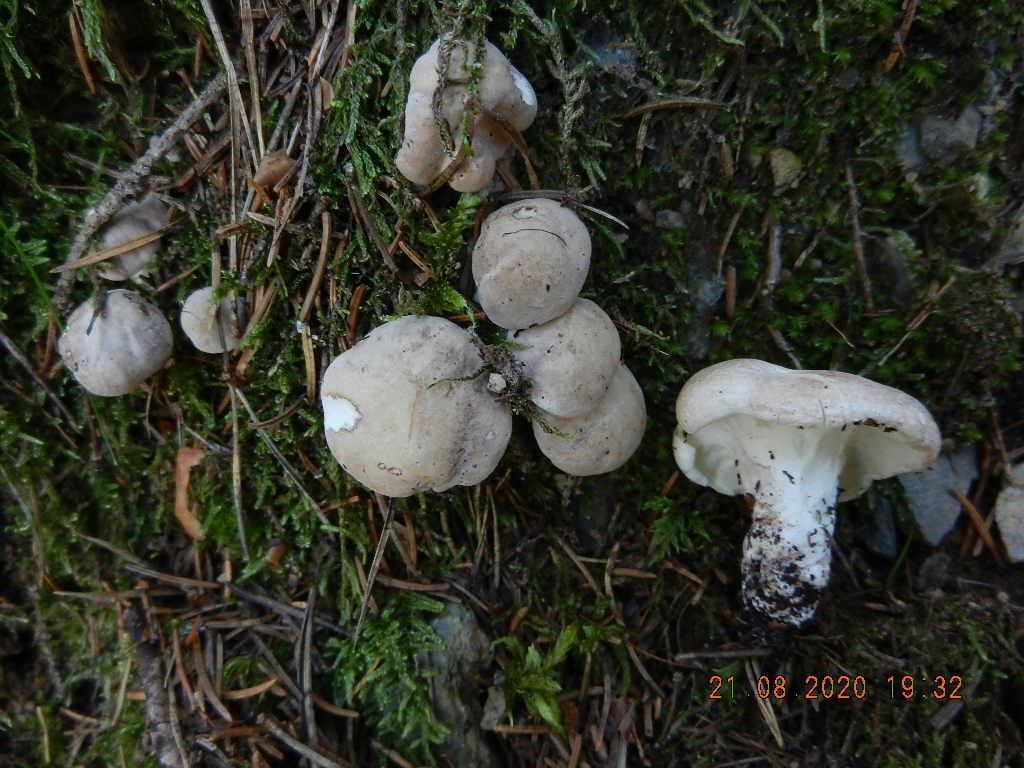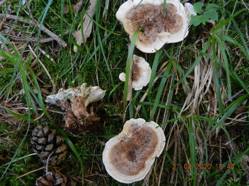 Pilz 3: gewachsen im montanen Nadelwald (ca. 800 m NN); korkartig zähes Fleisch, nach Suppengewürz riechend, Grashalme umwachsend (siehe oberes Exemplar)