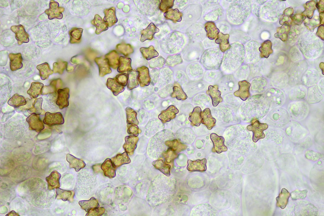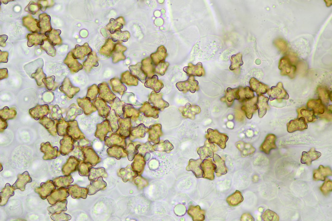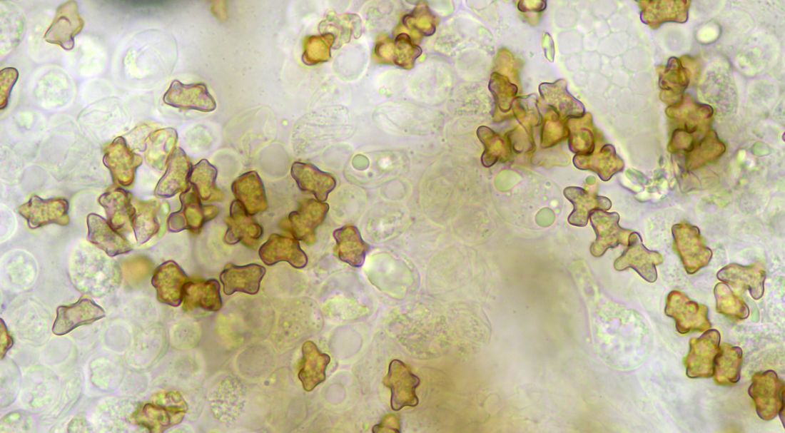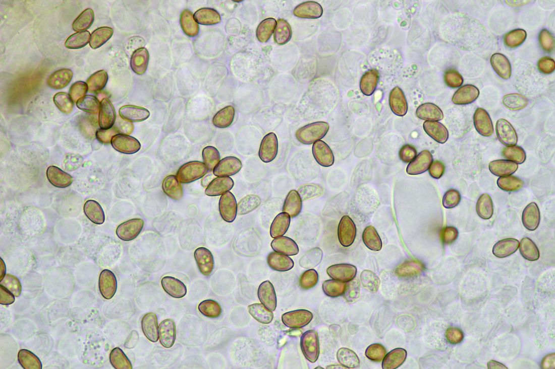 Sporen: sehr stark höckerig, manchmal richtig sternförmig ausgezogen, die Maße sind als Näherungswert ("Kasten drum rum") zu verstehen: 8-10,5 x 6-9 µm