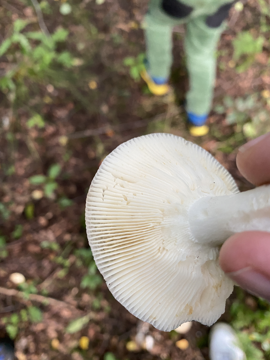 es gibt so rum fünf, sechs Täublinge mit dieser Hutfarbe. Scharfe oder gar giftige sind nicht darunter. Du könntest auf die Schnelle mal testen, ob die Lamellen beim Darüberfahren verschmieren oder absplittern. Wenn du es noch genauer wissen willst, solltest du die Farbe des Sporenpulvers ermitteln (im Angebot: weiß oder rahmgelb).