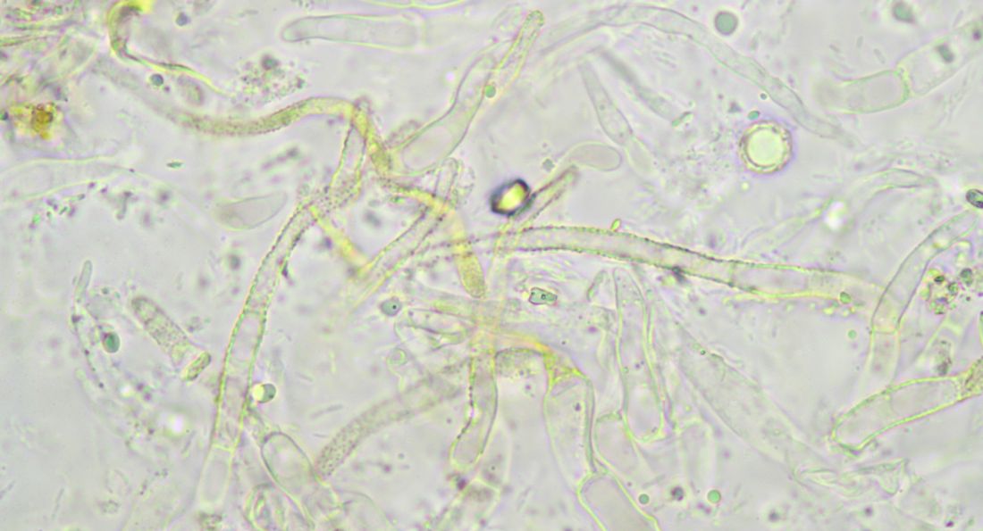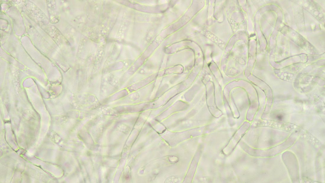 Pileozystiden: Verschiedenartige Elemente (siehe Fotos, kenne mich nicht aus, wie da was heißt). Auffällig sind sehr häufig nach oben hin deutlich raue Hyphen, siehe Fotos.