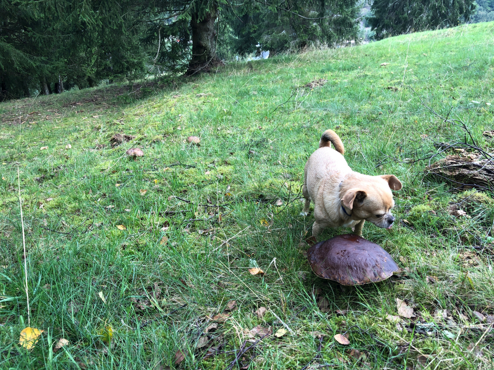 27 Der Pilzspürhund wendet sich angewidert von einem überständigem Steinpilz ab.