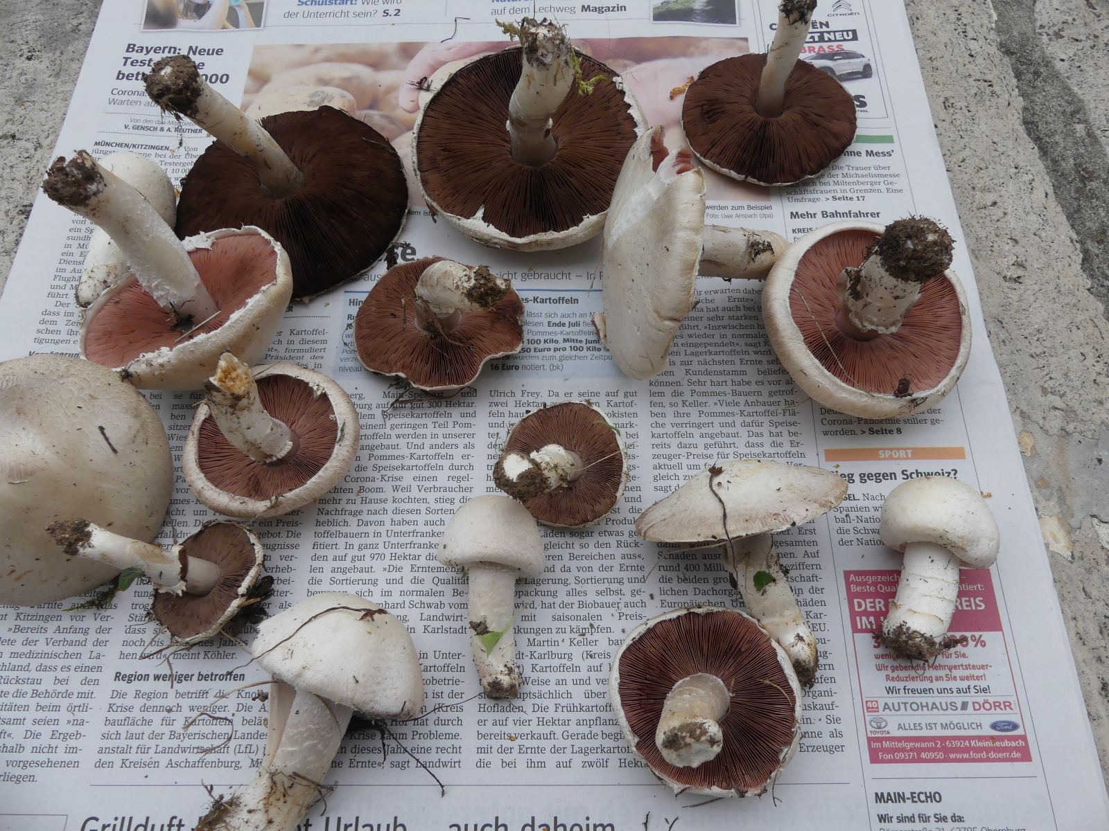 Nach den Regenmengen letzte Woche habe ich heute voller Hoffnung einen kleinen Waldspaziergang gemacht, leider war der Wald weitgehend pilzleer. Auf dem Rückweg konnte ich im Vorbeifahren ein paar helle Flecken auf einer kleinen Wiese im Ort entdecken, die sich als Champignons herausstellten.