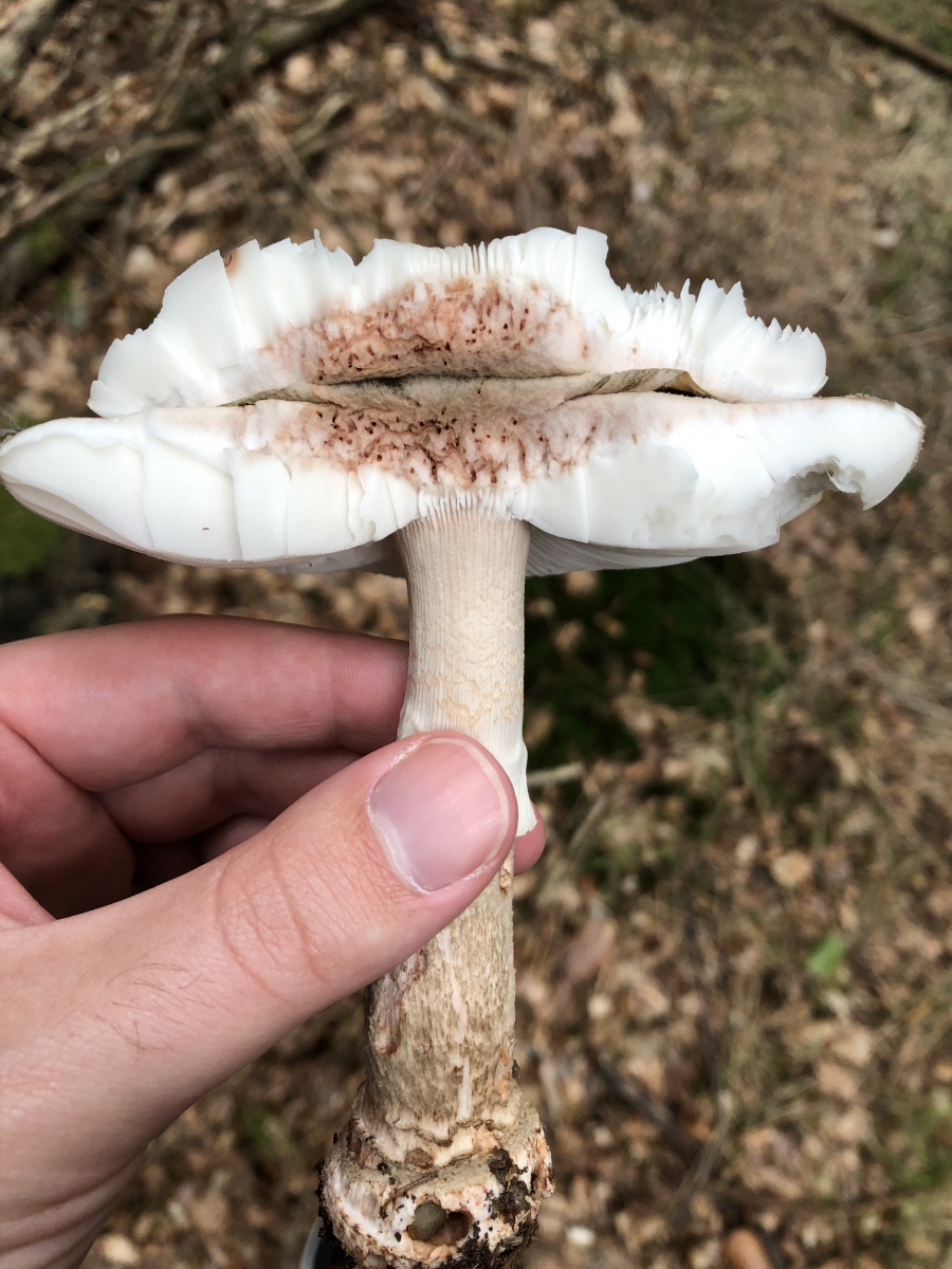 heute bin ich auf ein paar vermeintliche Perlpilze gestoßen. Der Ring sieht gerieft aus, allerdings hat er beim Anschnitt nicht gerötet. Die Fraßflecken sehen auch höchstens minimal gerötet aus. Geruch und Geschmack waren neutral. Die erfahrenen Forenmitglieder können mir sicherlich weiterhelfen :)