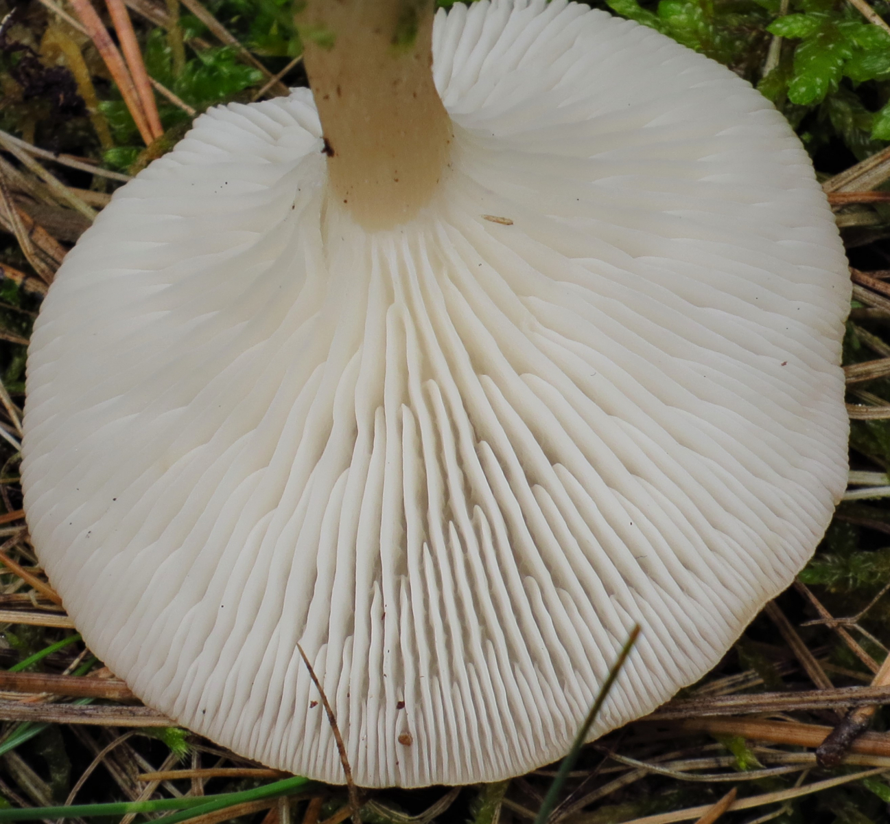 Lamellen: deutlich am Stiel herablaufend, Farbe weiß bis hell creme, sehr viele Zwischenlamellen, Lamellenschneiden wellig, bei größeren FK etwas überstehend (siehe Bild 4),