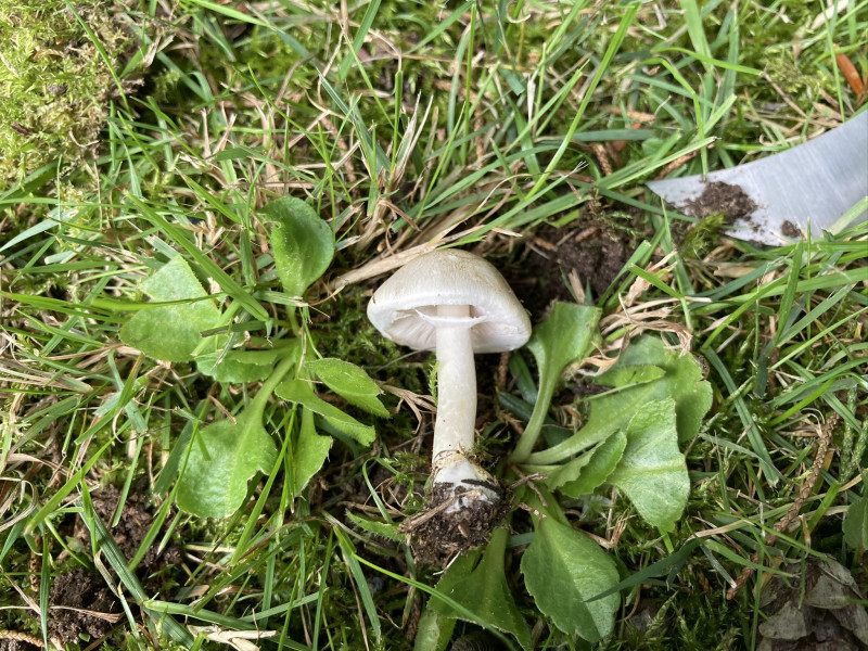 Stiel: weißlich, Basis deutlich knollig verdickt, auf Druck gilbend, mit KOH deutlich gelb färbend