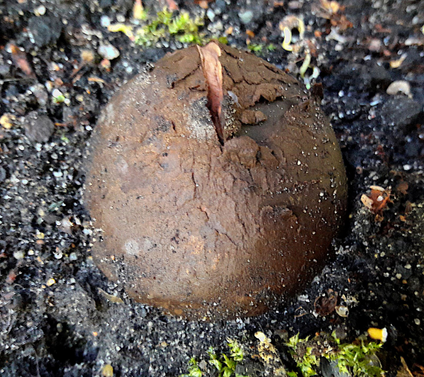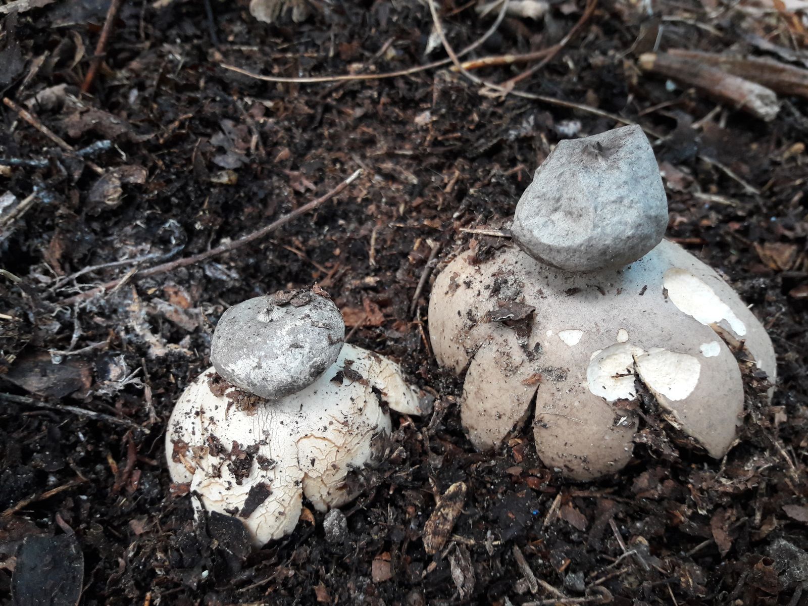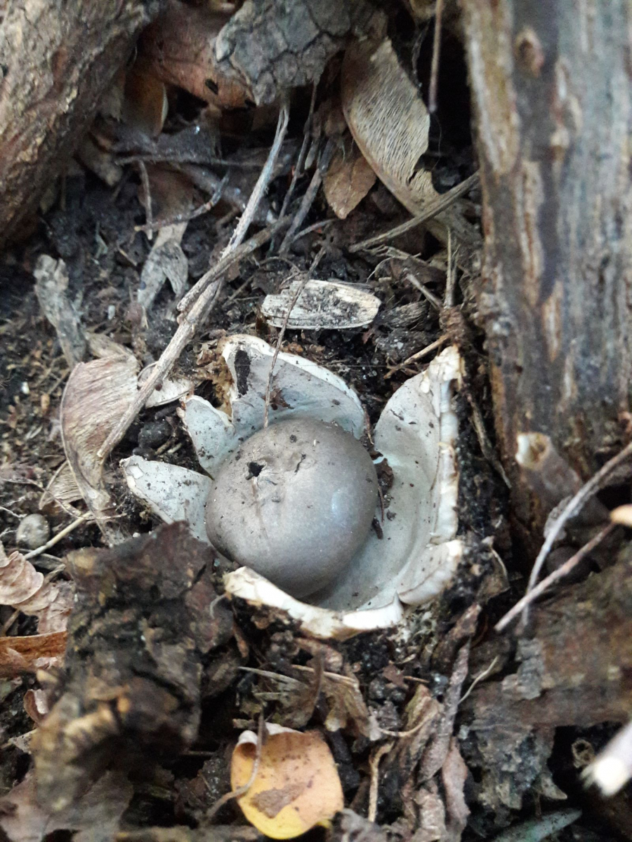 Der ungeöffnete Erdstern muß nicht die gleiche Art sein, ich tendiere da eher (wegen der leicht rötlichen Farbe des Fleisches) eher zum Rötenden Erdstern, Geastrum rufescens.