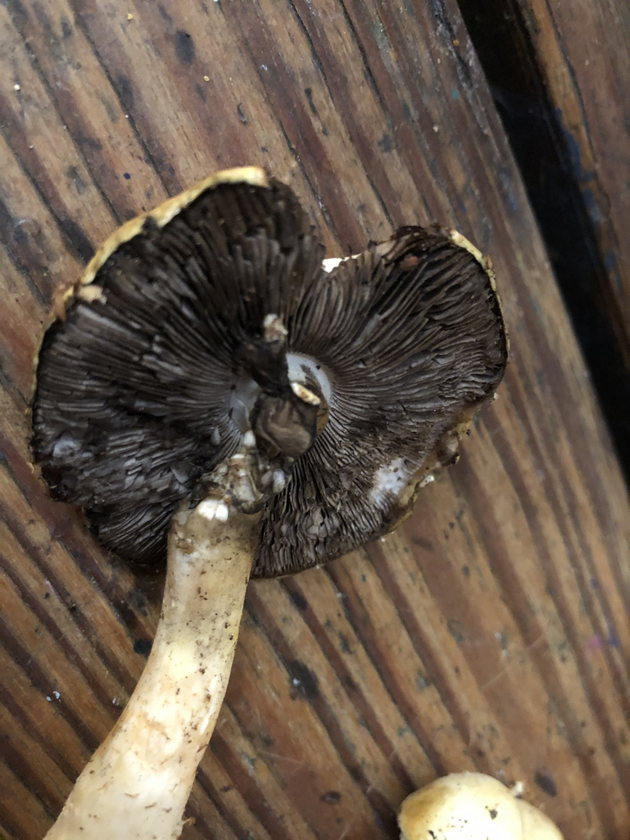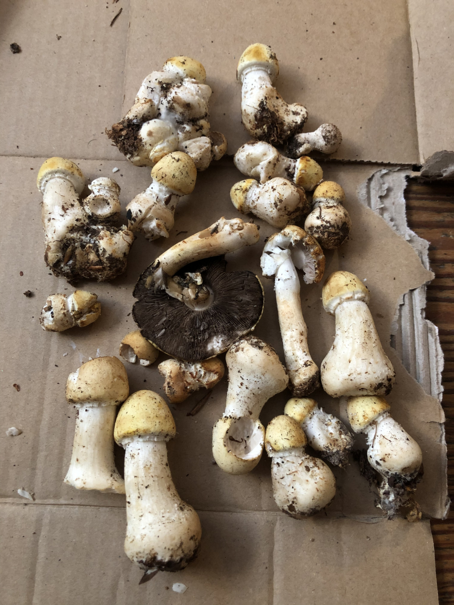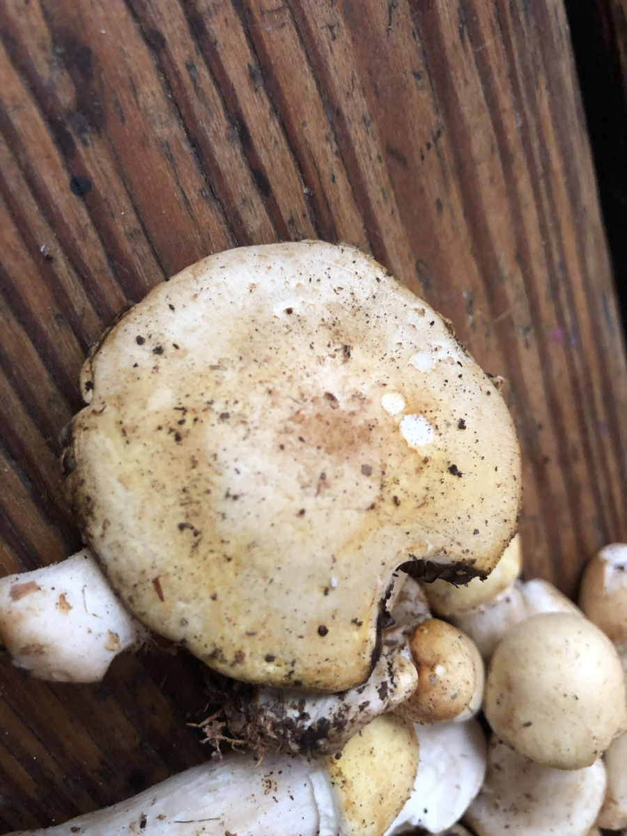 heute fand ich im Wald unter einer Fichte in Büscheln wachsend diese kleinen Kerle. Normalerweise hätte ich sie nicht mitgenommen aber sie rochen so gut, dass ich meine, es könnte sich um eine Art Anischampignon handeln. Allerdings gilben sie auf der Kappe recht stark, der Geruch ist irgend etwas zwischen Anis und Marzipan, die Form könnt ihr auf den Fotos erkennen, sie sind sehr knollig an der Basis. Ein etwas älteres Exemplar hat schon dunkelbraune Lamellen.