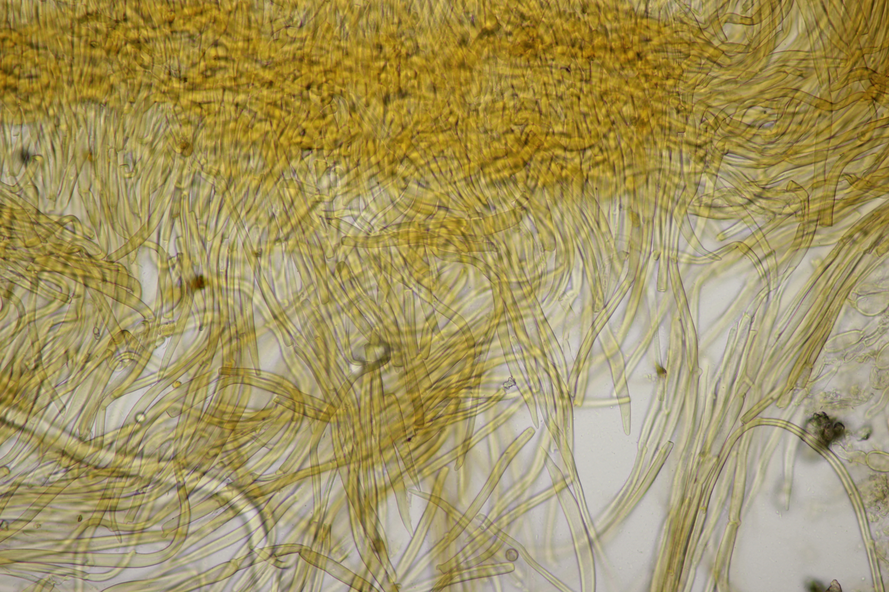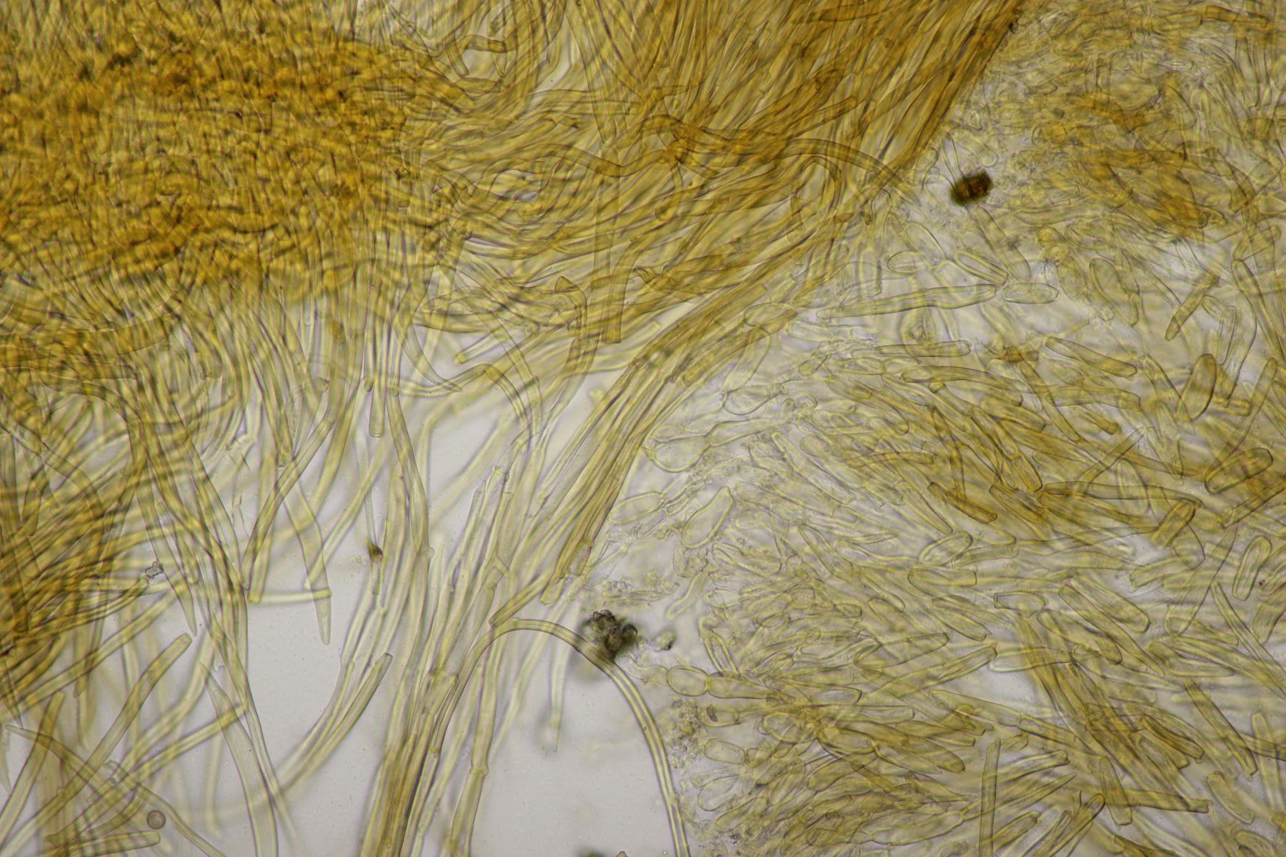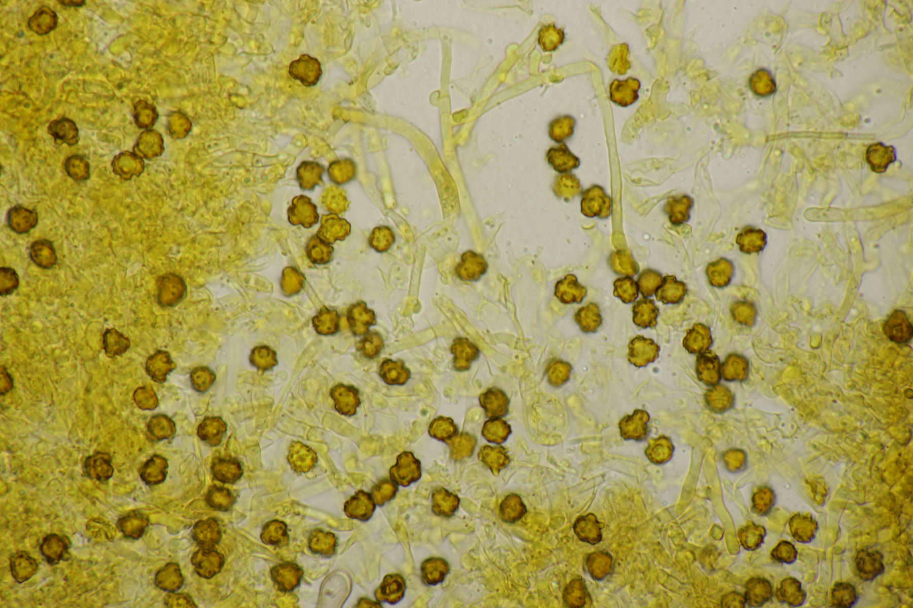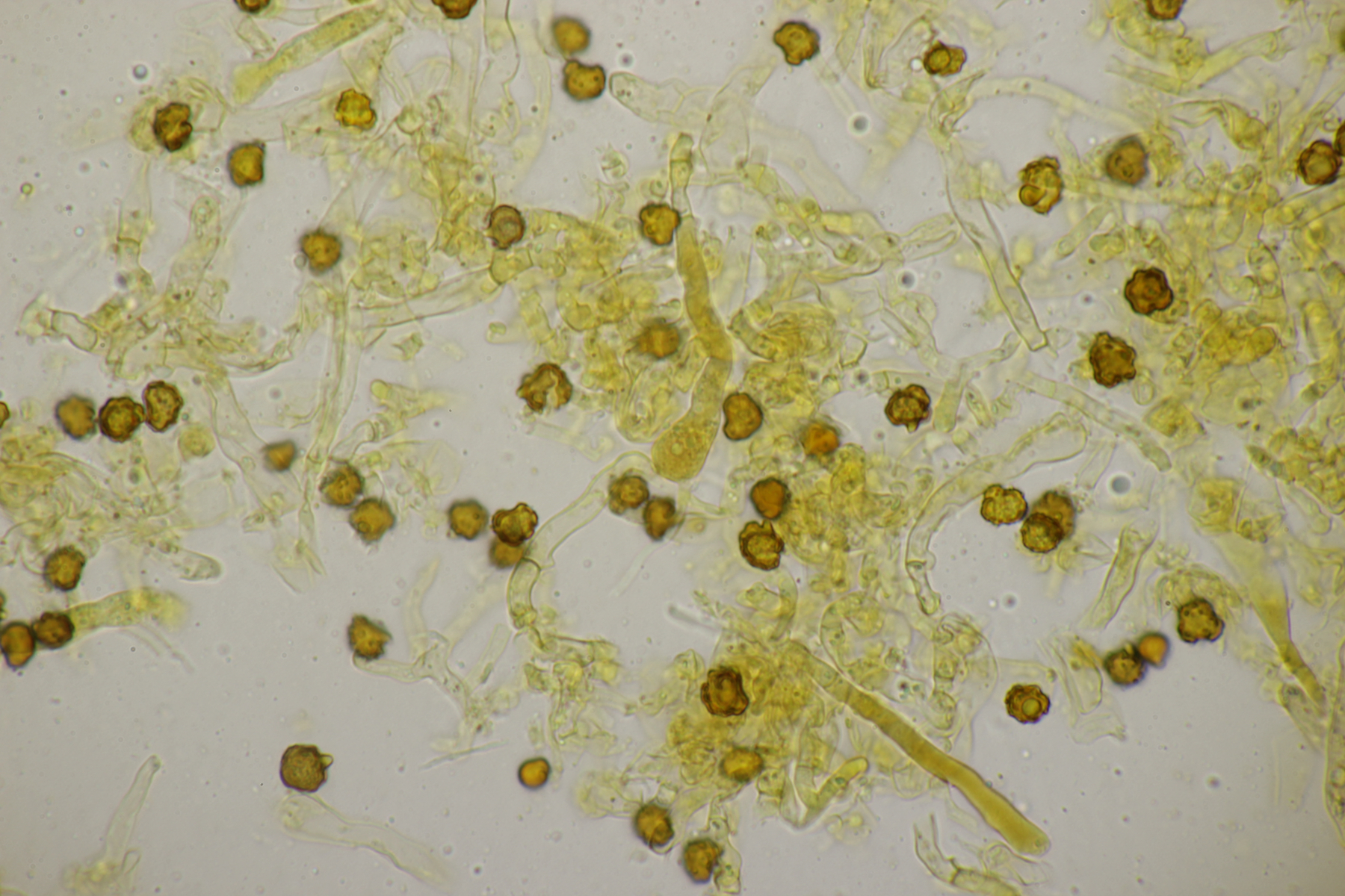 Das Präparat färbt sich in KOH immer so typisch ein, wie in deinem Aufnahmen. Makroskopisch hat nur noch Tomentella fibrosa diese intensive Färbung, aber mikroskopisch völlig anders, mit Zystiden und ohne Schnallen.