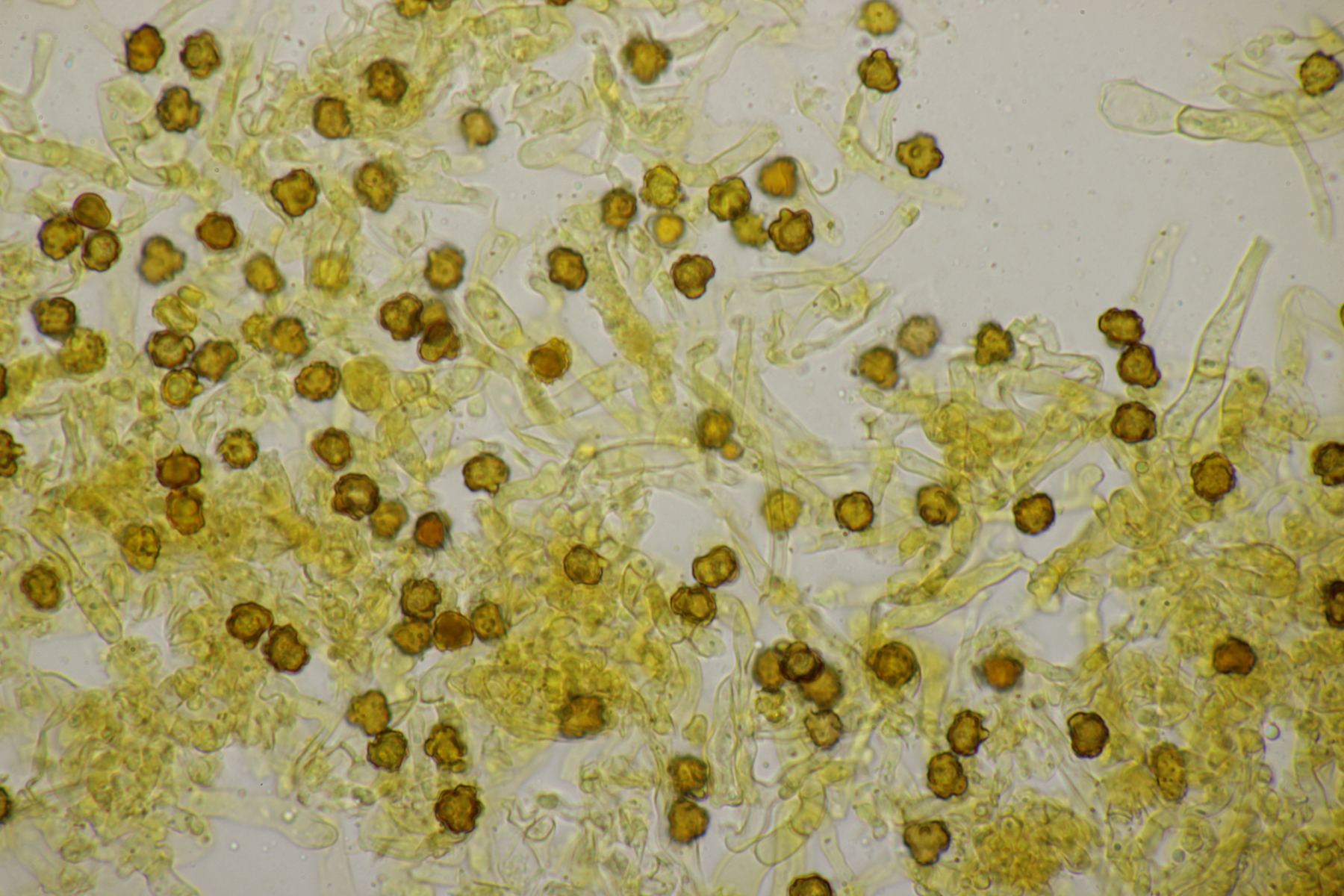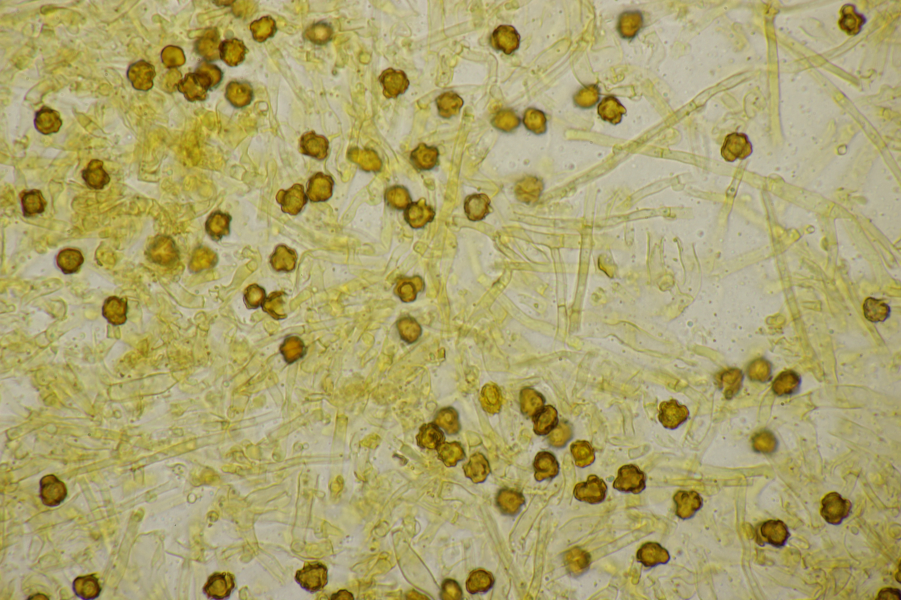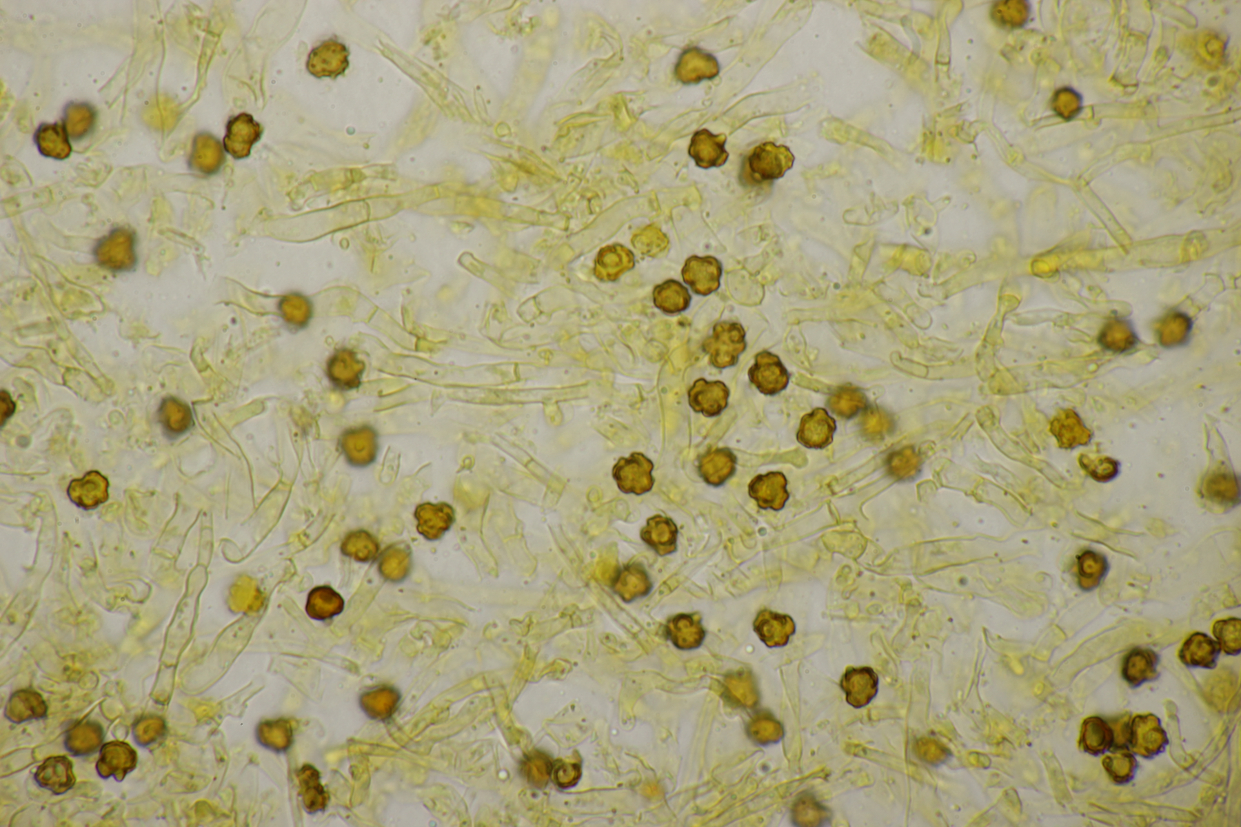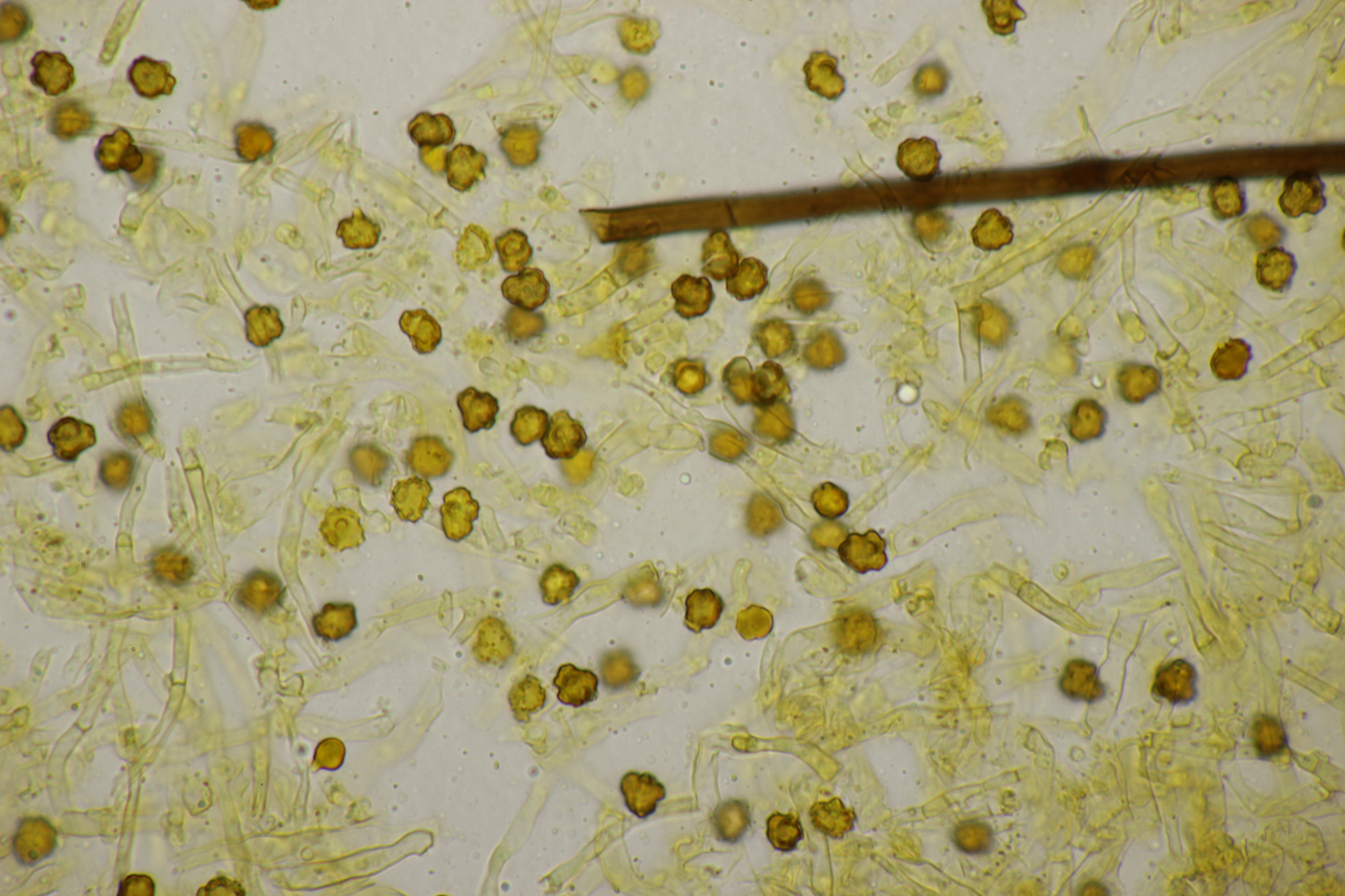 2. Direkt neben den Hemileccinums aus Teil 1 lag ein kleiner Ast mit dem Cythus striatus von oben. Da Karl mir am Vortag schrieb, außer den drei Röhrlingen gäbe es im Stadtwald aktuell keine Großpilze, wollte ich natürlich das Gegenteil beweisen und nahm den Ast um ihn etwas besser ins Licht zu rücken. Dabei fiel mir dann auf der Unterseite ein freudig orange-farbener Belag auf. Der erste Gedanke an eine Tomentella hat sich dann auch mikroskopisch bestätigt. Sporengröße (7.8+-0.5) µm x (6.0+-0.5) µm, Sporen unregelmäßig gelappt, Hyphen mit Schnallen, dünnwandig, schmal. Alle Mikrobilder in KOH, d.h. keine cyanescenten Elemente vorhanden. Eventuell Tomentella umbrinospora?