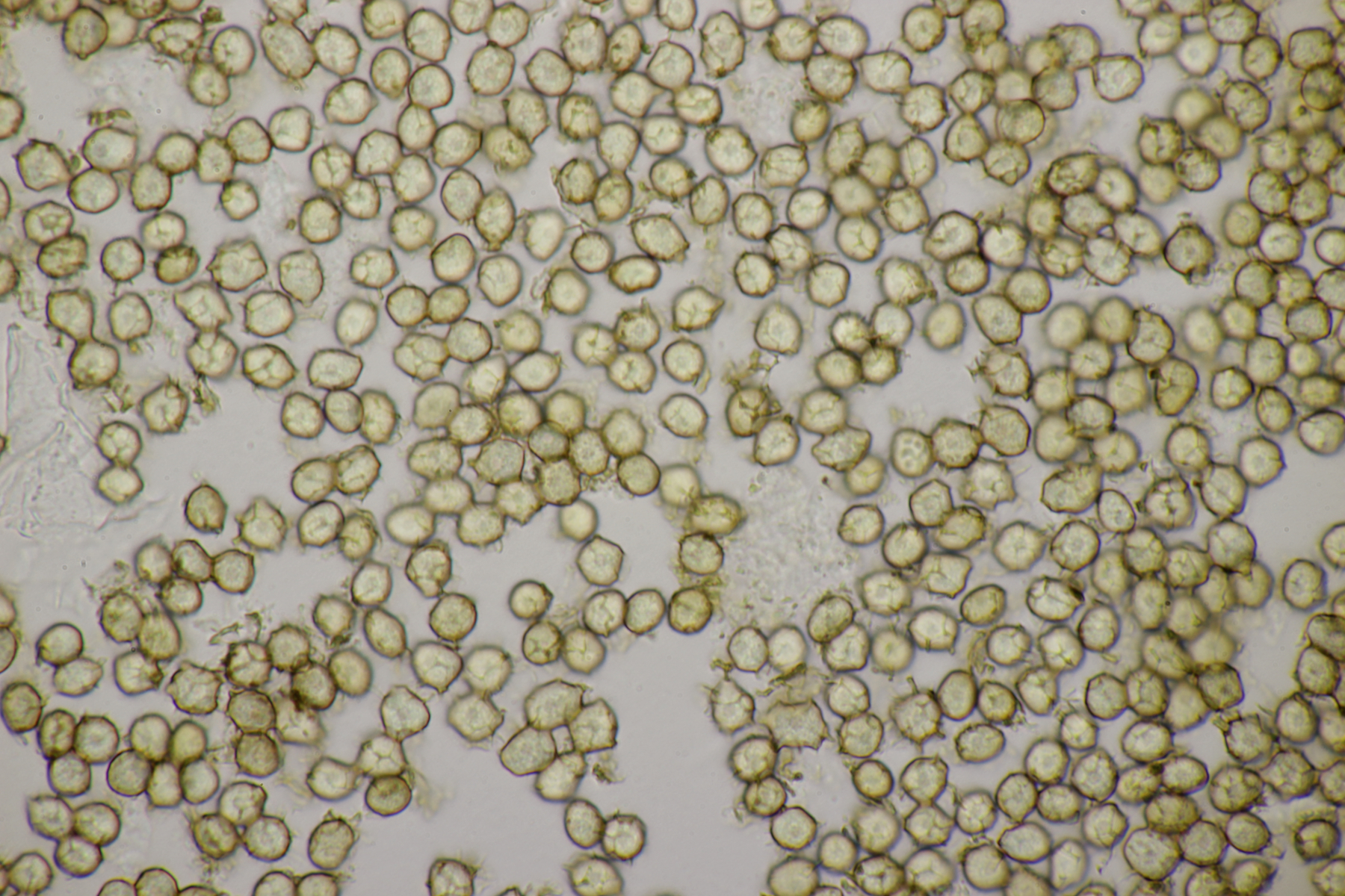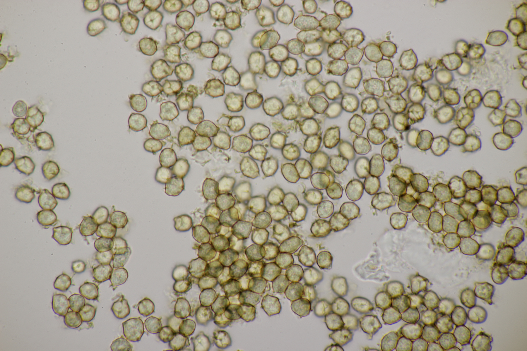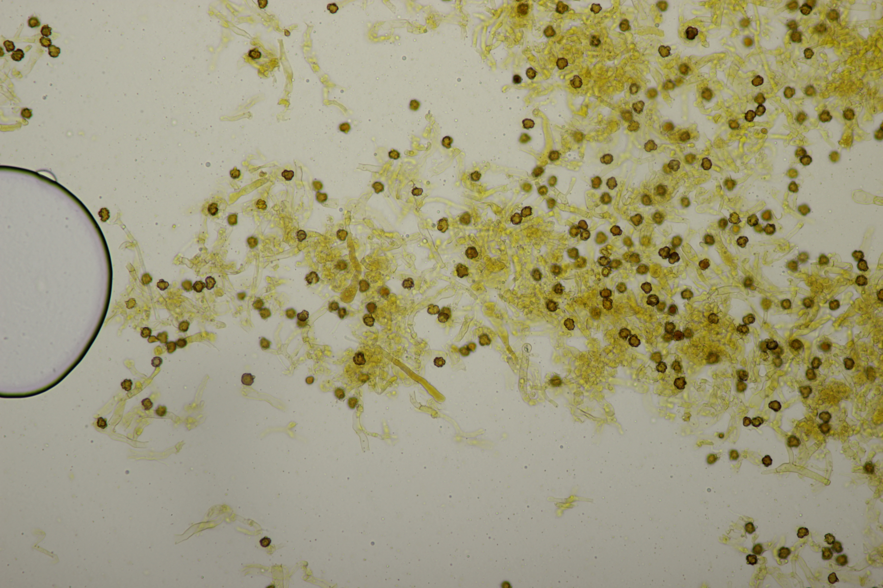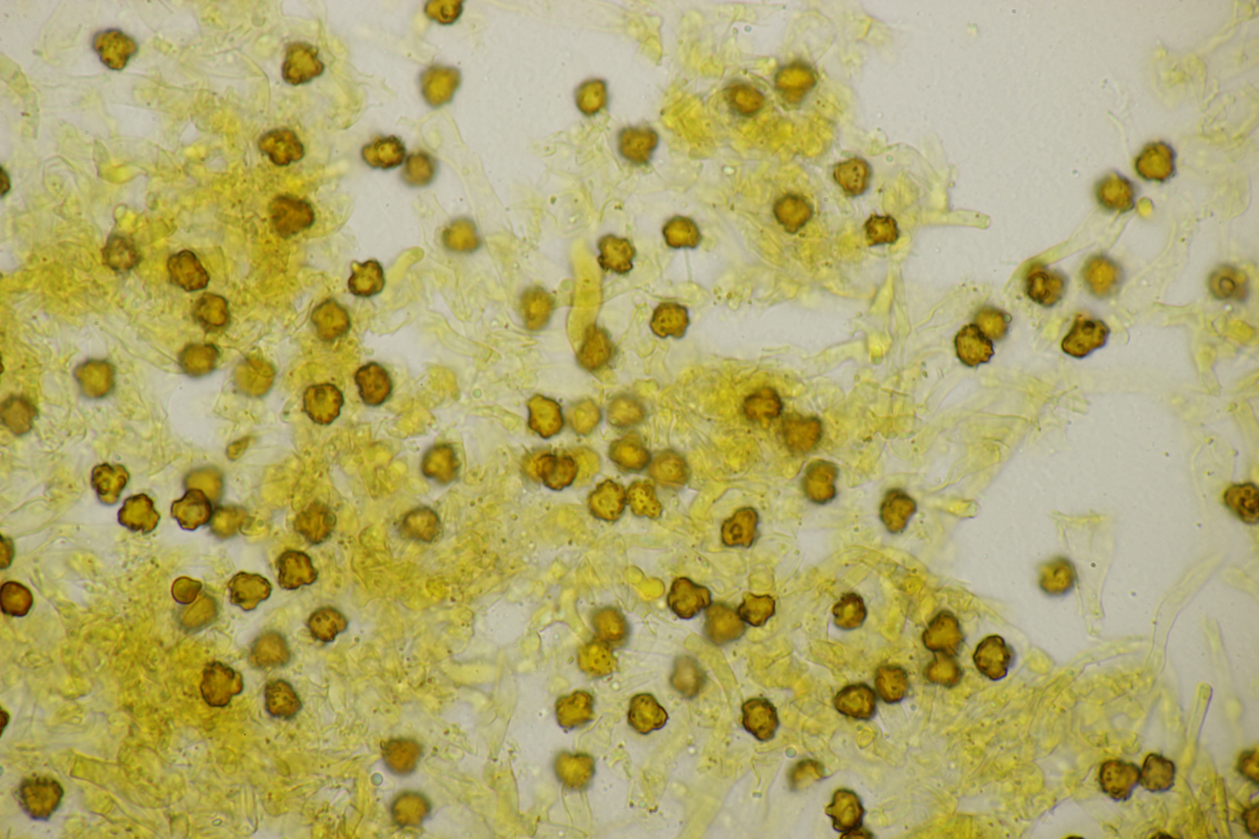 2. Direkt neben den Hemileccinums aus Teil 1 lag ein kleiner Ast mit dem Cythus striatus von oben. Da Karl mir am Vortag schrieb, außer den drei Röhrlingen gäbe es im Stadtwald aktuell keine Großpilze, wollte ich natürlich das Gegenteil beweisen und nahm den Ast um ihn etwas besser ins Licht zu rücken. Dabei fiel mir dann auf der Unterseite ein freudig orange-farbener Belag auf. Der erste Gedanke an eine Tomentella hat sich dann auch mikroskopisch bestätigt. Sporengröße (7.8+-0.5) µm x (6.0+-0.5) µm, Sporen unregelmäßig gelappt, Hyphen mit Schnallen, dünnwandig, schmal. Alle Mikrobilder in KOH, d.h. keine cyanescenten Elemente vorhanden. Eventuell Tomentella umbrinospora?