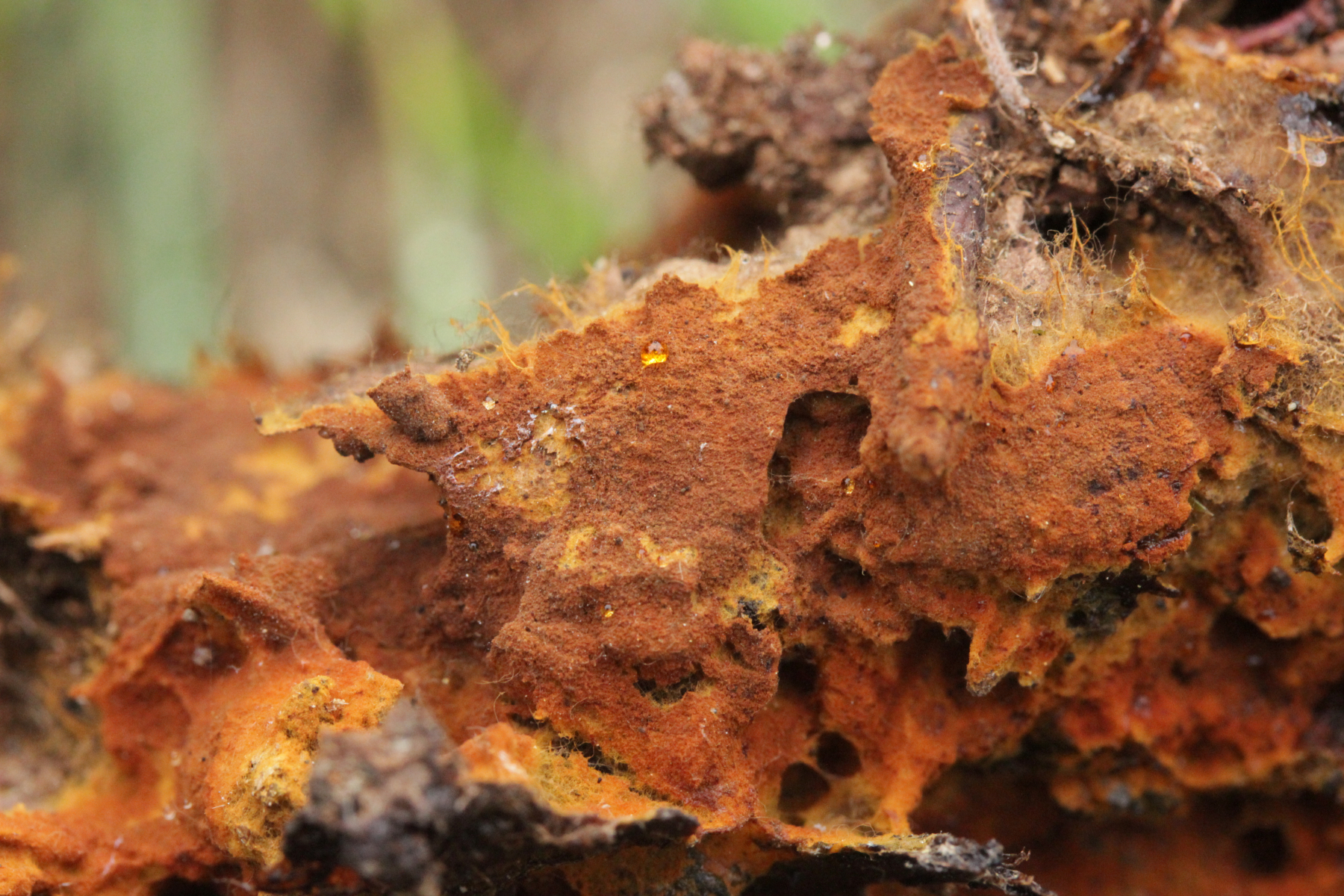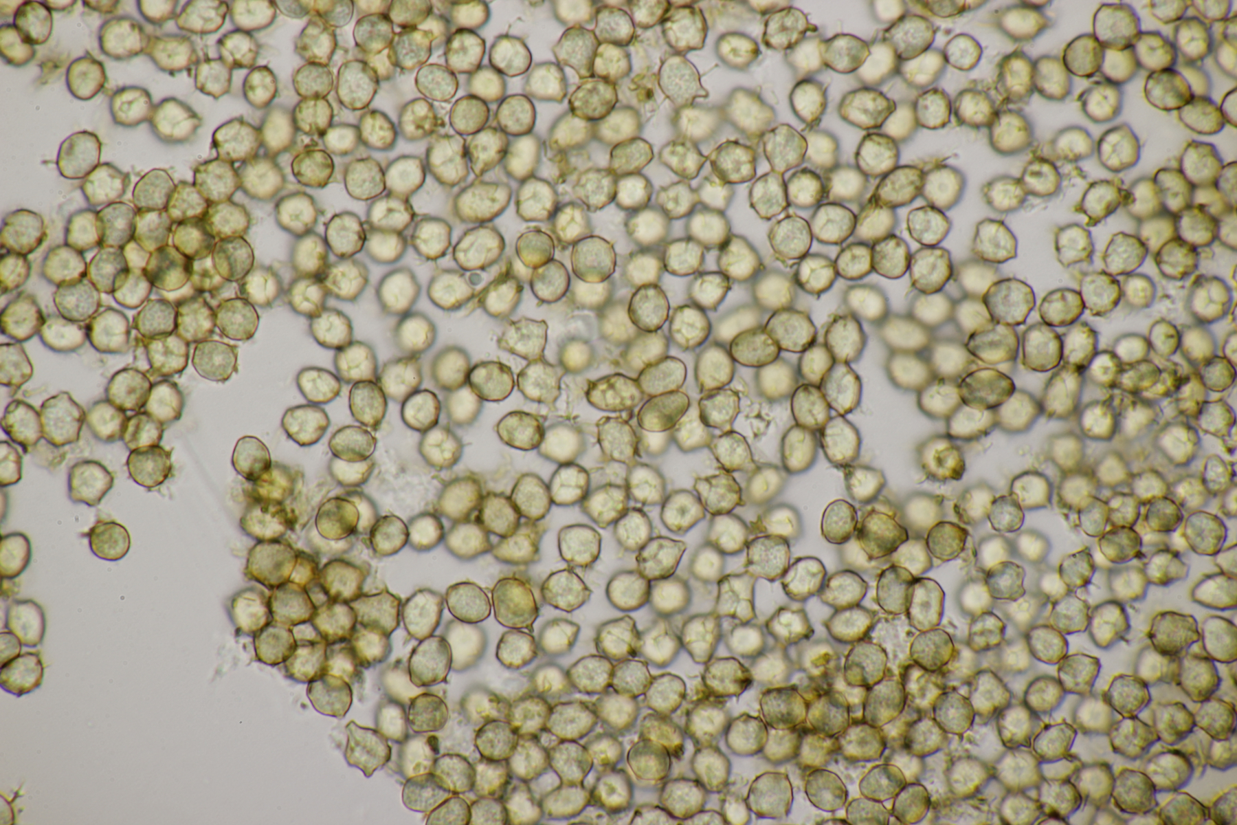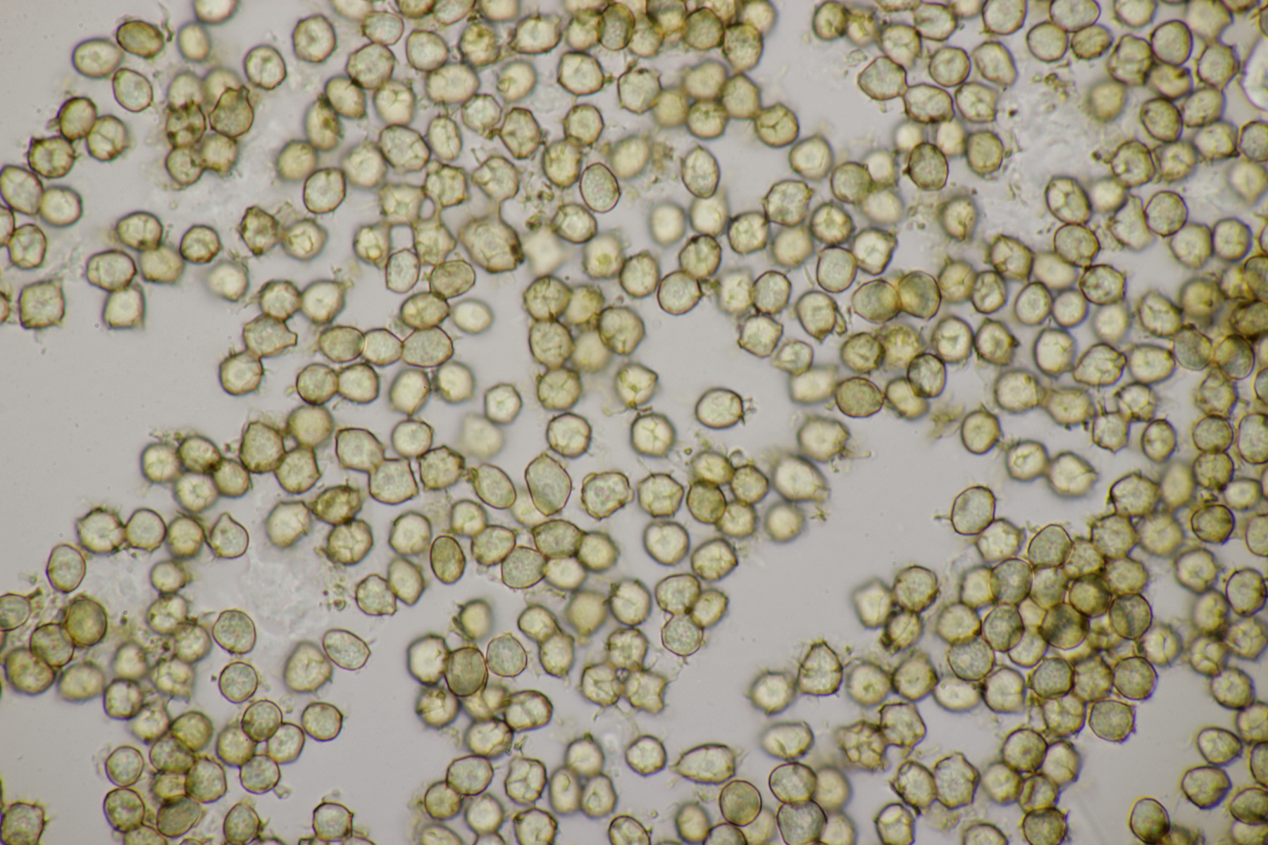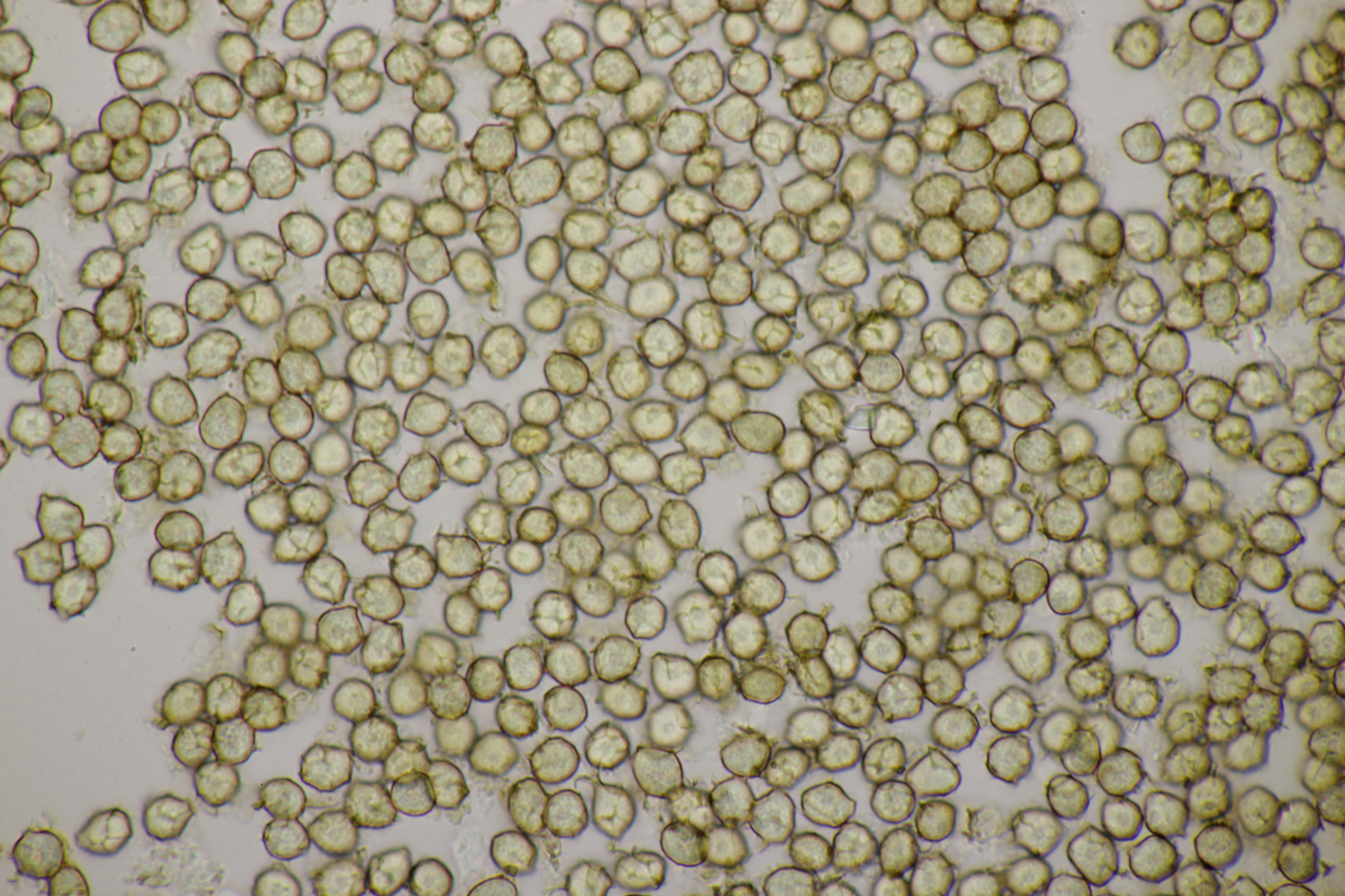 2. Direkt neben den Hemileccinums aus Teil 1 lag ein kleiner Ast mit dem Cythus striatus von oben. Da Karl mir am Vortag schrieb, außer den drei Röhrlingen gäbe es im Stadtwald aktuell keine Großpilze, wollte ich natürlich das Gegenteil beweisen und nahm den Ast um ihn etwas besser ins Licht zu rücken. Dabei fiel mir dann auf der Unterseite ein freudig orange-farbener Belag auf. Der erste Gedanke an eine Tomentella hat sich dann auch mikroskopisch bestätigt. Sporengröße (7.8+-0.5) µm x (6.0+-0.5) µm, Sporen unregelmäßig gelappt, Hyphen mit Schnallen, dünnwandig, schmal. Alle Mikrobilder in KOH, d.h. keine cyanescenten Elemente vorhanden. Eventuell Tomentella umbrinospora?