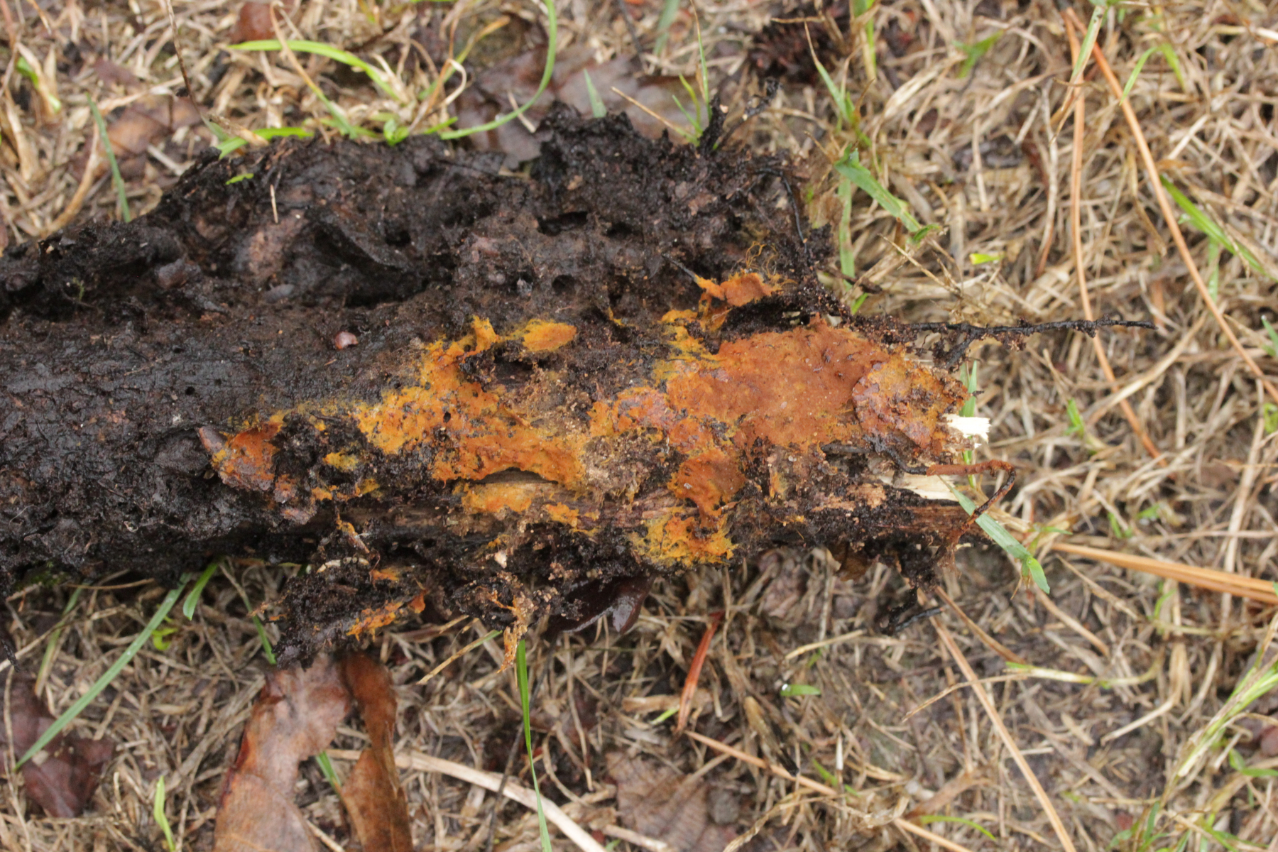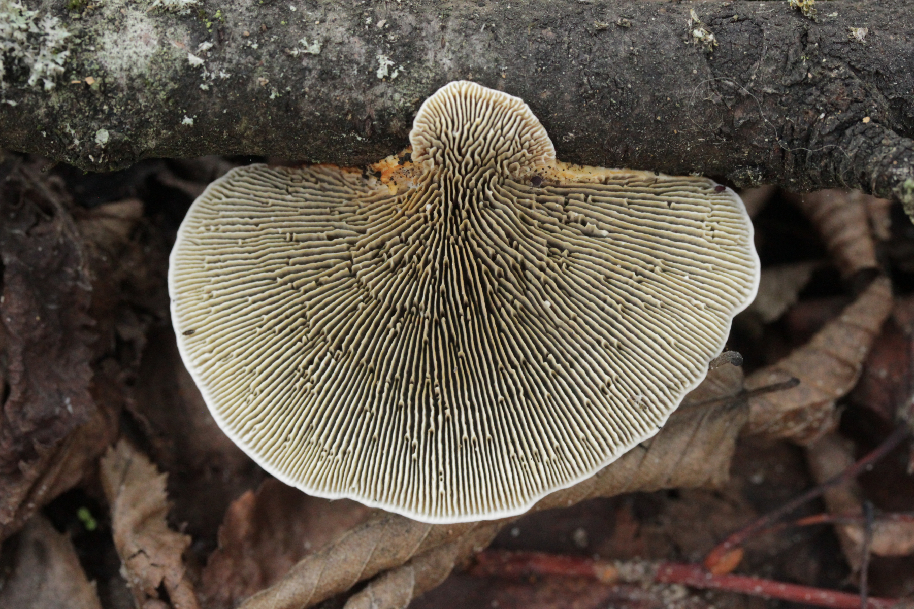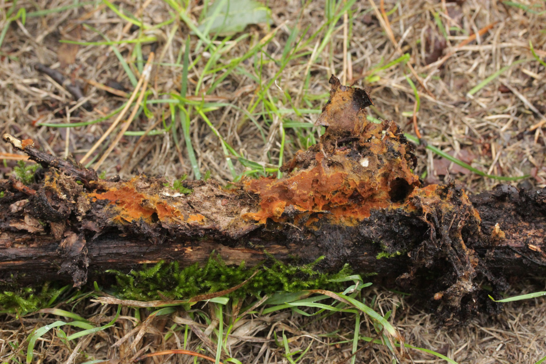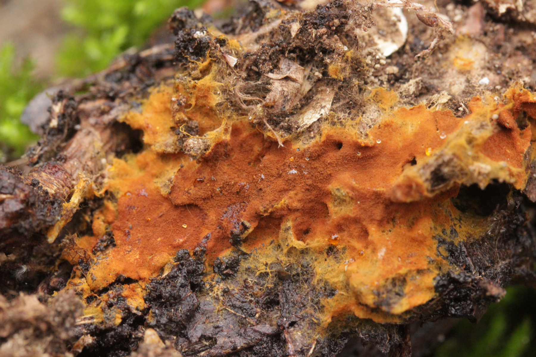 2. Direkt neben den Hemileccinums aus Teil 1 lag ein kleiner Ast mit dem Cythus striatus von oben. Da Karl mir am Vortag schrieb, außer den drei Röhrlingen gäbe es im Stadtwald aktuell keine Großpilze, wollte ich natürlich das Gegenteil beweisen und nahm den Ast um ihn etwas besser ins Licht zu rücken. Dabei fiel mir dann auf der Unterseite ein freudig orange-farbener Belag auf. Der erste Gedanke an eine Tomentella hat sich dann auch mikroskopisch bestätigt. Sporengröße (7.8+-0.5) µm x (6.0+-0.5) µm, Sporen unregelmäßig gelappt, Hyphen mit Schnallen, dünnwandig, schmal. Alle Mikrobilder in KOH, d.h. keine cyanescenten Elemente vorhanden. Eventuell Tomentella umbrinospora?