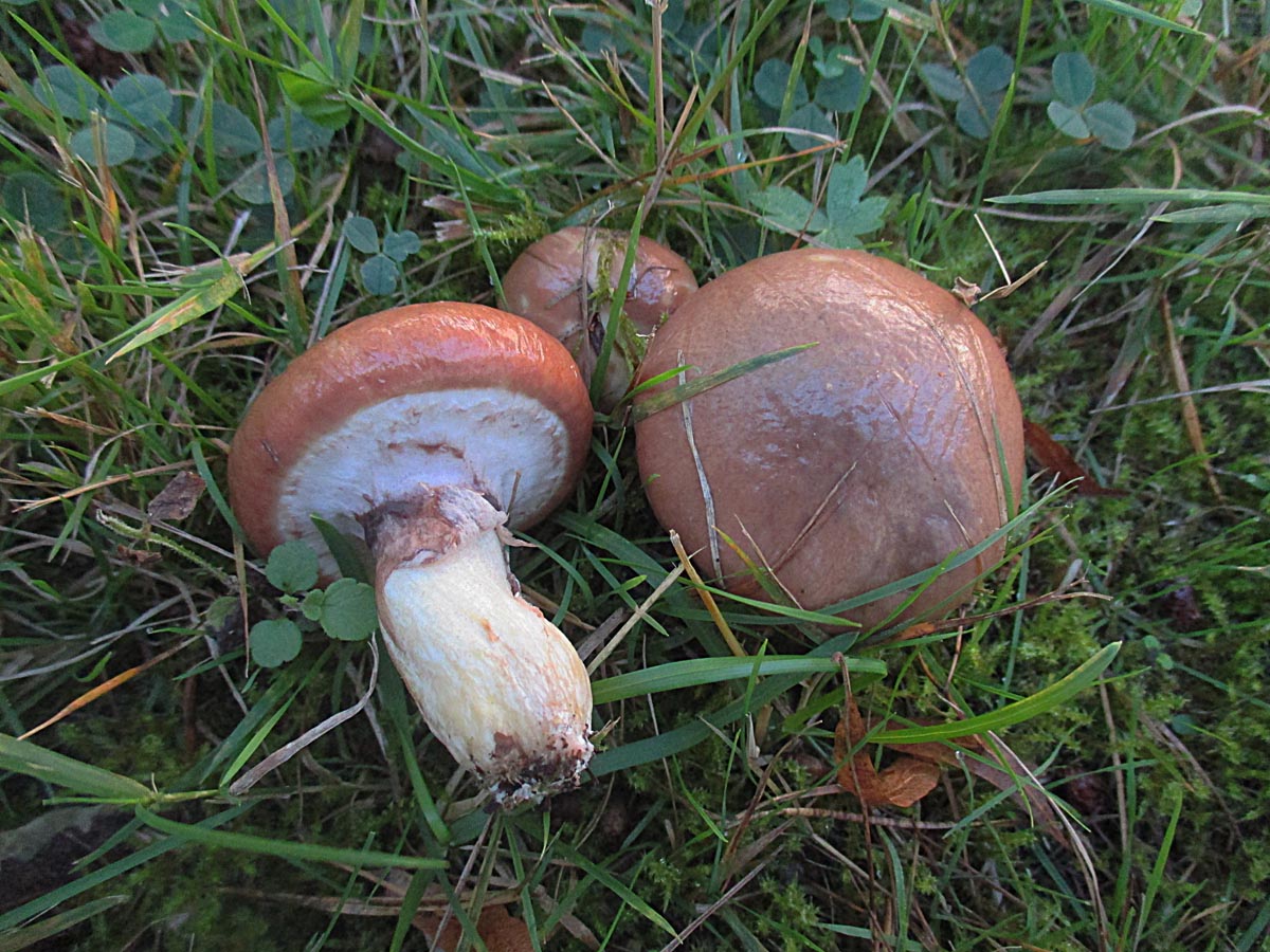 Flockis (Neoboletus erythropus), Goldröhrlinge (Suillus grevillei), Butterpilze (Suillus luteus), Stattliche Rotfußröhrlinge (Xerocomellus pruinatus)