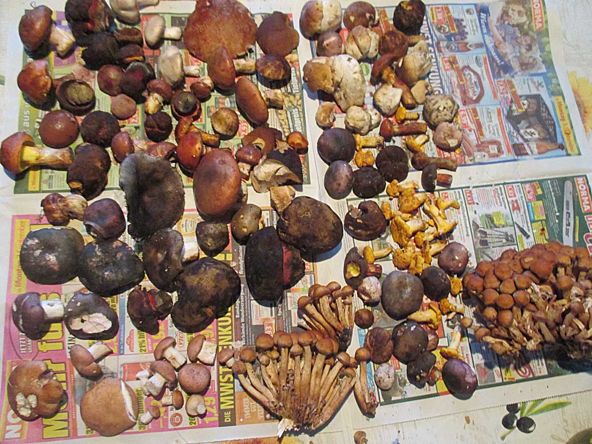 Birkenpilze (Leccinum scabrum), Pfifferlinge (Cantharellus cibarius) und Würzige Tellerlinge (Clitopilus geminus), die mir übrigens nicht geschmeckt haben.