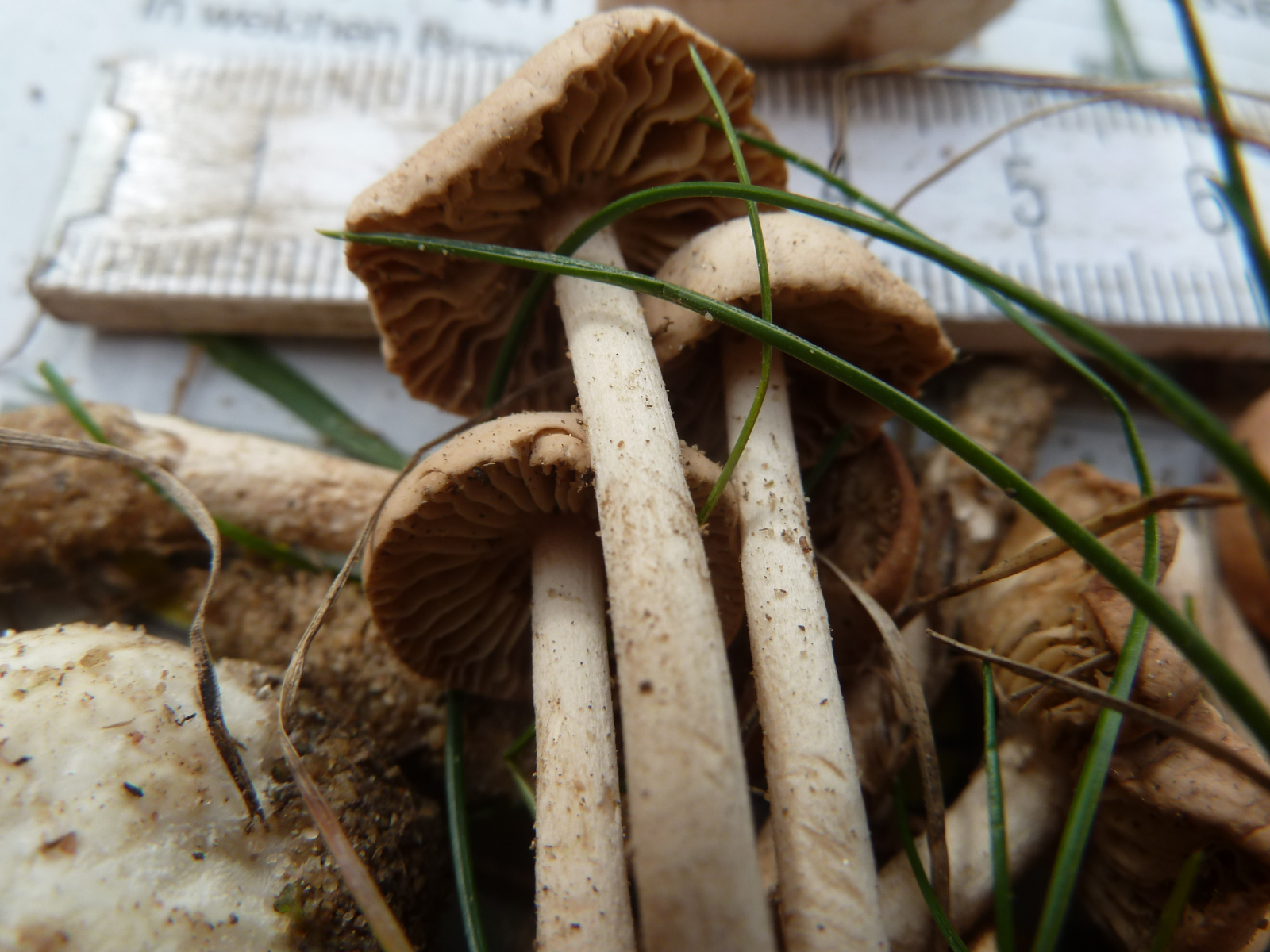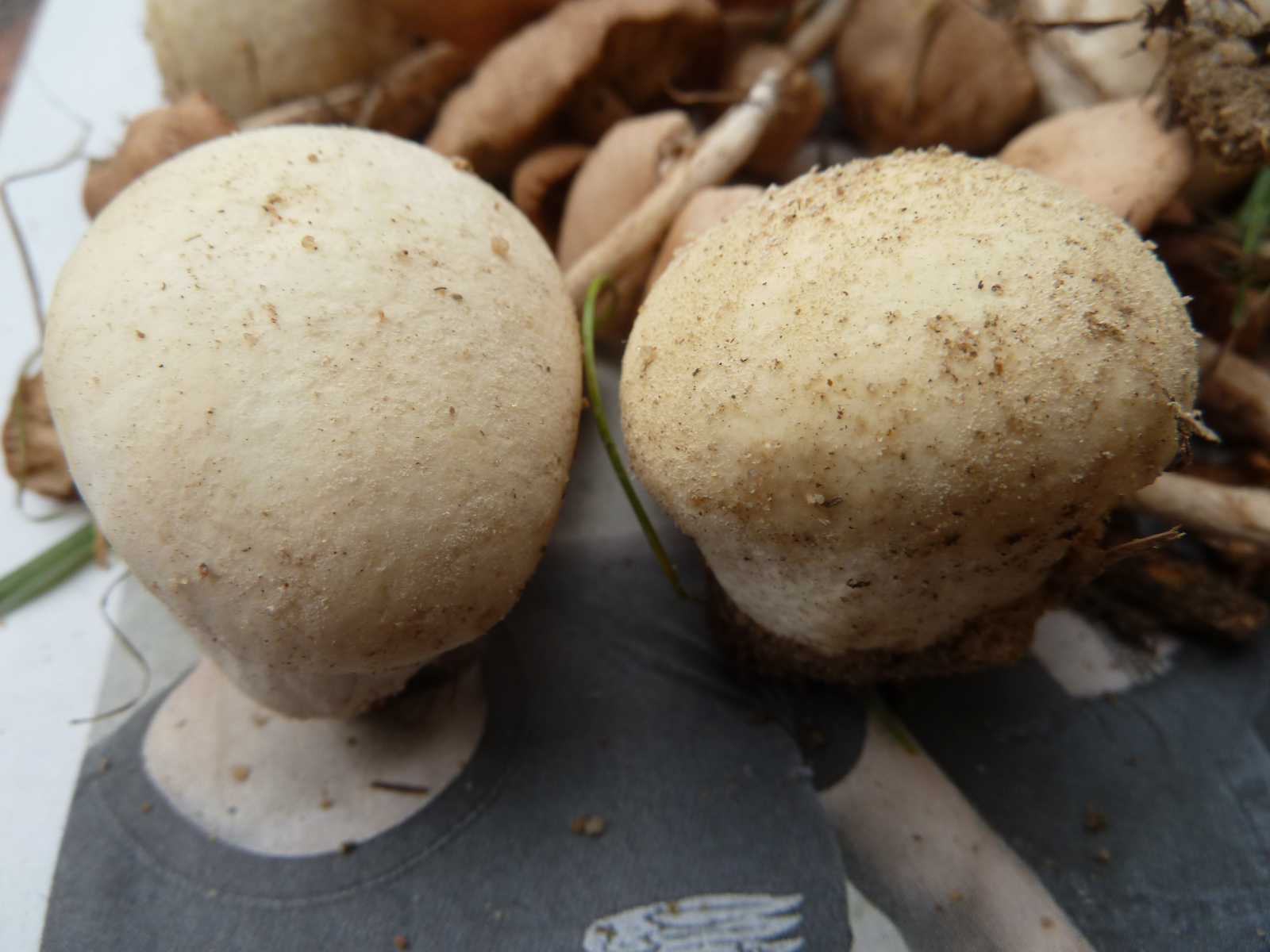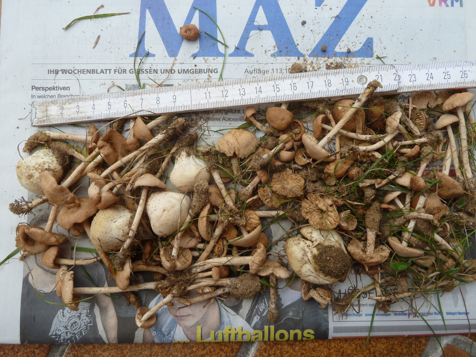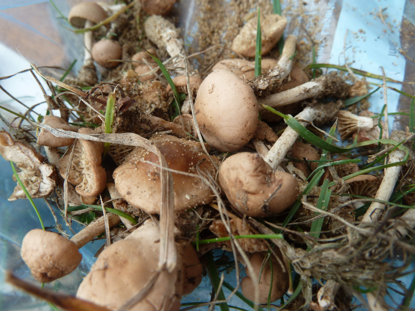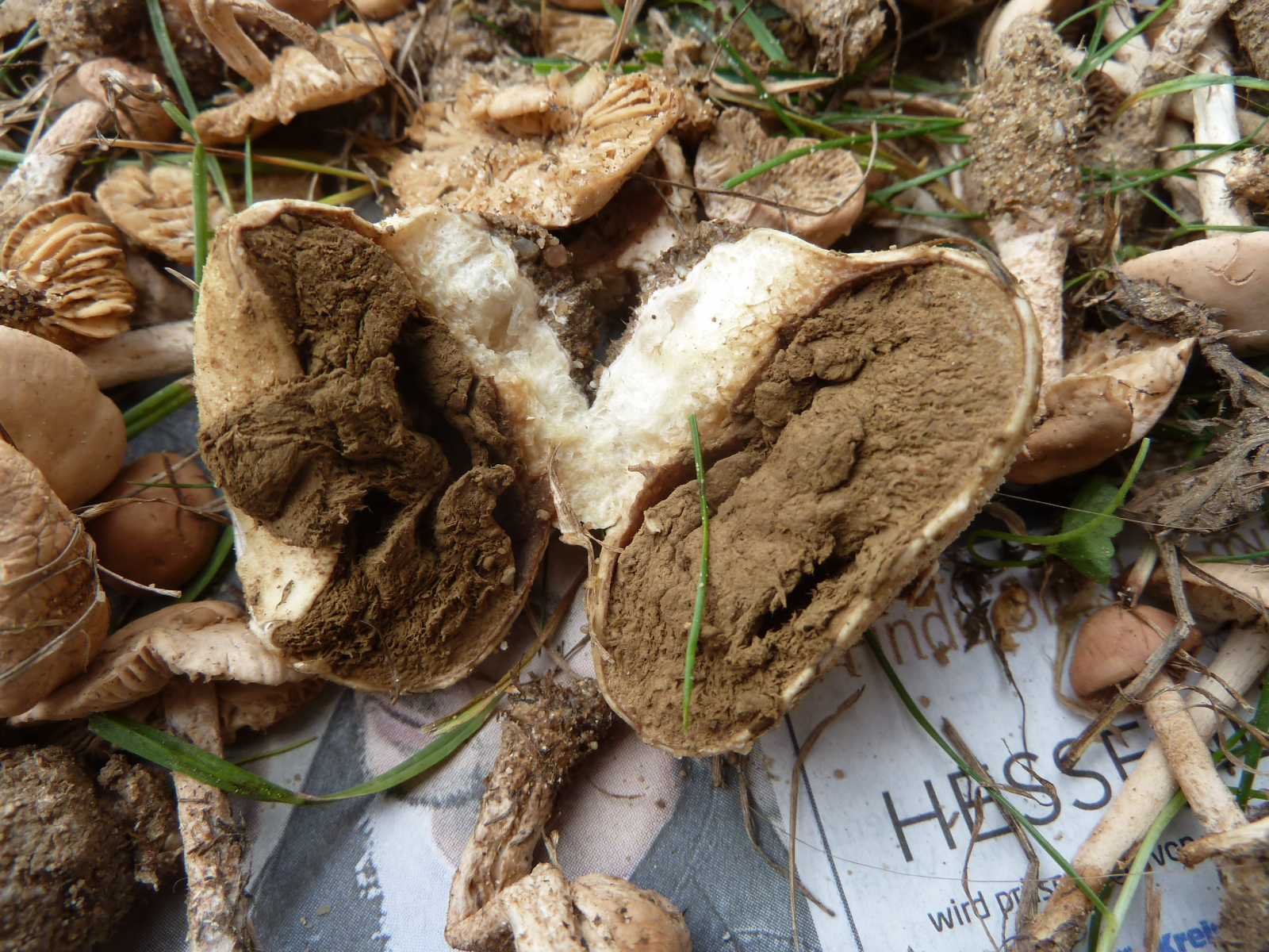 Soweit ich das überblicken kann, sind das neben den paar Stäublingen wohl Feld- bzw. Nelkenschwindlinge gewesen, der Bittermandel-Geruch ist noch deutlich wahrnehmbar. Richtige Giftpilze kann ich in diesen Resten nicht entdecken, allerdings könnte sich dazwischen durchaus eine Inocybe verstecken.