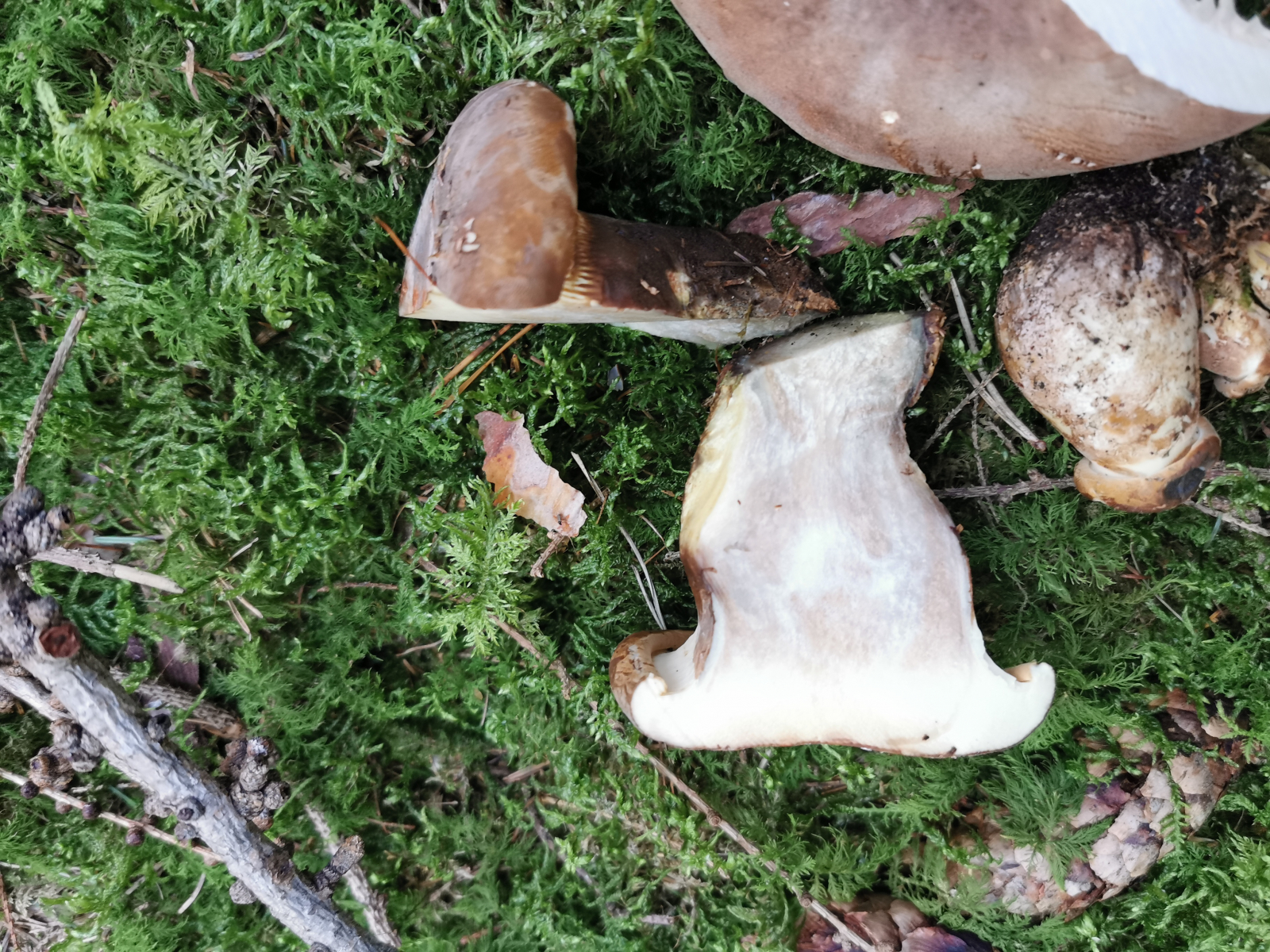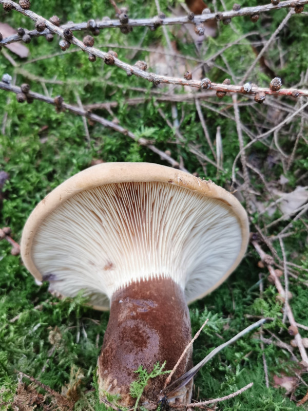 Heute waren meine Frau und ich beim Pilzesammeln im Wald. Kurz zu unserem Hintergrund wir beide gingen bereits als Kinder mit unseren jeweiligen Eltern in den Wald um Pilze zu sammeln. Wir sammeln grundsätzlich nur Pilze die wir kennen. Heute jedoch begegneten wir einigen Exemplaren die wir zunächst für eine der Steinpilz Sorten vermuteten. Beim genaueren Betrachten machte uns jedoch der Stiel stutzig. Wir beide kannten die Pilze nicht. Kurzerhand schickte ich das Foto in meine Familien WhatsApp Gruppe mit der Bitte um Bestimmung. Leider konnte uns niemand sagen um was es sich für einen Pilz handelt. Darum habe ich mich hier registriert in der Hoffnung jemand vom Forum könne eventuell weiterhelfen bei der Bestimmung.