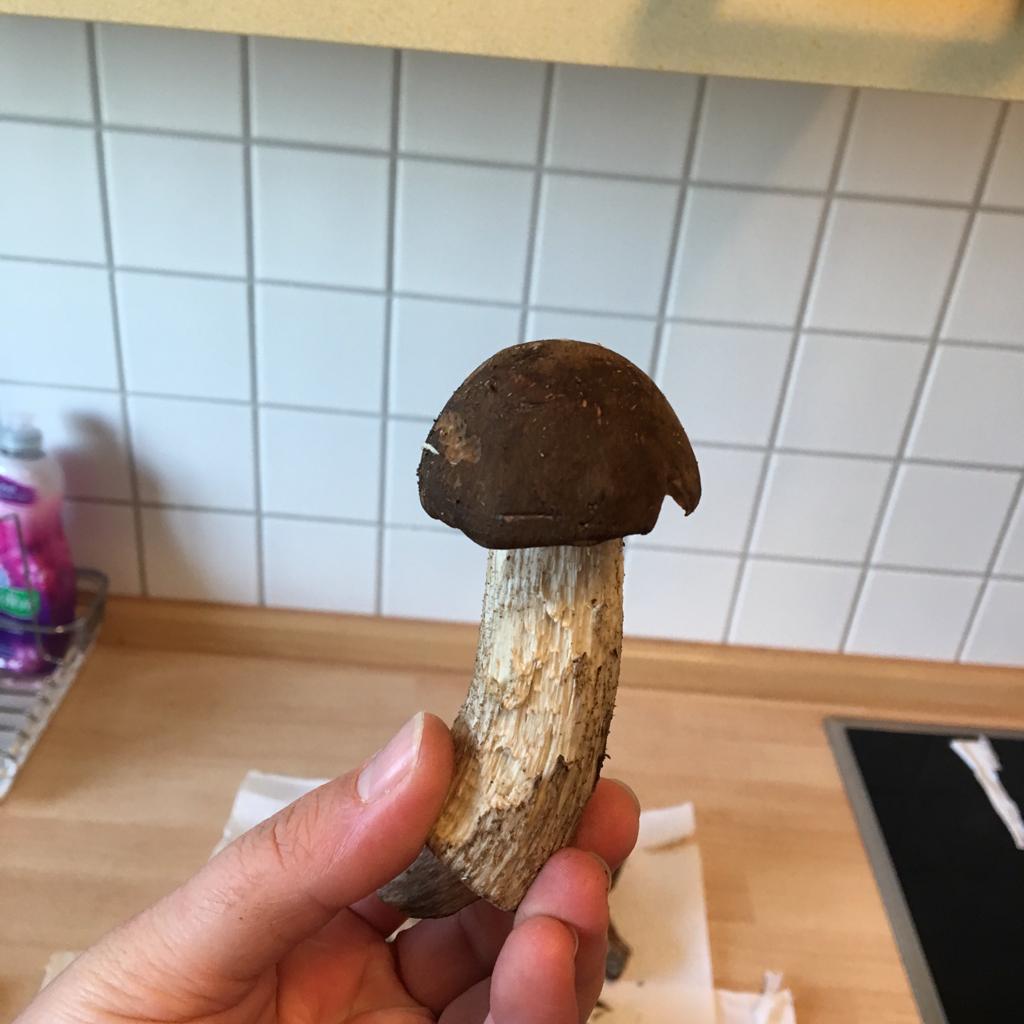 Heute waren meine Frau und ich beim Pilzesammeln im Wald. Kurz zu unserem Hintergrund wir beide gingen bereits als Kinder mit unseren jeweiligen Eltern in den Wald um Pilze zu sammeln. Wir sammeln grundsätzlich nur Pilze die wir kennen. Heute jedoch begegneten wir einigen Exemplaren die wir zunächst für eine der Steinpilz Sorten vermuteten. Beim genaueren Betrachten machte uns jedoch der Stiel stutzig. Wir beide kannten die Pilze nicht. Kurzerhand schickte ich das Foto in meine Familien WhatsApp Gruppe mit der Bitte um Bestimmung. Leider konnte uns niemand sagen um was es sich für einen Pilz handelt. Darum habe ich mich hier registriert in der Hoffnung jemand vom Forum könne eventuell weiterhelfen bei der Bestimmung.