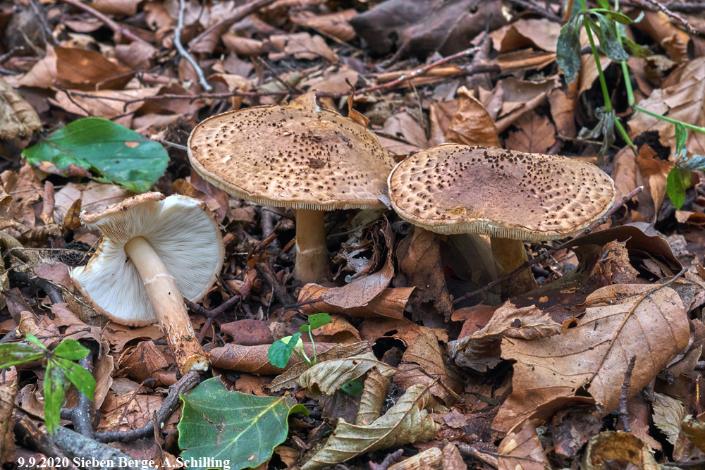 Durch die gelbe Hutfarbe und die violetten Verfärbung auffallend, bei Hainbuchen stehend