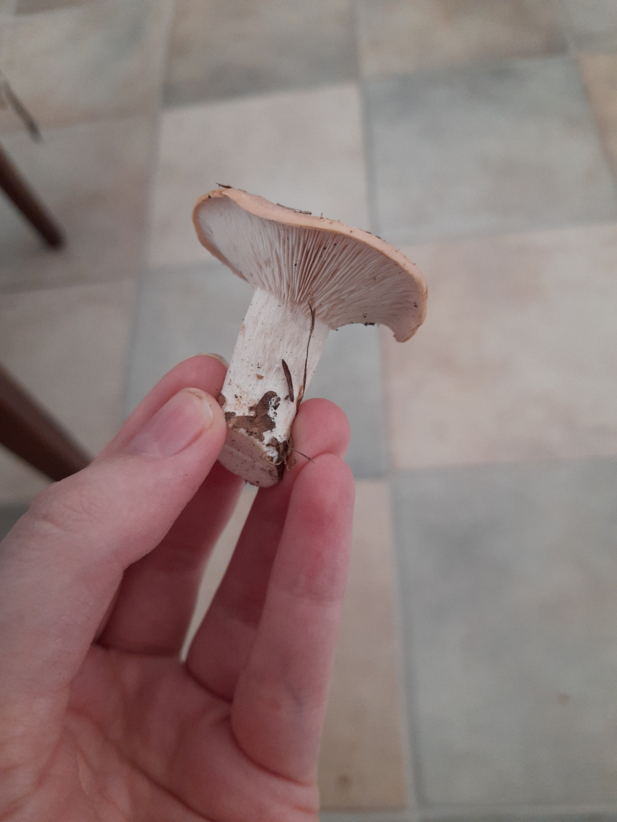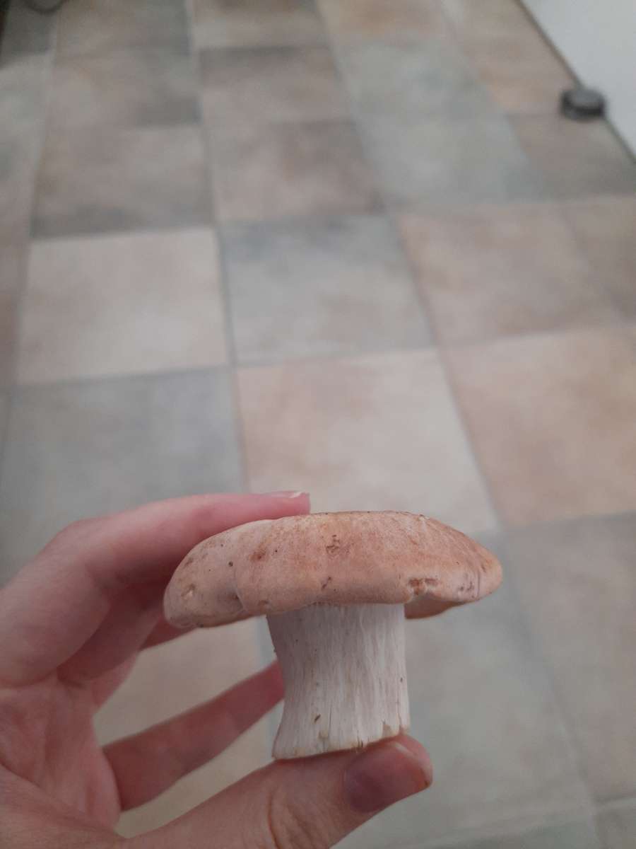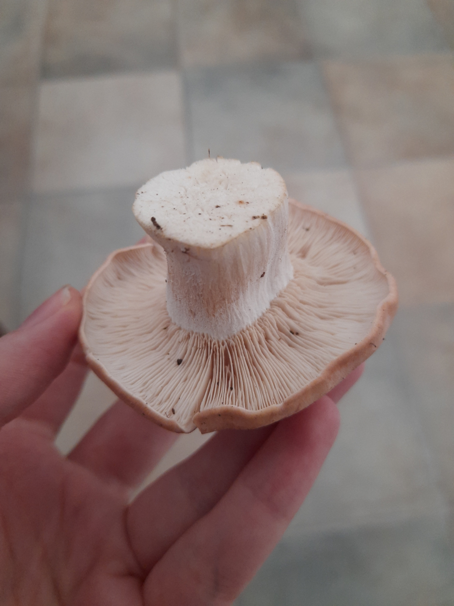 Nun habe ich auch einen Pilz gefunden, der vermeintlich ein Würziger Tellerling sein könnte. Er wuchs zusammen mit seinen Artgenossen auf einem großen Hügel (sieht aus, wie aufgeschüttet) am Wegrand. Dieser Hügel steht zwischen einer alten Eiche und Kiefern, also Mischwald. Ich habe den Pilz nur dort finden können. Ich habe so einiges getestet, er riecht sehr pilzig, ob man das schon als würzig bezeichnen kann, weiß ich nicht. Die Jungen Pilze sind noch sehr hell von den Lamellen, die alten etwas dunkler. Der Jüngste hat noch gar keine Lamellen ausgebildet, da trifft der Hut quasi sofort auf den Stiel. Die Stiele sind auch alle weiß, dick und mittellang mit einer holzigen Musterung, sieht etwas faserig aus, ist aber glatt. Die Huthaut lässt sich nicht abziehen und die Lamellen lösen sich leicht. Die Hüte verändern die Farbe nicht, wenn sie feucht werden, werden auch nicht schleimig. Sie sind hellbraun, ein bissl rosa grau, aber mehr braun.