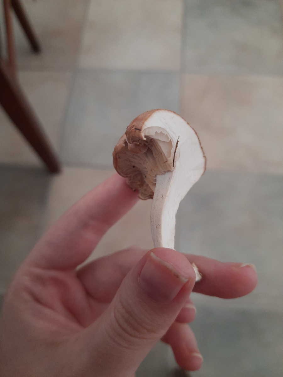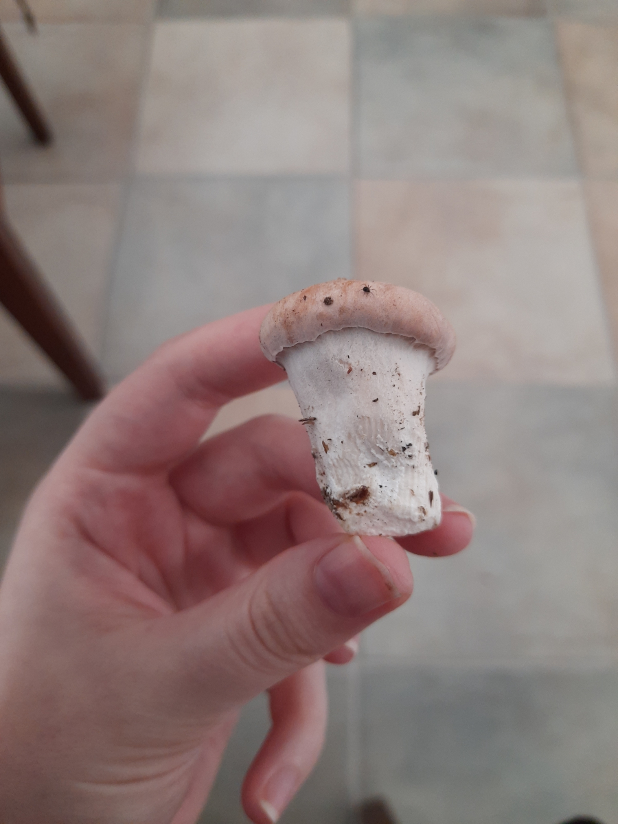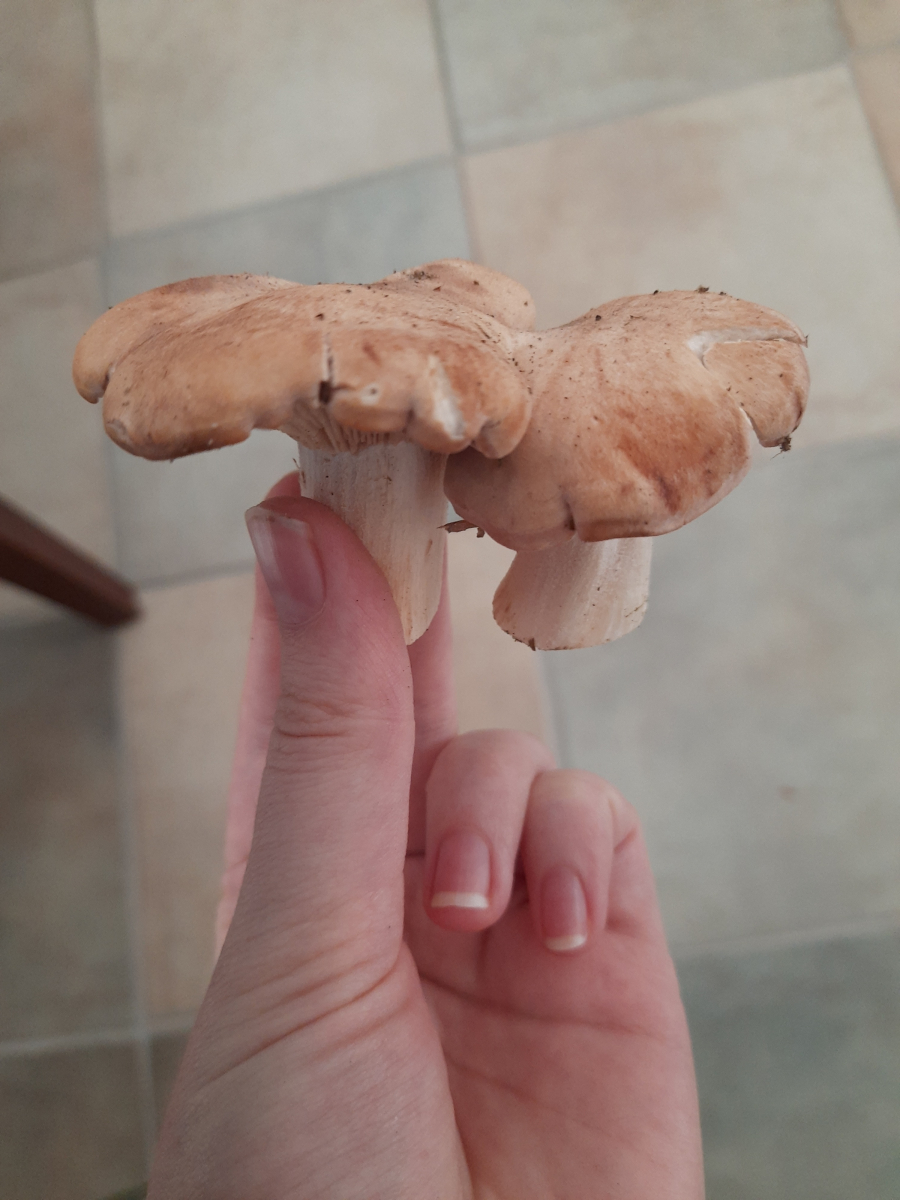 Nun habe ich auch einen Pilz gefunden, der vermeintlich ein Würziger Tellerling sein könnte. Er wuchs zusammen mit seinen Artgenossen auf einem großen Hügel (sieht aus, wie aufgeschüttet) am Wegrand. Dieser Hügel steht zwischen einer alten Eiche und Kiefern, also Mischwald. Ich habe den Pilz nur dort finden können. Ich habe so einiges getestet, er riecht sehr pilzig, ob man das schon als würzig bezeichnen kann, weiß ich nicht. Die Jungen Pilze sind noch sehr hell von den Lamellen, die alten etwas dunkler. Der Jüngste hat noch gar keine Lamellen ausgebildet, da trifft der Hut quasi sofort auf den Stiel. Die Stiele sind auch alle weiß, dick und mittellang mit einer holzigen Musterung, sieht etwas faserig aus, ist aber glatt. Die Huthaut lässt sich nicht abziehen und die Lamellen lösen sich leicht. Die Hüte verändern die Farbe nicht, wenn sie feucht werden, werden auch nicht schleimig. Sie sind hellbraun, ein bissl rosa grau, aber mehr braun.