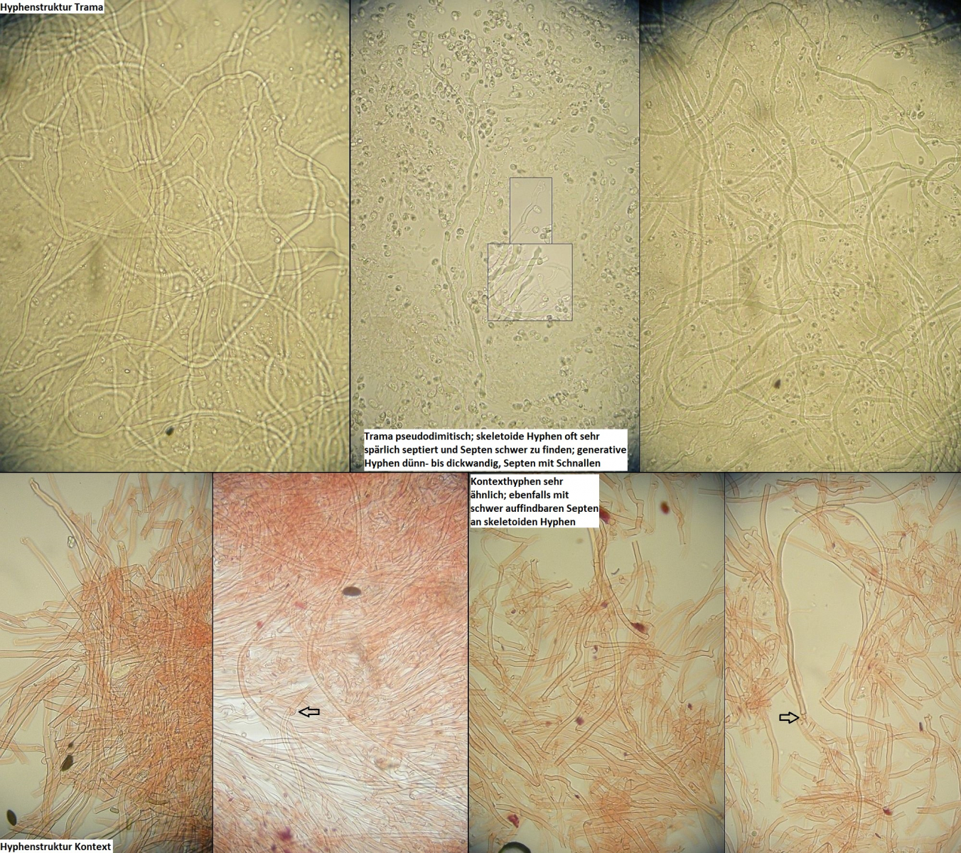 die skeletoiden Hyphen haben tatsächlich erkennbare Septen. Das habe ich nicht als monomitisch berücksichtigt und bin beim Schlüsseln mit einem dimitischen Hyphensystem nicht weitergekommen.
