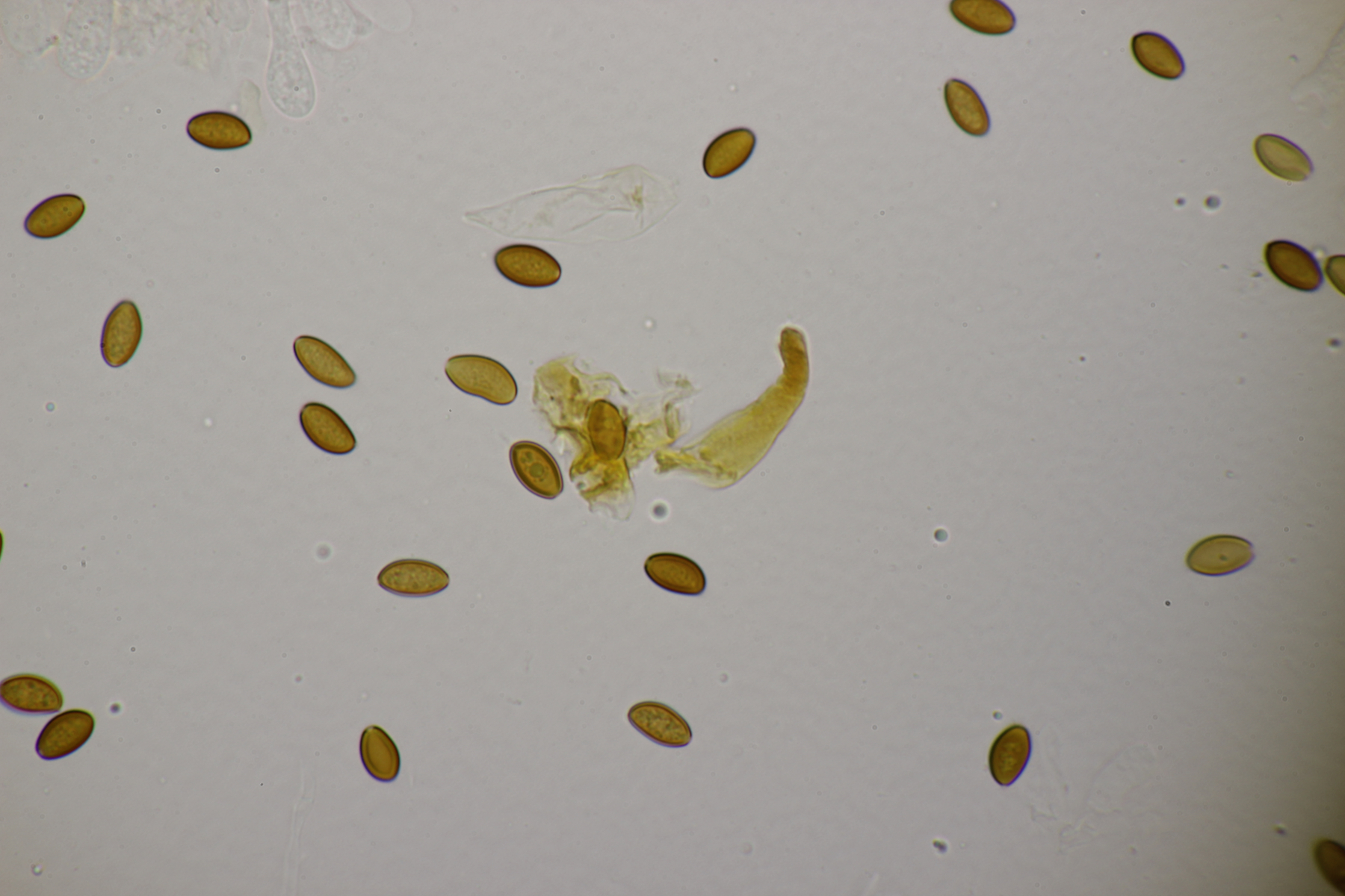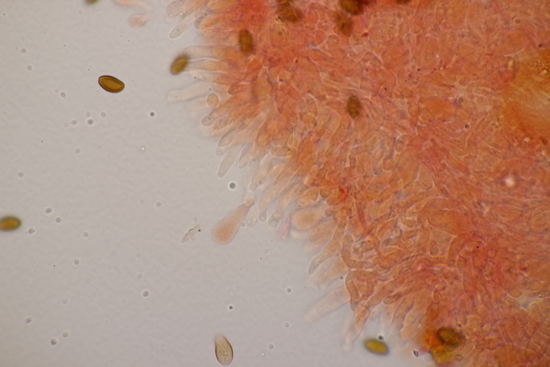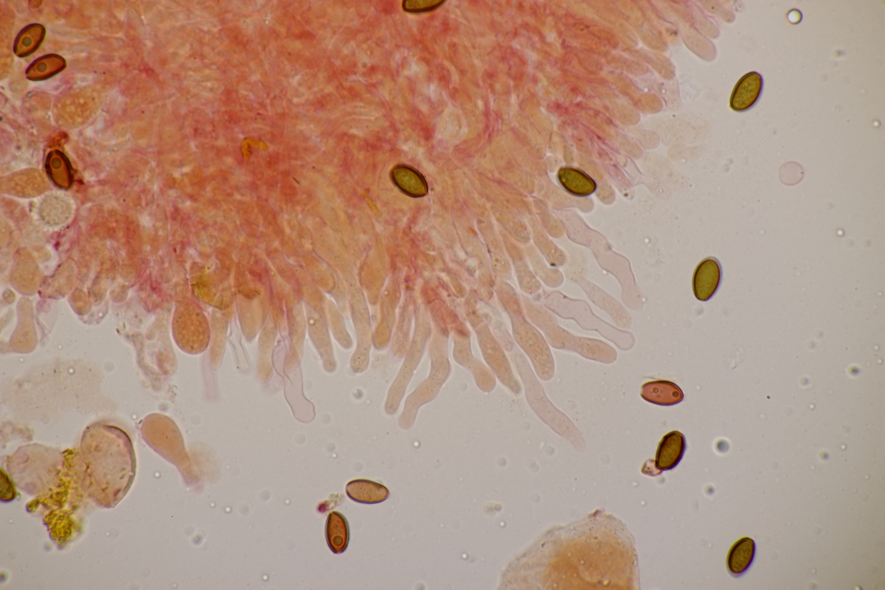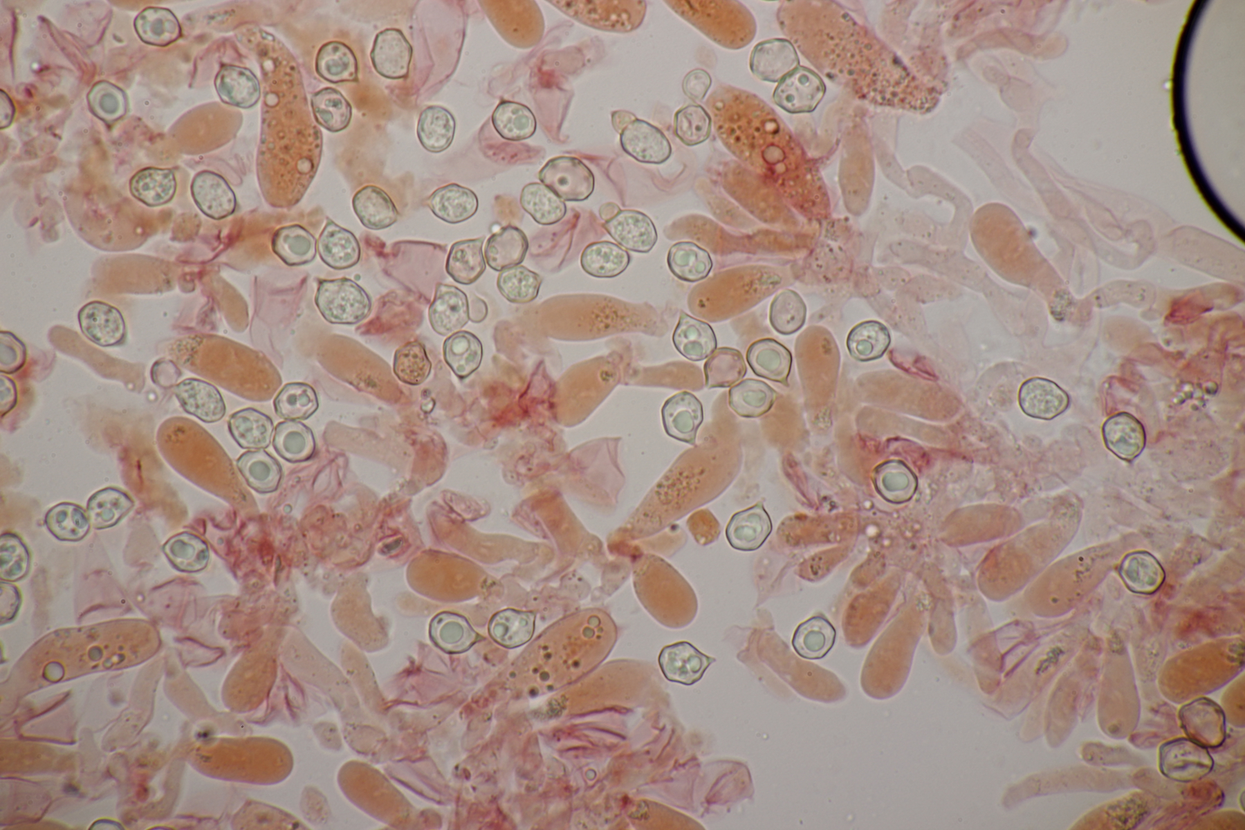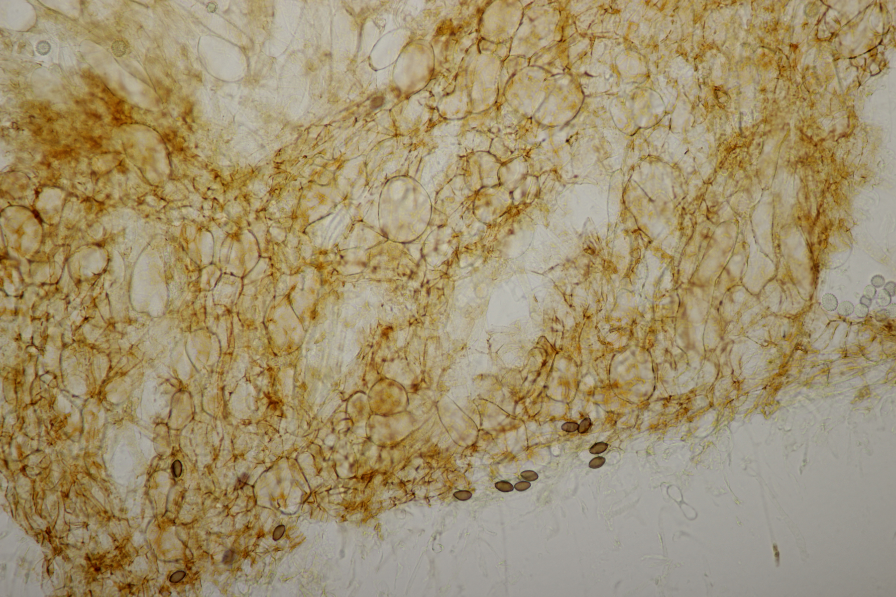 3. Ein Rötling auf der Wiese, der nächste Mykorrhiza-Partner mindestens 10 m entfernt (Fagus und Prunus). Geruch frisch mehlartig, zu Hause dann eher geruchslos. Basidien 4-sporig mit Basalschnalle, das Pigment der Huthaut würde ich für intrazellulär halten, keine Cheilo- und Caulozystiden gefunden. Sporen (10,6+-0,6) x (7,6+-0,4) µm, Q=1.4+-0.1 bzw. (9,4-12,0) x (6,7-8,3) µm, Q=1,2-1,6. Ich hatte auf FB schon mit Karls Hilfe etwas geschlüsselt, bin aber nie bei einer vernünftigen Option gelandet.