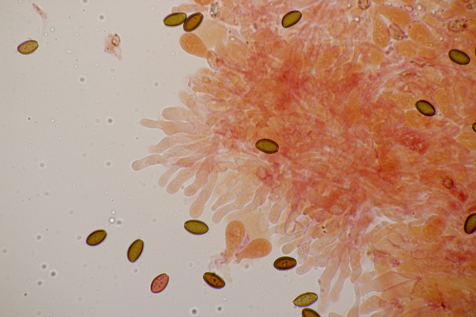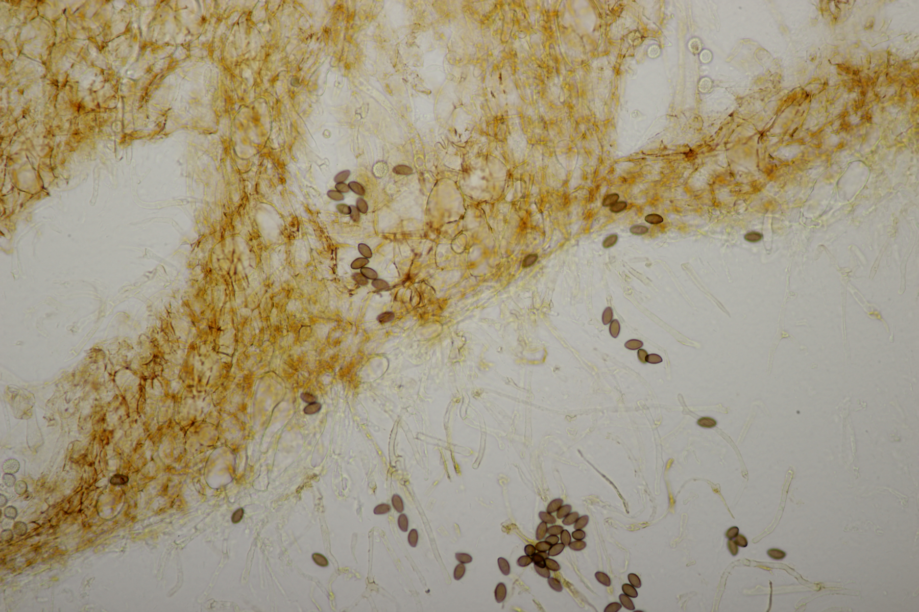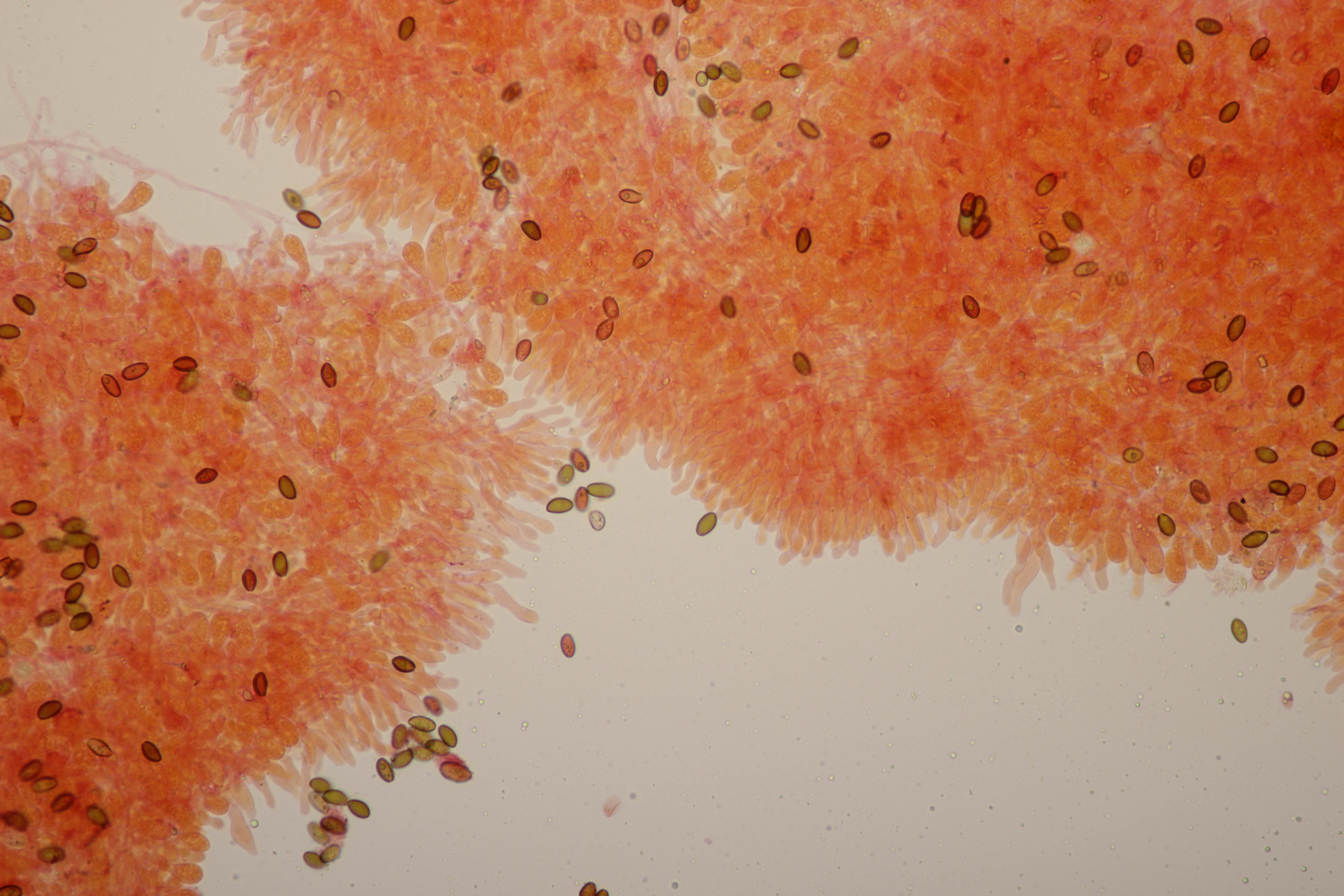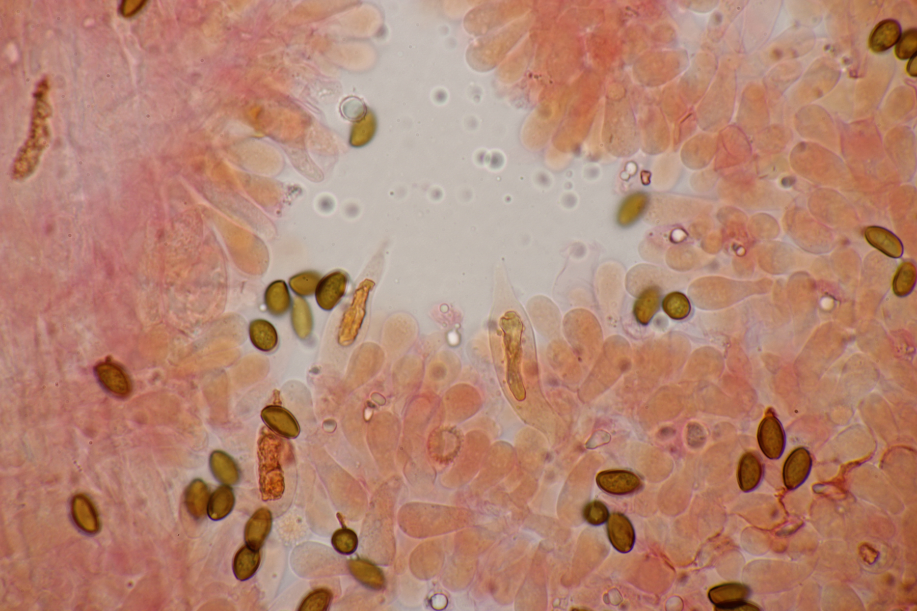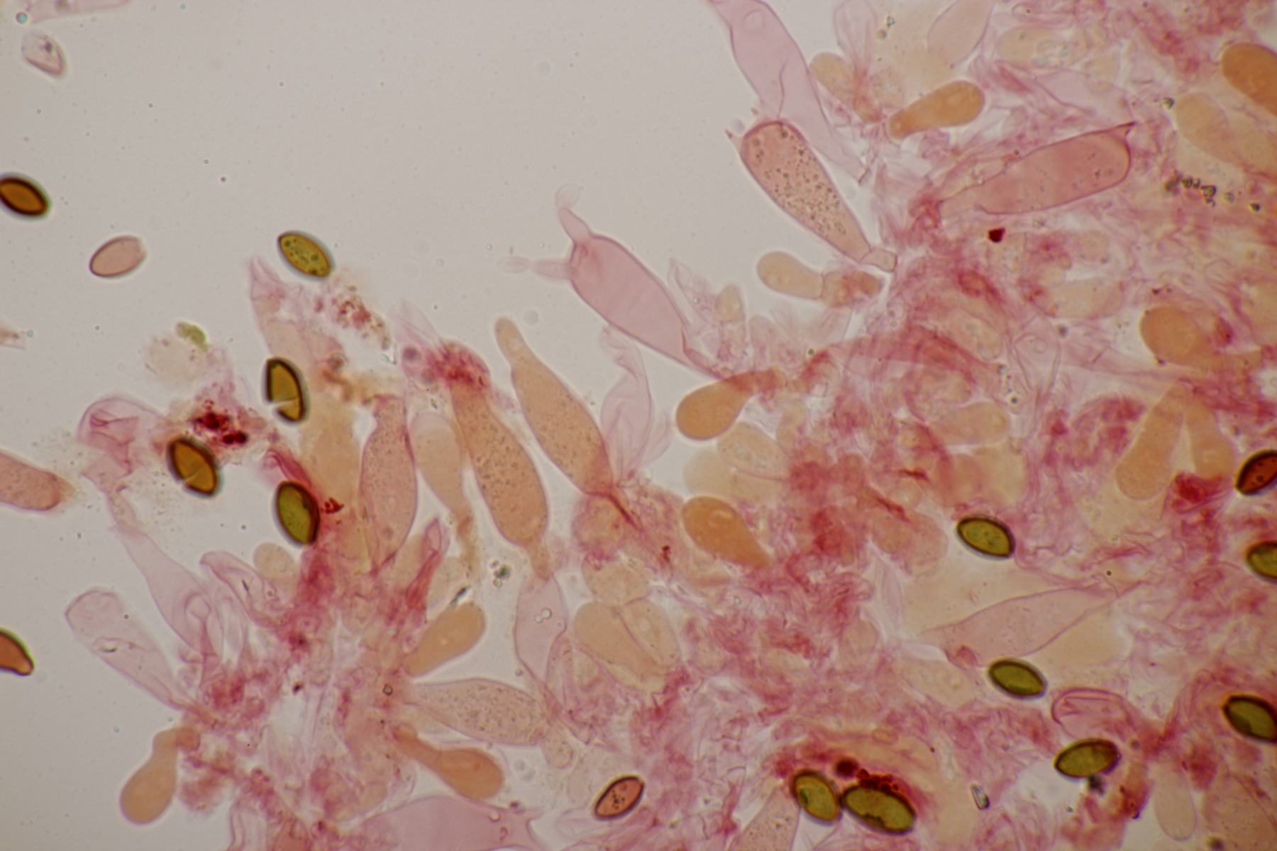 3. Ein Rötling auf der Wiese, der nächste Mykorrhiza-Partner mindestens 10 m entfernt (Fagus und Prunus). Geruch frisch mehlartig, zu Hause dann eher geruchslos. Basidien 4-sporig mit Basalschnalle, das Pigment der Huthaut würde ich für intrazellulär halten, keine Cheilo- und Caulozystiden gefunden. Sporen (10,6+-0,6) x (7,6+-0,4) µm, Q=1.4+-0.1 bzw. (9,4-12,0) x (6,7-8,3) µm, Q=1,2-1,6. Ich hatte auf FB schon mit Karls Hilfe etwas geschlüsselt, bin aber nie bei einer vernünftigen Option gelandet.