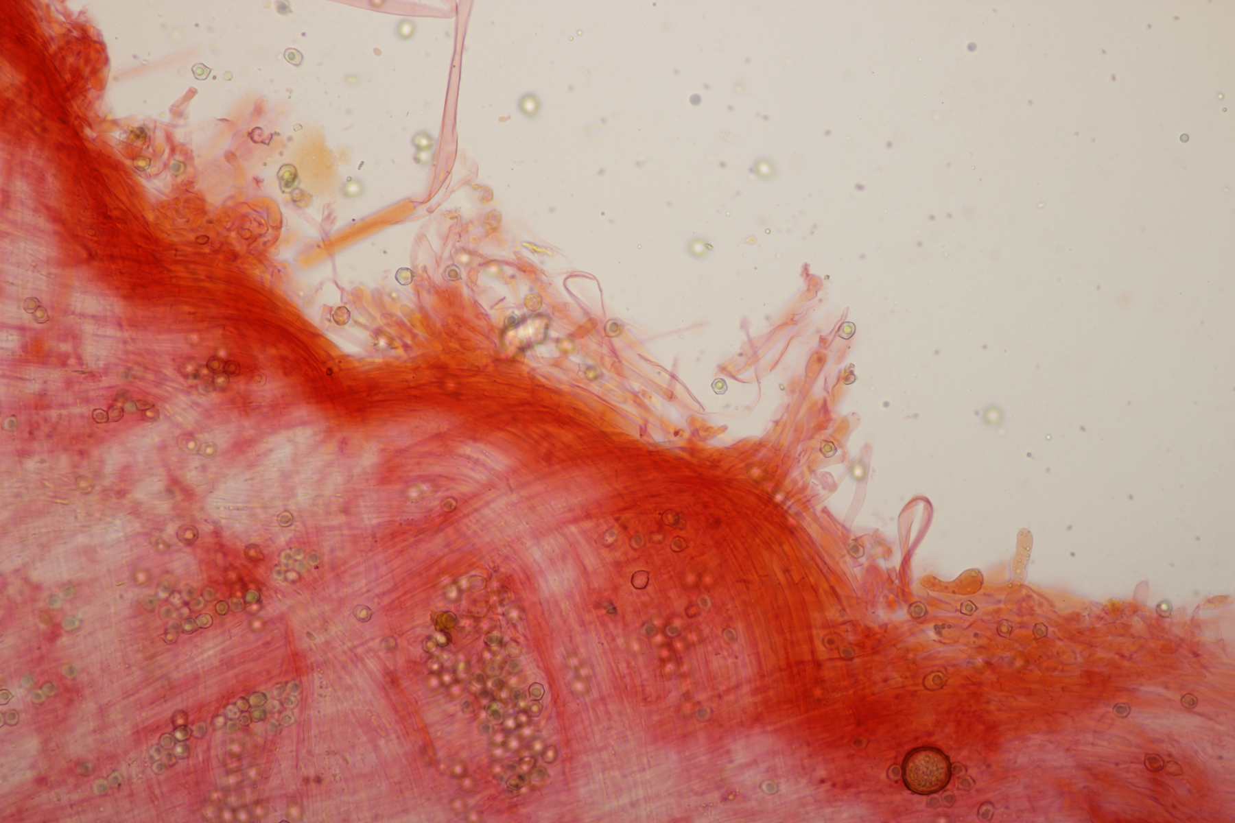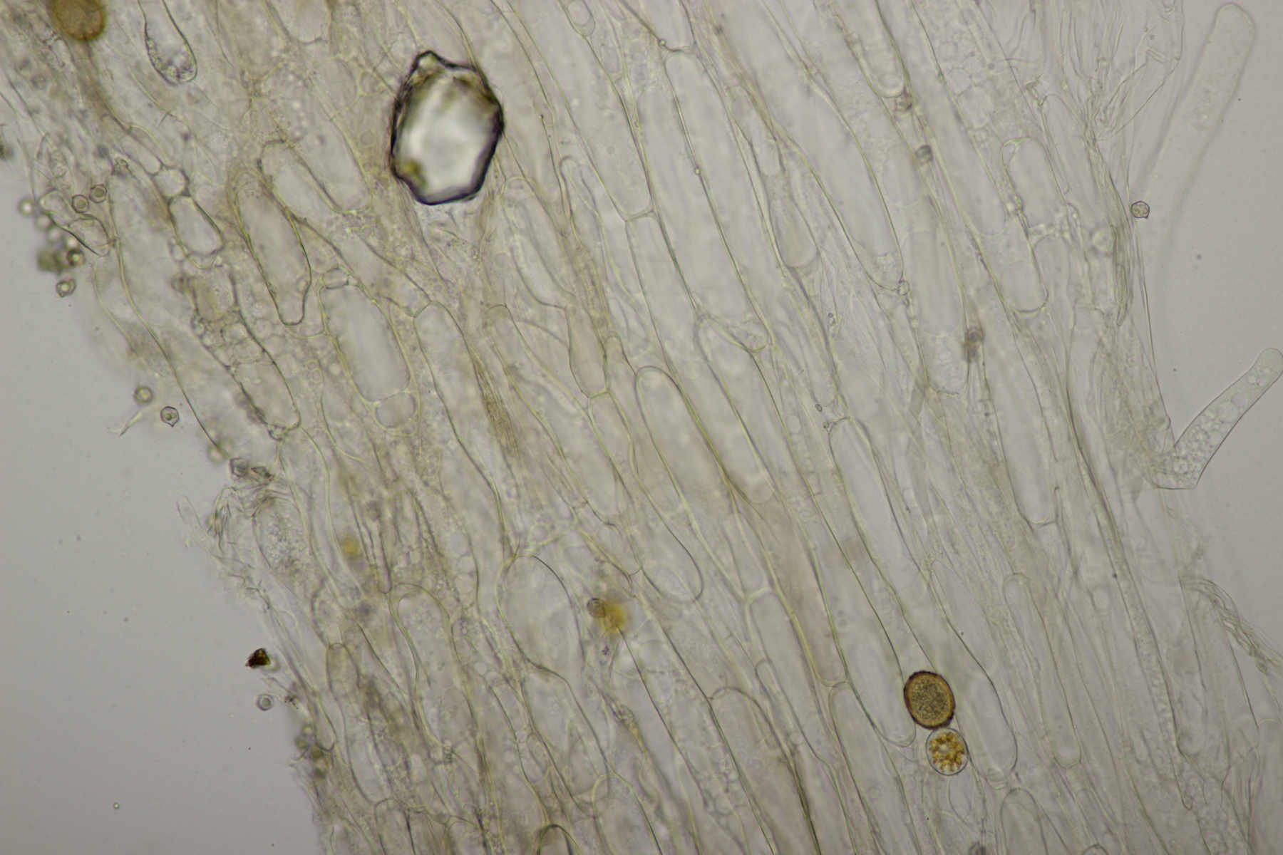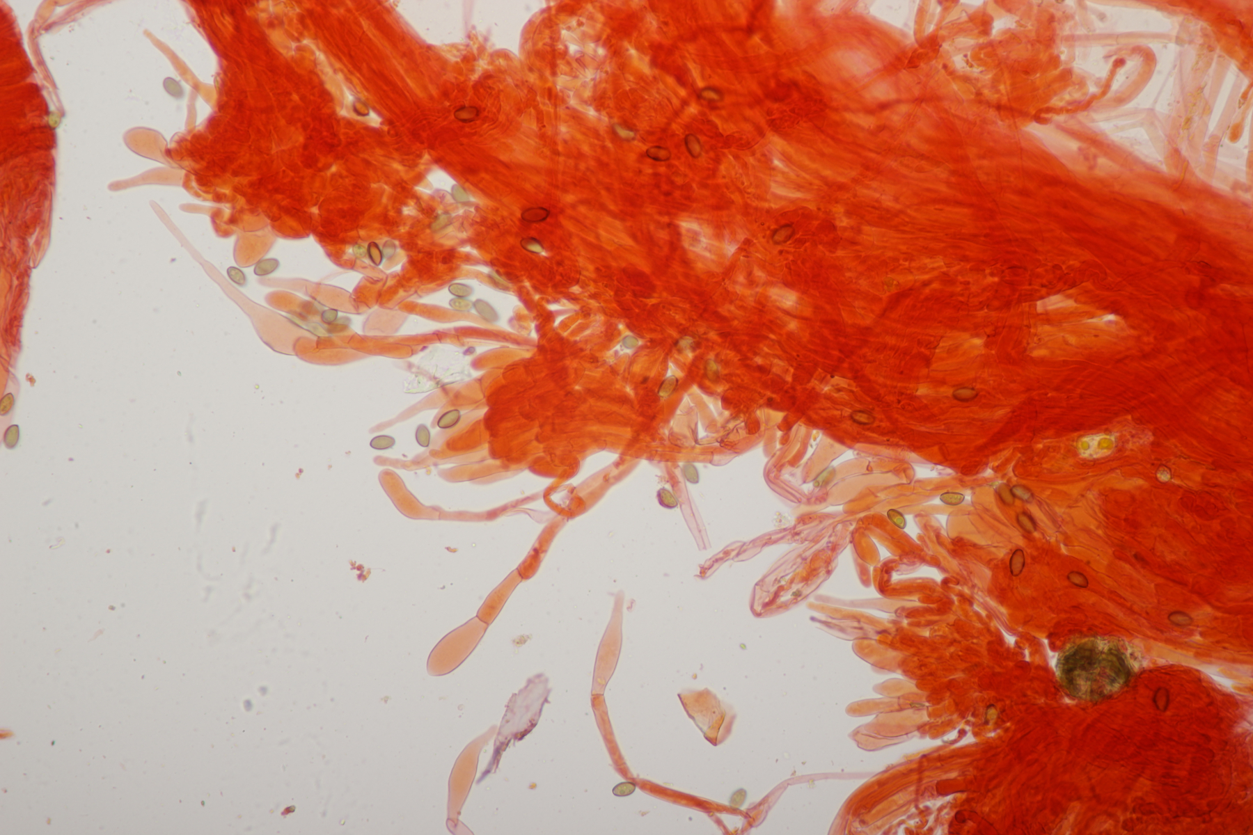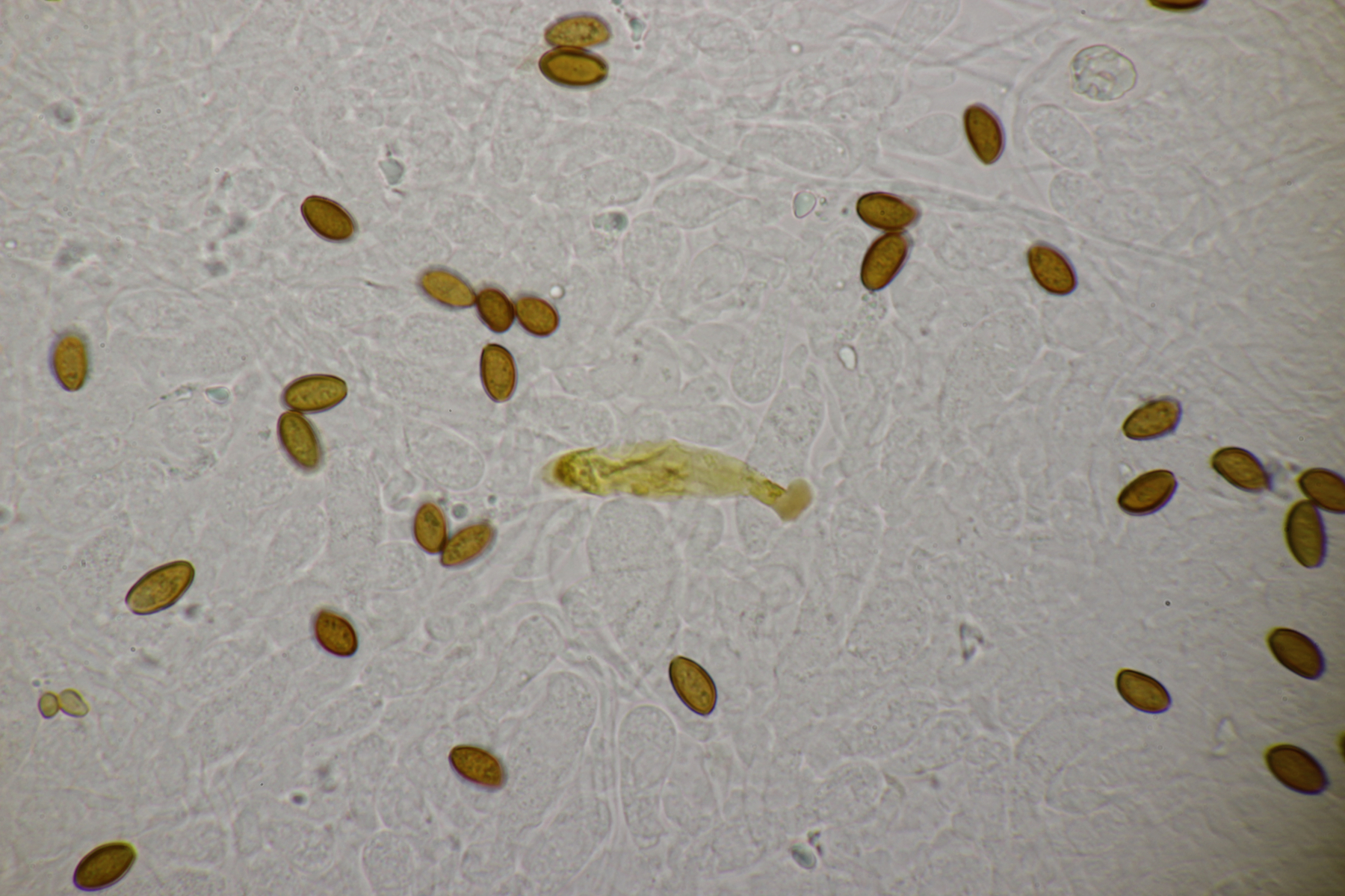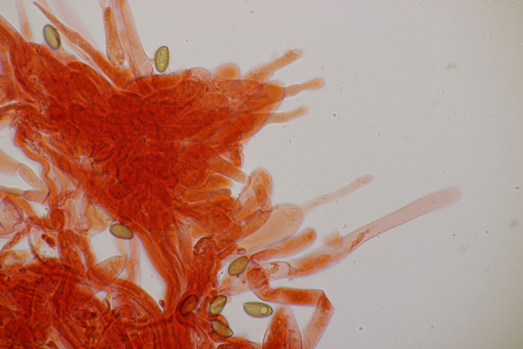 3. Ein Rötling auf der Wiese, der nächste Mykorrhiza-Partner mindestens 10 m entfernt (Fagus und Prunus). Geruch frisch mehlartig, zu Hause dann eher geruchslos. Basidien 4-sporig mit Basalschnalle, das Pigment der Huthaut würde ich für intrazellulär halten, keine Cheilo- und Caulozystiden gefunden. Sporen (10,6+-0,6) x (7,6+-0,4) µm, Q=1.4+-0.1 bzw. (9,4-12,0) x (6,7-8,3) µm, Q=1,2-1,6. Ich hatte auf FB schon mit Karls Hilfe etwas geschlüsselt, bin aber nie bei einer vernünftigen Option gelandet.