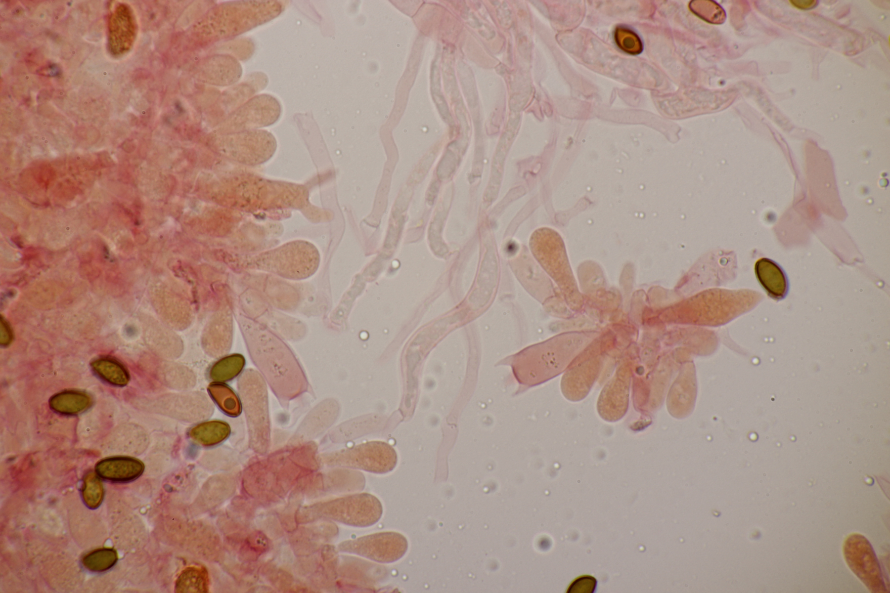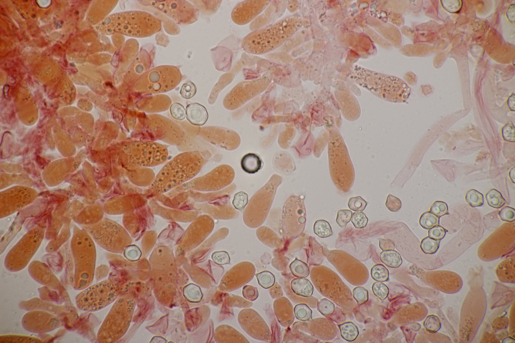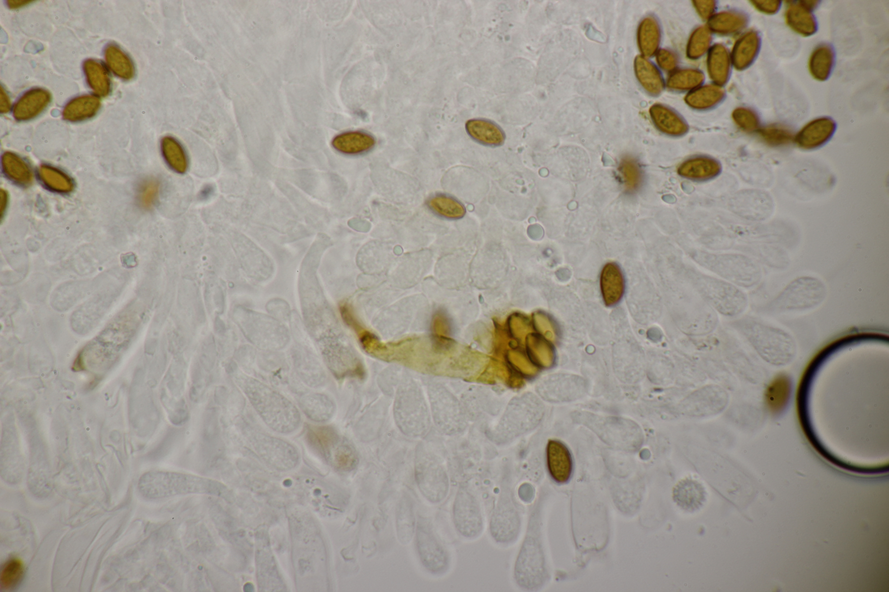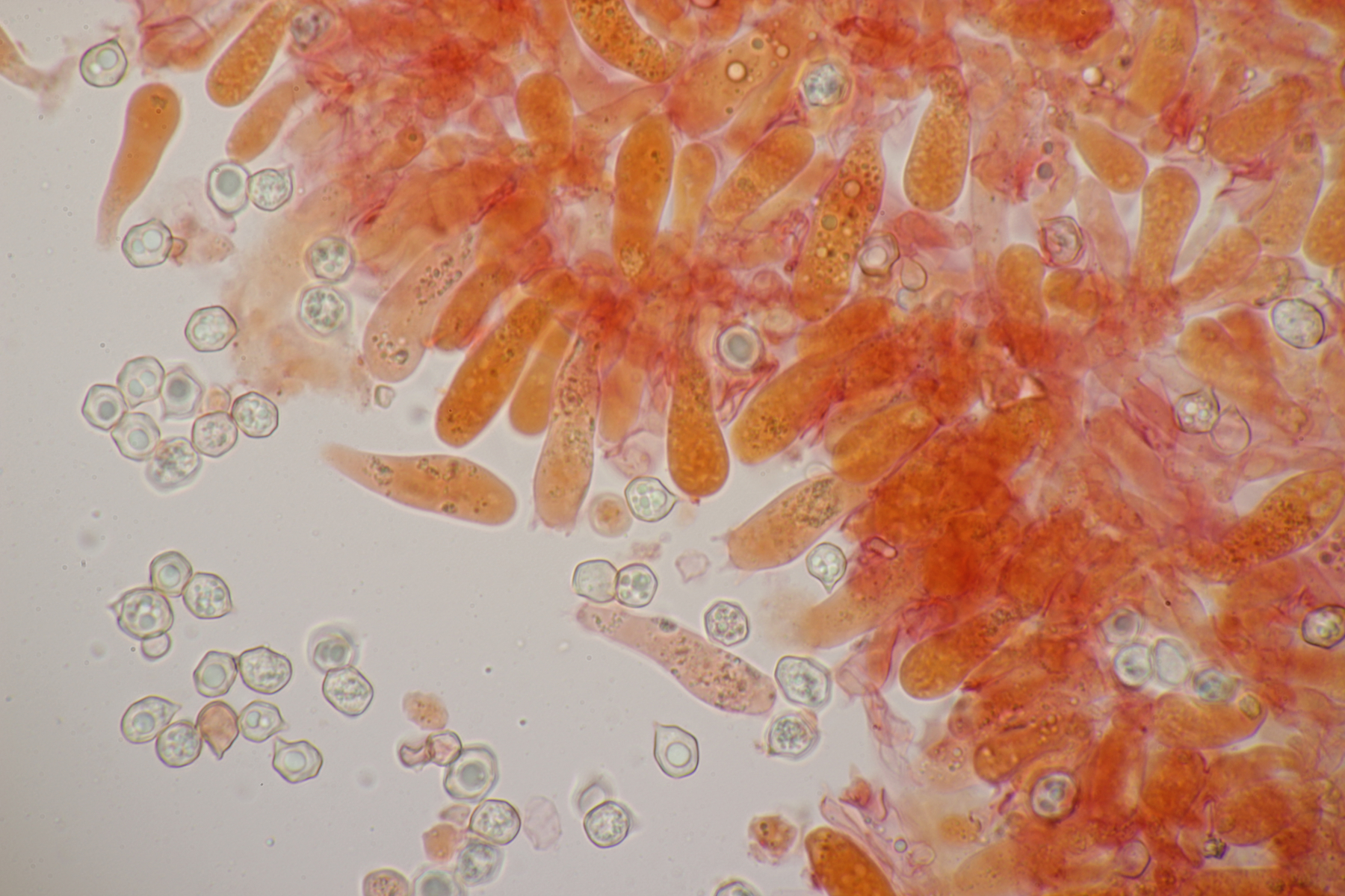 3. Ein Rötling auf der Wiese, der nächste Mykorrhiza-Partner mindestens 10 m entfernt (Fagus und Prunus). Geruch frisch mehlartig, zu Hause dann eher geruchslos. Basidien 4-sporig mit Basalschnalle, das Pigment der Huthaut würde ich für intrazellulär halten, keine Cheilo- und Caulozystiden gefunden. Sporen (10,6+-0,6) x (7,6+-0,4) µm, Q=1.4+-0.1 bzw. (9,4-12,0) x (6,7-8,3) µm, Q=1,2-1,6. Ich hatte auf FB schon mit Karls Hilfe etwas geschlüsselt, bin aber nie bei einer vernünftigen Option gelandet.