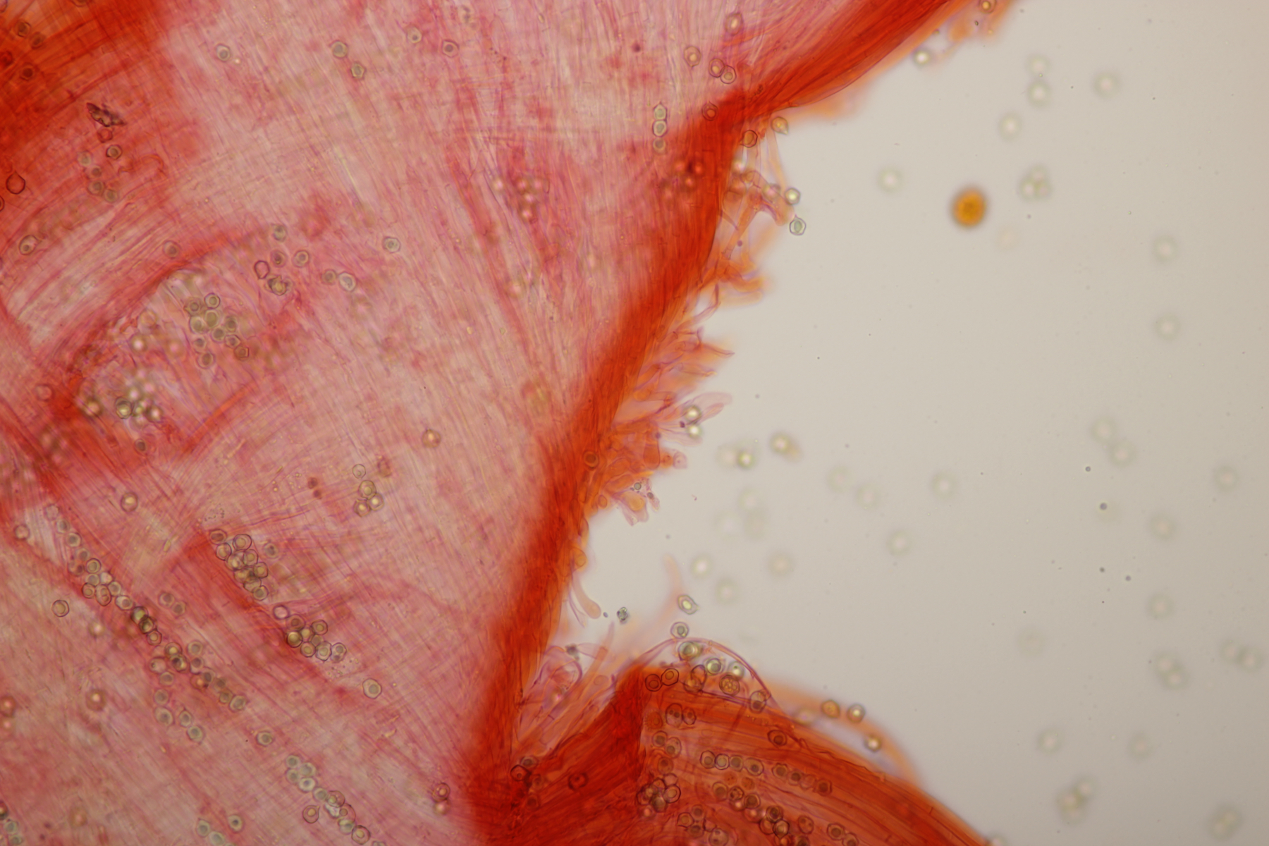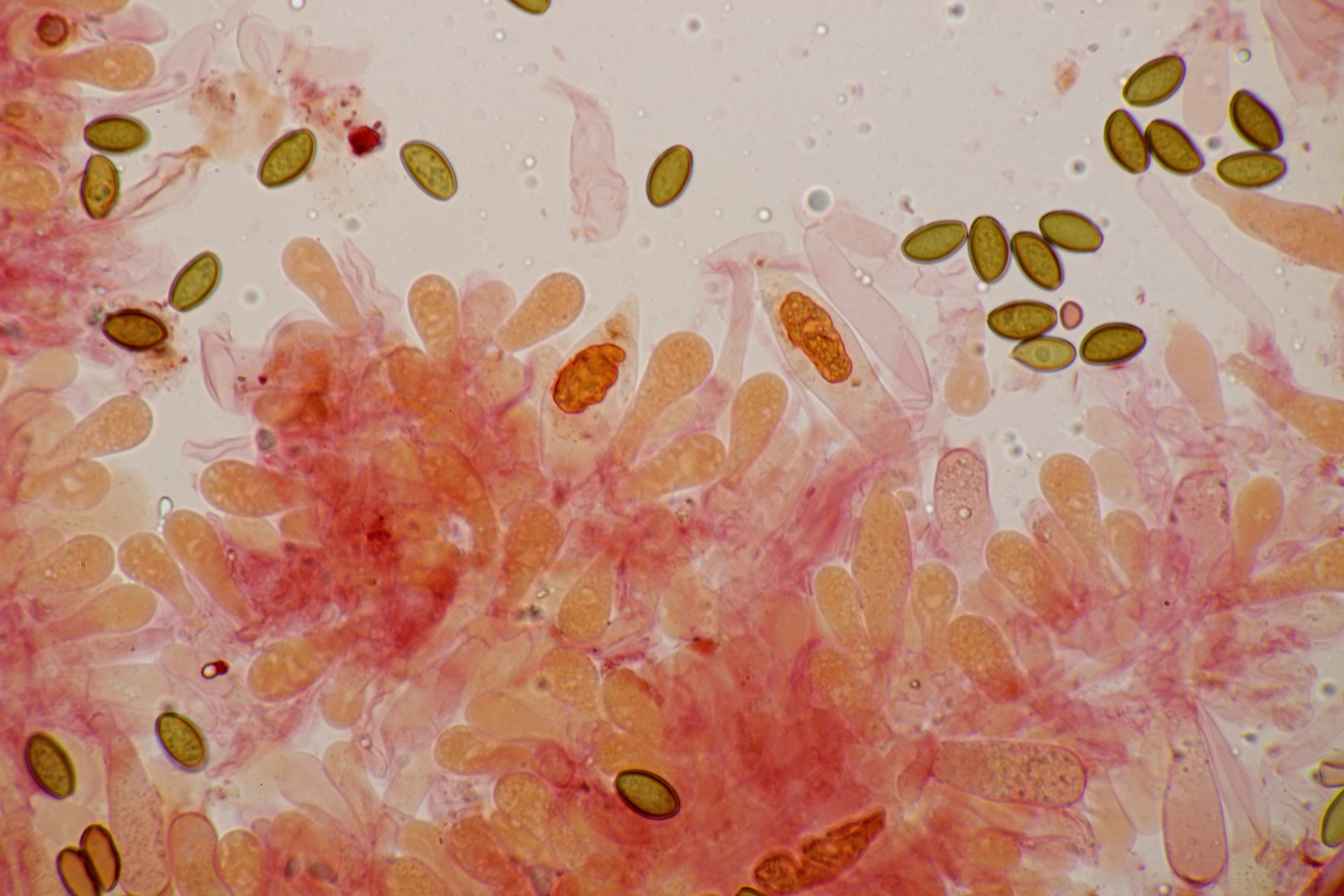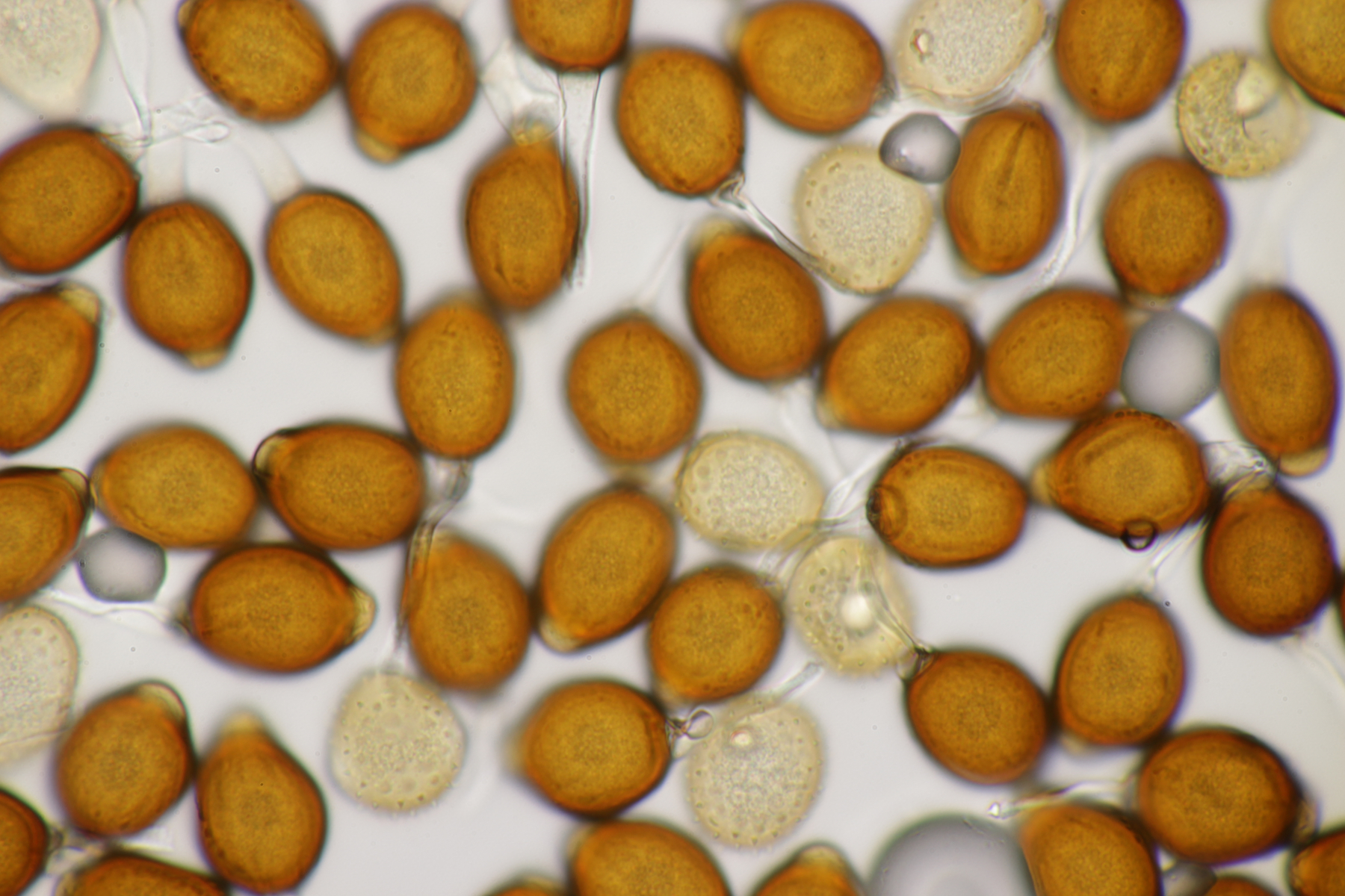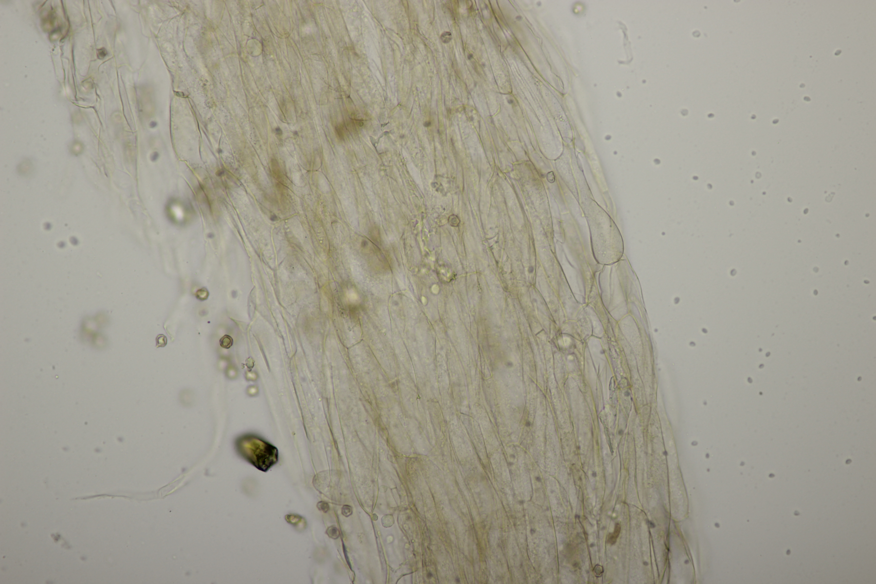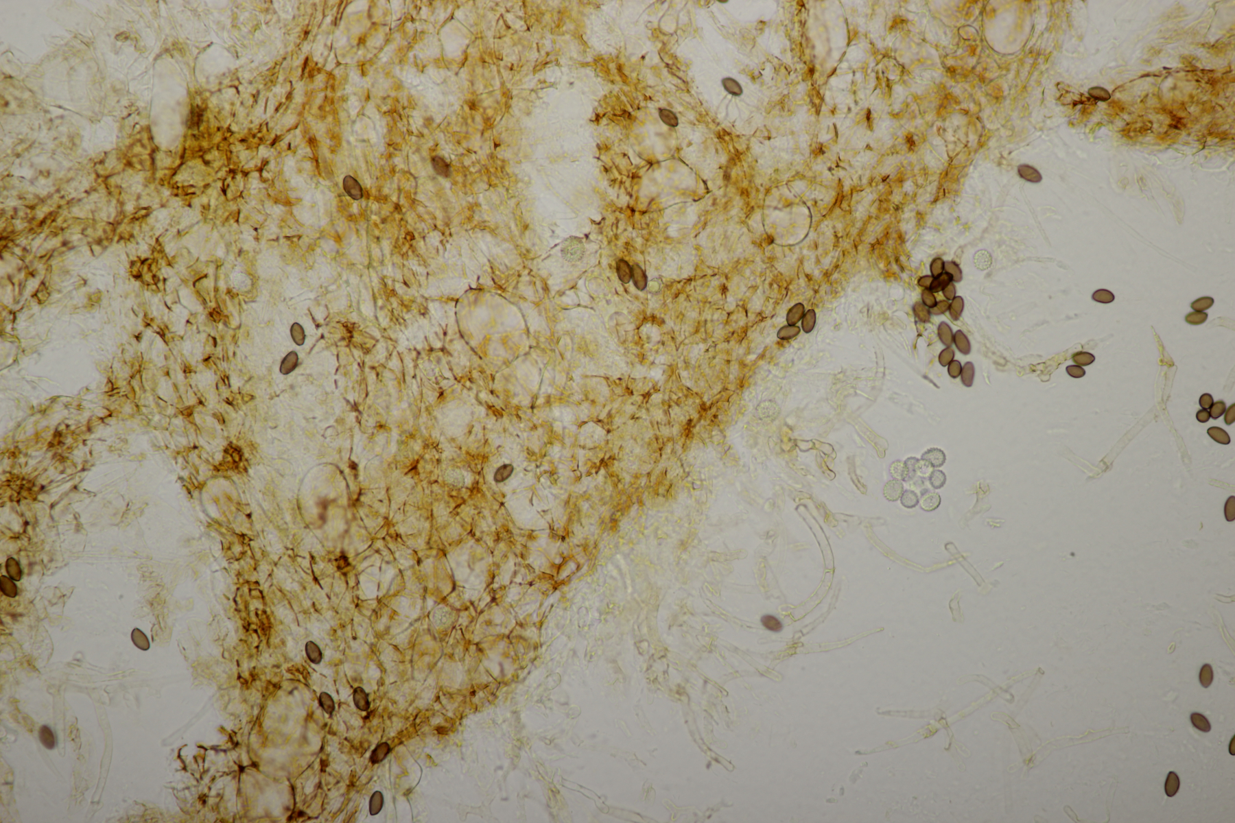 3. Ein Rötling auf der Wiese, der nächste Mykorrhiza-Partner mindestens 10 m entfernt (Fagus und Prunus). Geruch frisch mehlartig, zu Hause dann eher geruchslos. Basidien 4-sporig mit Basalschnalle, das Pigment der Huthaut würde ich für intrazellulär halten, keine Cheilo- und Caulozystiden gefunden. Sporen (10,6+-0,6) x (7,6+-0,4) µm, Q=1.4+-0.1 bzw. (9,4-12,0) x (6,7-8,3) µm, Q=1,2-1,6. Ich hatte auf FB schon mit Karls Hilfe etwas geschlüsselt, bin aber nie bei einer vernünftigen Option gelandet.
