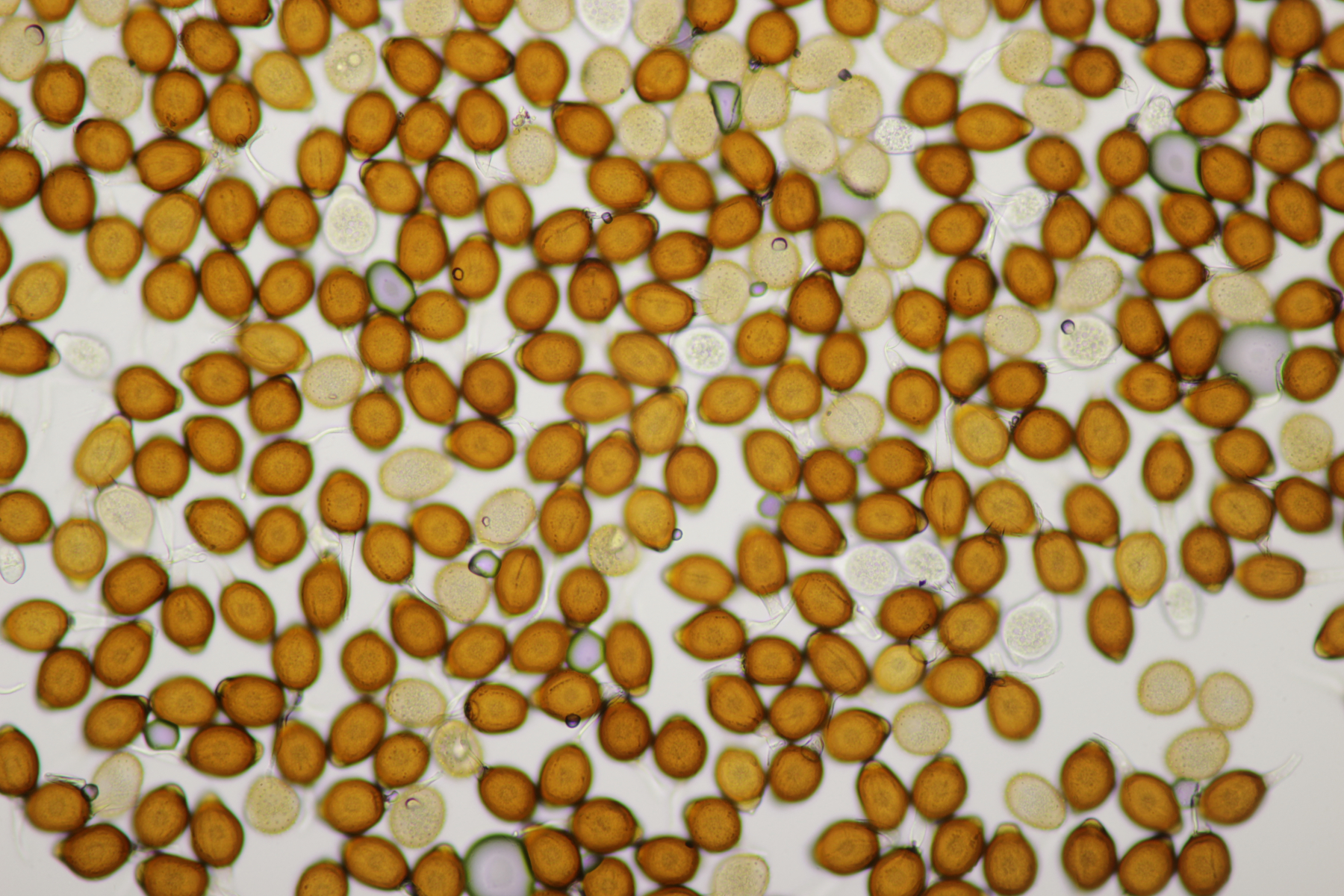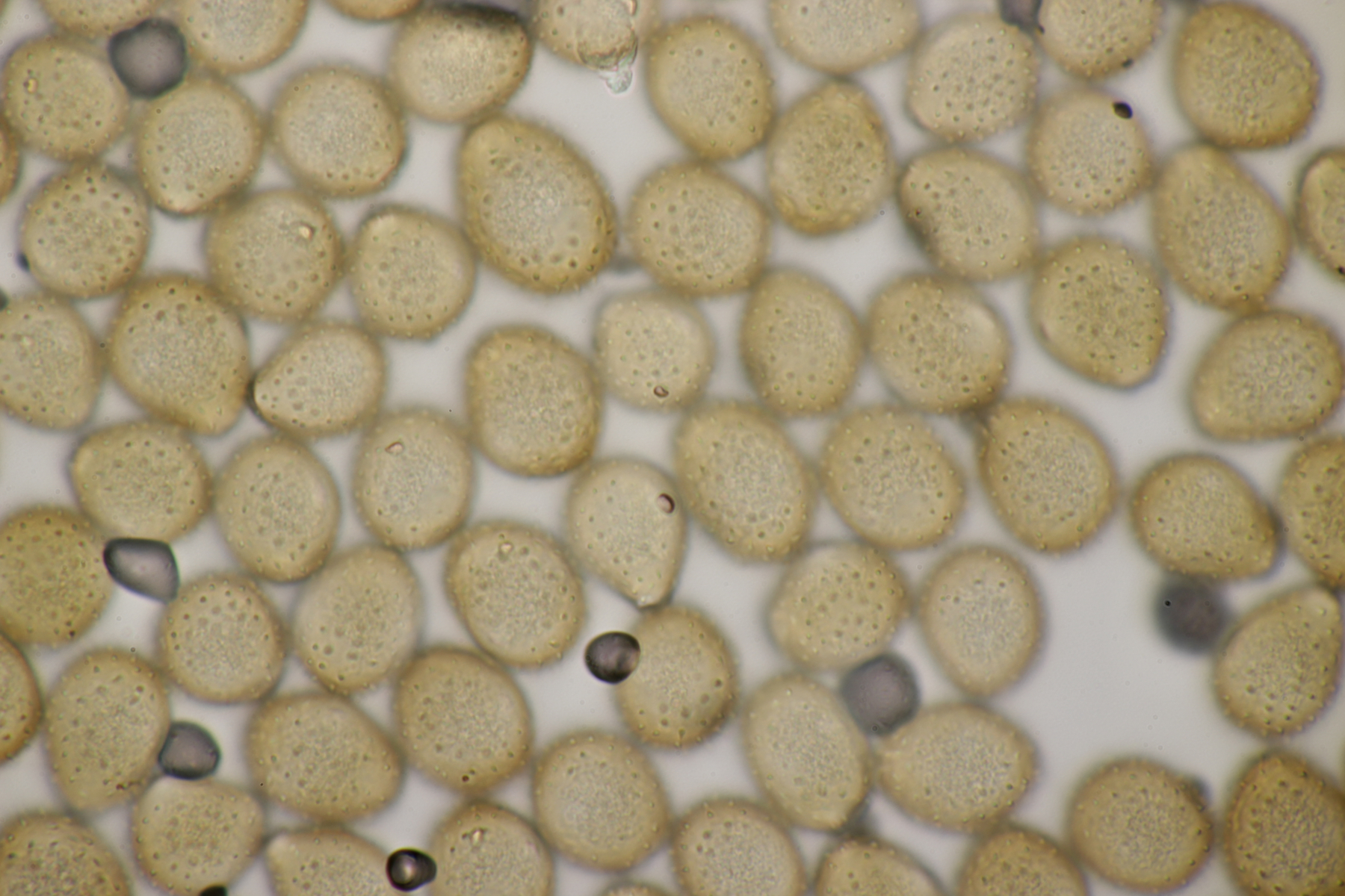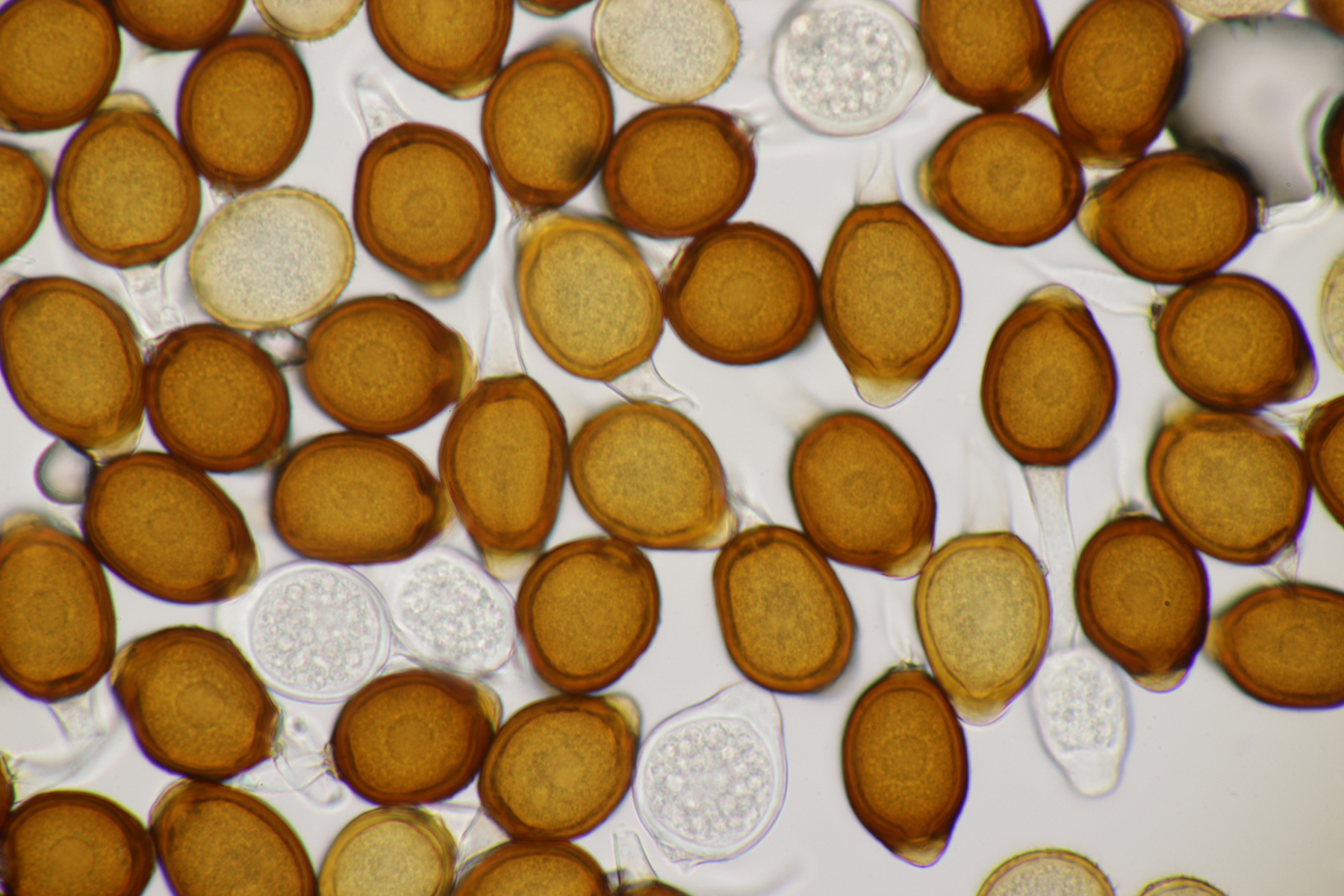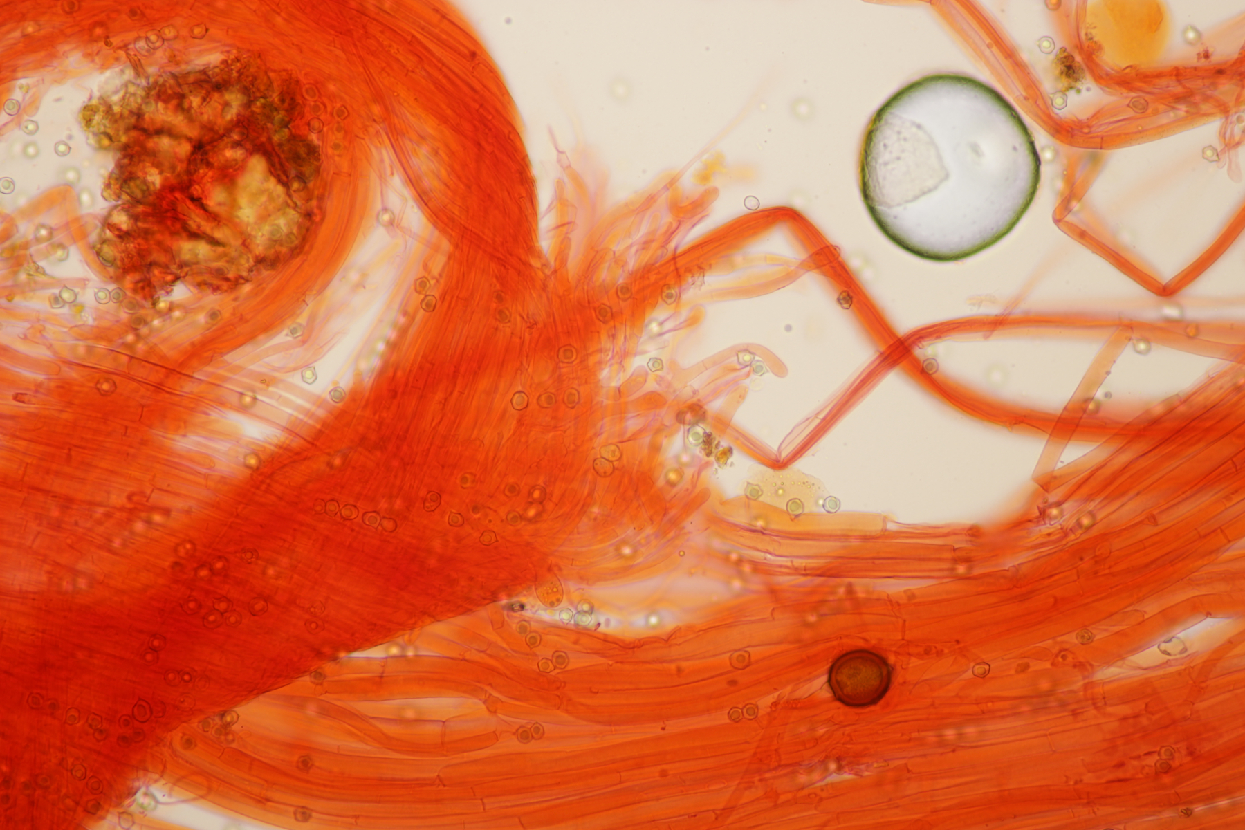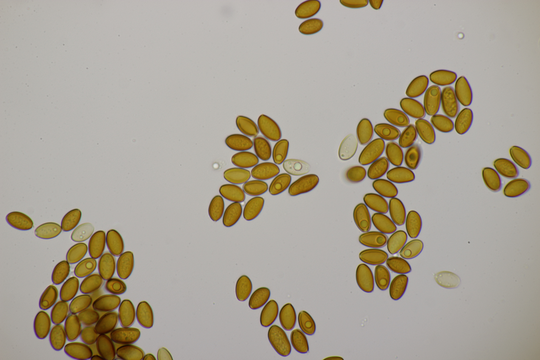 3. Ein Rötling auf der Wiese, der nächste Mykorrhiza-Partner mindestens 10 m entfernt (Fagus und Prunus). Geruch frisch mehlartig, zu Hause dann eher geruchslos. Basidien 4-sporig mit Basalschnalle, das Pigment der Huthaut würde ich für intrazellulär halten, keine Cheilo- und Caulozystiden gefunden. Sporen (10,6+-0,6) x (7,6+-0,4) µm, Q=1.4+-0.1 bzw. (9,4-12,0) x (6,7-8,3) µm, Q=1,2-1,6. Ich hatte auf FB schon mit Karls Hilfe etwas geschlüsselt, bin aber nie bei einer vernünftigen Option gelandet.