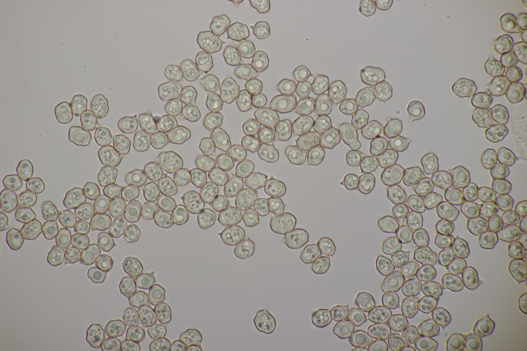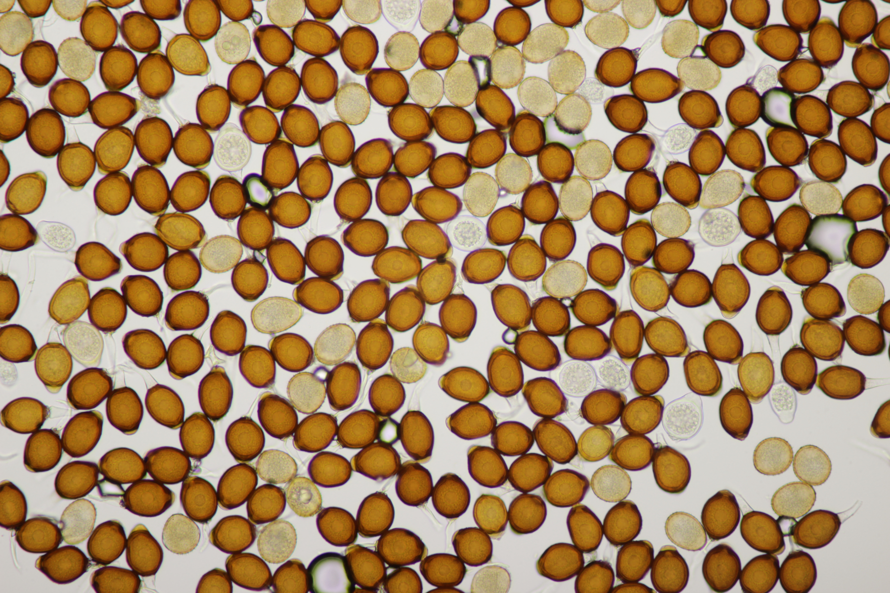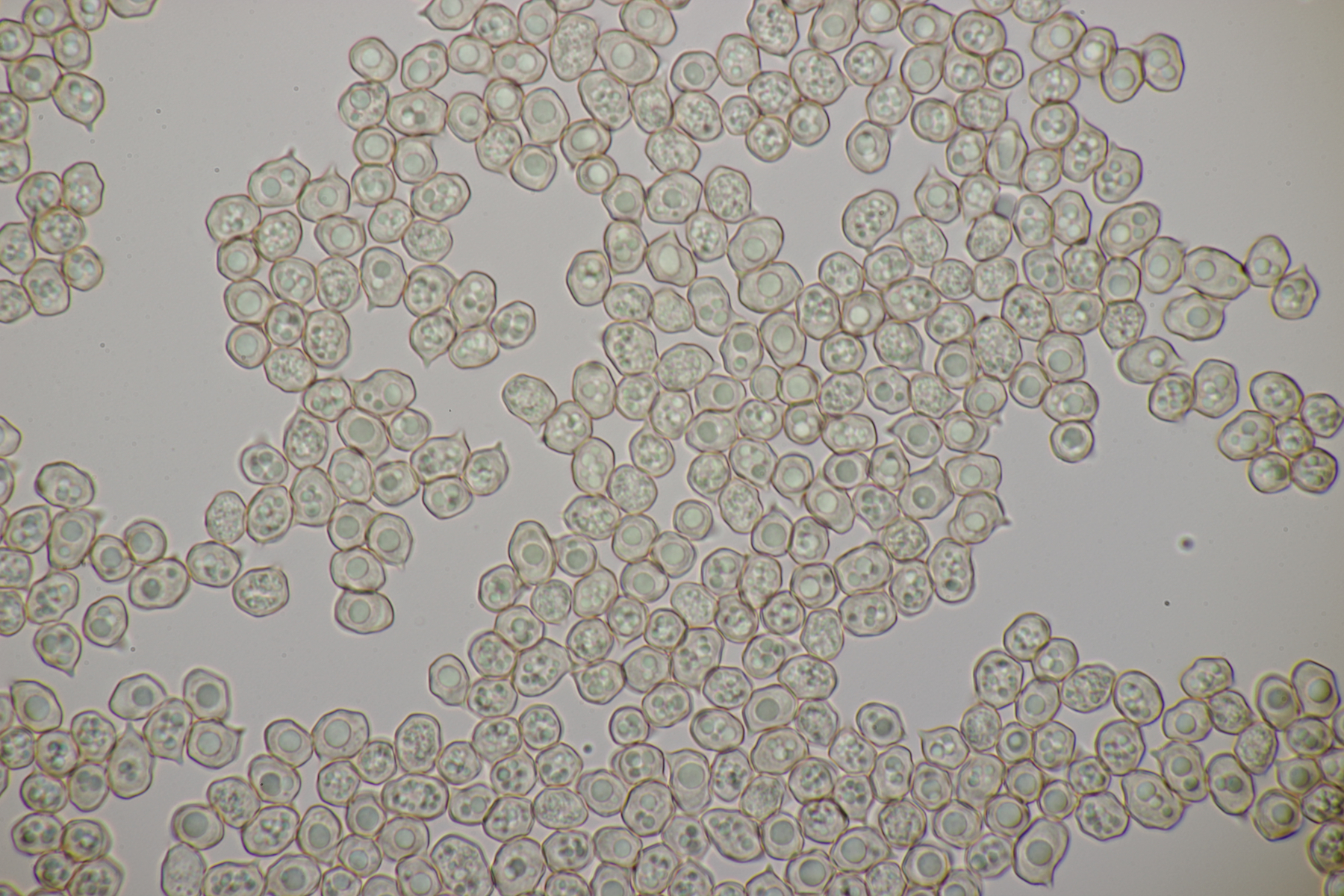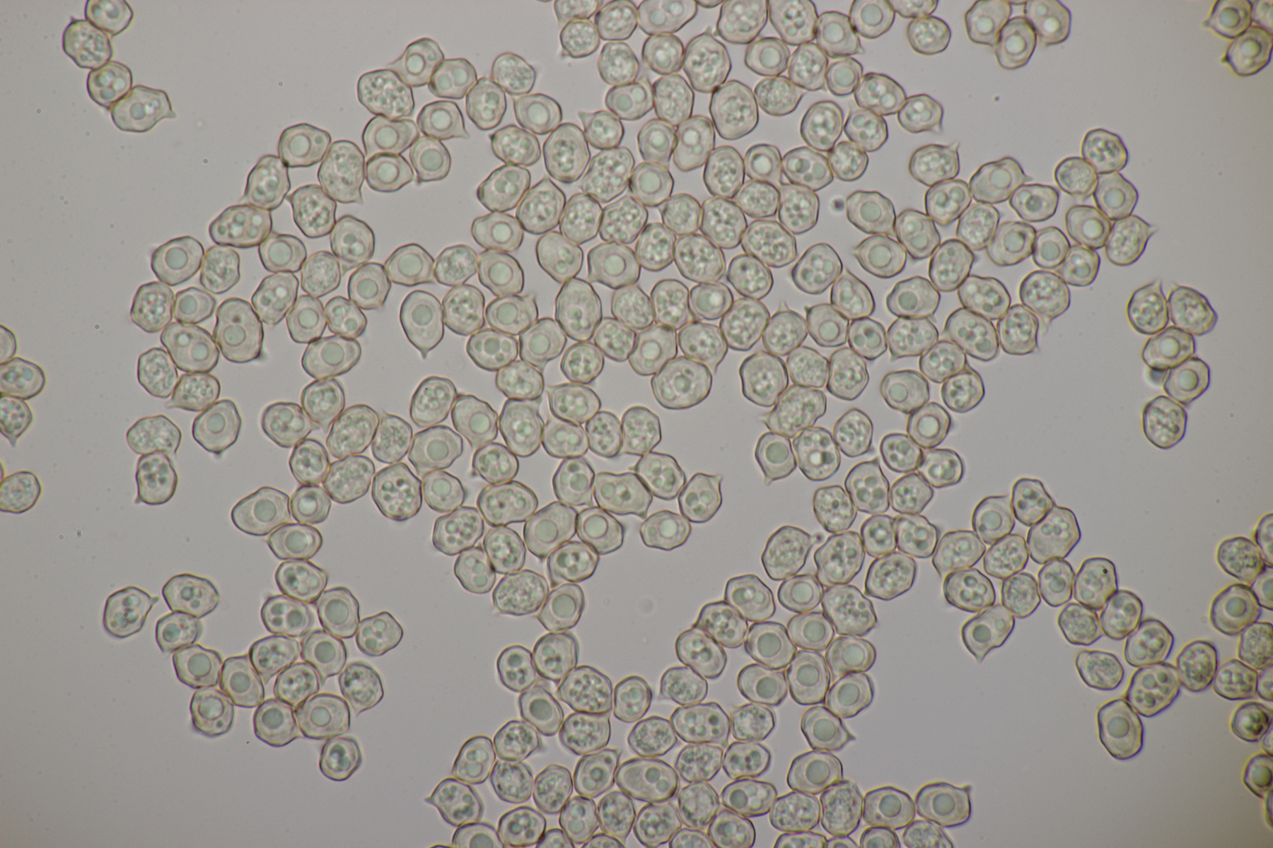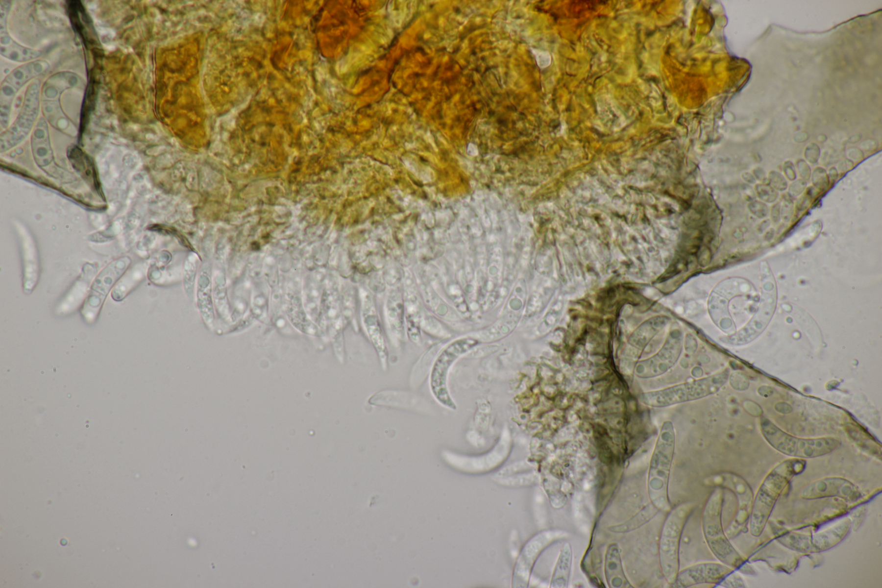 3. Ein Rötling auf der Wiese, der nächste Mykorrhiza-Partner mindestens 10 m entfernt (Fagus und Prunus). Geruch frisch mehlartig, zu Hause dann eher geruchslos. Basidien 4-sporig mit Basalschnalle, das Pigment der Huthaut würde ich für intrazellulär halten, keine Cheilo- und Caulozystiden gefunden. Sporen (10,6+-0,6) x (7,6+-0,4) µm, Q=1.4+-0.1 bzw. (9,4-12,0) x (6,7-8,3) µm, Q=1,2-1,6. Ich hatte auf FB schon mit Karls Hilfe etwas geschlüsselt, bin aber nie bei einer vernünftigen Option gelandet.