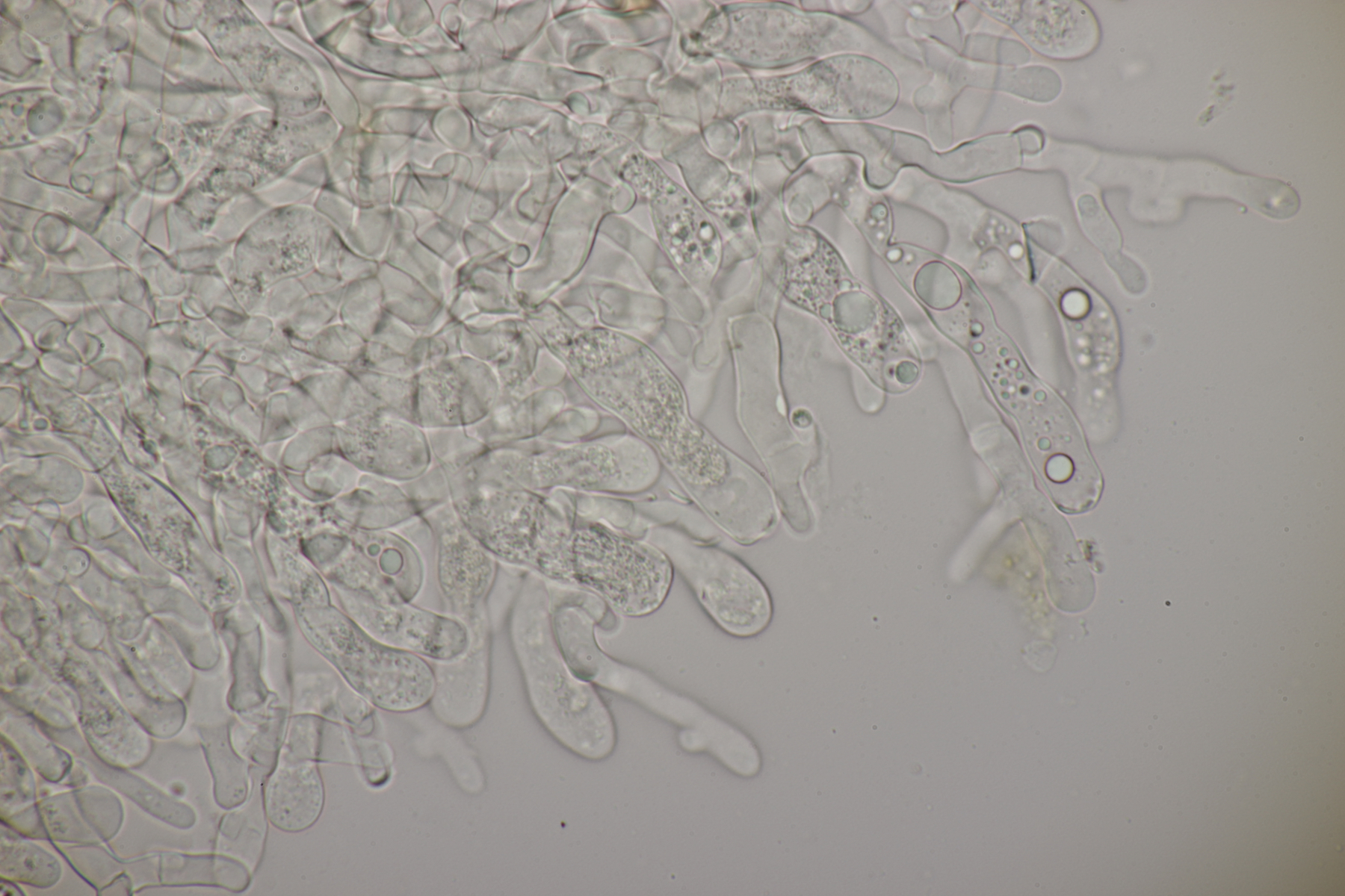 2. Vor Ort dachte ich: Oh ein blauer Pilz, das muß ein Amaurodon sein. Das hat sich dann aber mikroskopisch nicht bestätigt. Die wenigen Sporen, die ich finden konnte, waren in KOH braun. Leider gab es insgesamt nur sehr wenige Sporen, so daß ich mich da bei der Beurteilung schwer tue. Es scheint aber Zystiden zu geben. Diese sind aber zumindest in KOH nicht inkrustiert. Bei der Beurteilung der Form tue ich mich schwer. Einige sind eher zylindrisch, andere leicht kopfig. Also schwanke ich zwischen T. galzinii und T. viridula mit leichter Tendenz zu letzterer. Was meinst Tomentella?