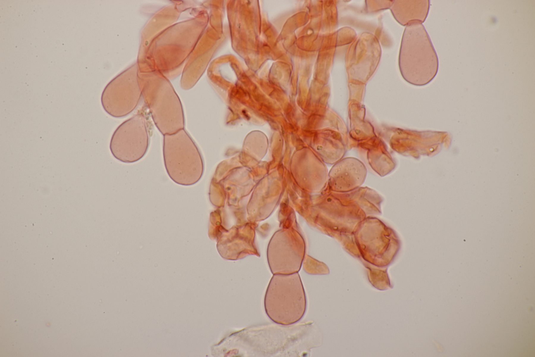 7. Russula sp. Vor Ort hab ich den Geruch irgendwo bei Blattwanze-fruchtig eingeordnet. Begleitbäume Fagus und Quercus. Mit Guajak in 3 Sekunden dunkelblau. Mit Eisensulfat grün! Also ein Heringstäubling. Sporenpulver IIIa-b. Die Huthaut der Hutmitte ließ sich leider nur sehr bescheiden mikroskopieren, ich konnte aber keine blasig verdickten Zellen entdecken, was gegen Russula faginea spricht. Dann lande ich bei R. graveolens agg.