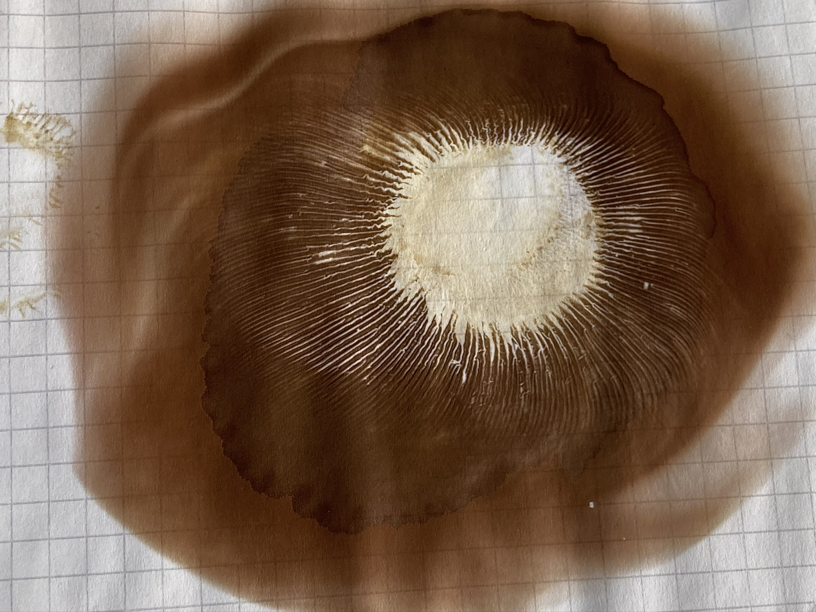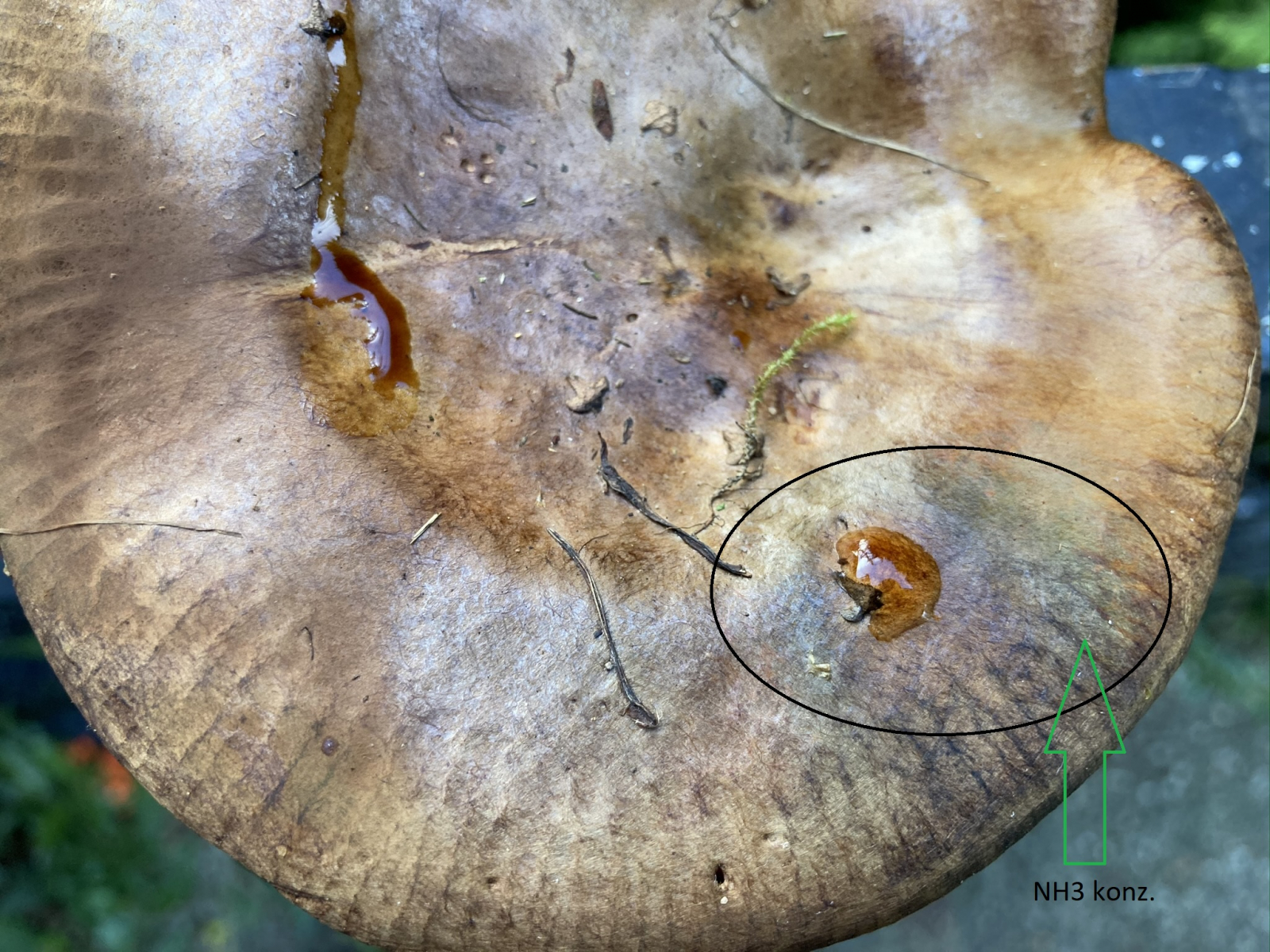 Ob man jetzt P.validus mit P.ammoniavirescnes synonymisieren kann muss man spekulieren, jedoch habe ich bei diesem Kremplingsfund die Hutoberflöche mit Konzentrierter Ammoniaklösung betropft und siehe da, es ergibt sich eine graugrüne Färbung. Diese entsteht nicht direkt an der Berührungsstelle mit der Base, sondern durch den flüchtigen Ammoniak. Nach wenigen Sekunden verblasst das Graugrün schon in ein schmutziges Grau-Violettbraun.