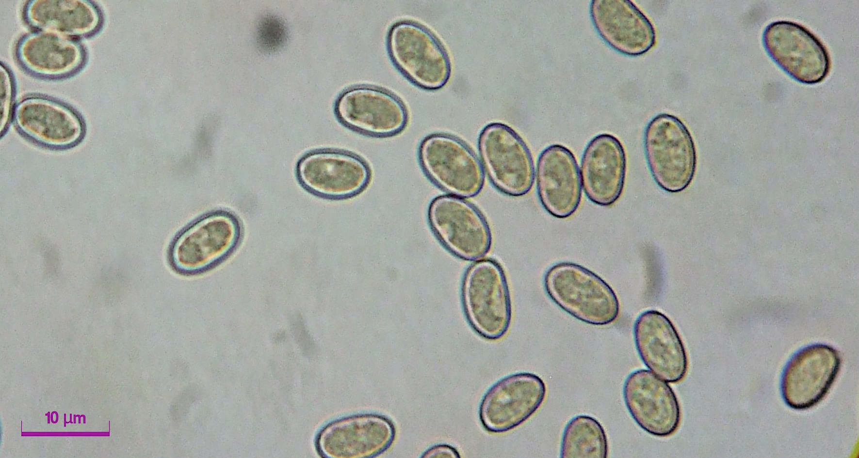 Die Sporen sind glattwandig, ohne erkennbaren Appendix. Die Sporenmaße sind: 8.3 - 9.5 * 5.2 - 5.6 um, Q= 1,7