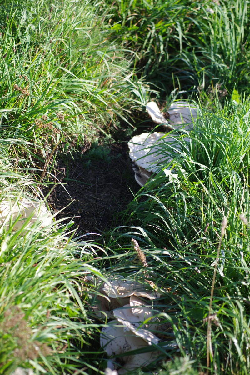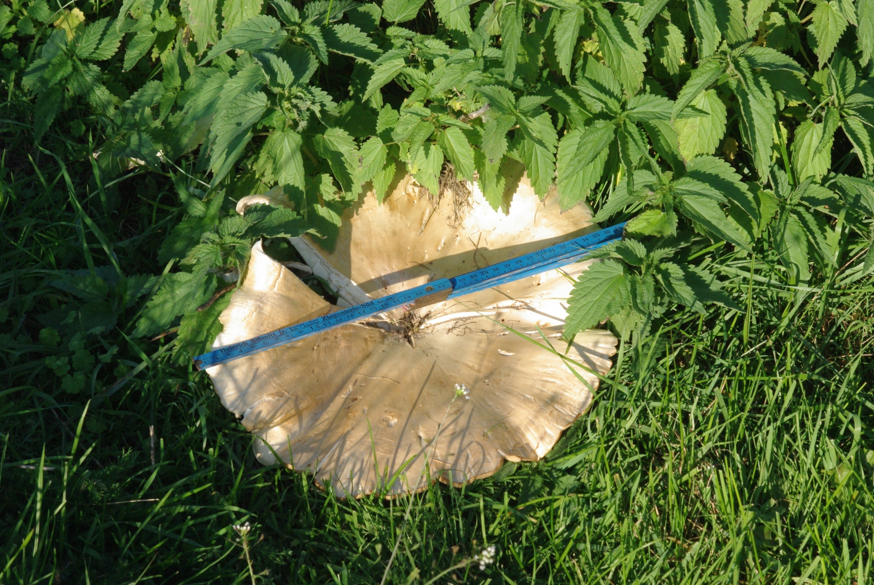 Hallo, vielleicht interessiert es ja, da der Pilz gerade in diversen Threads erwähnt wird. Ich habe den regelmäíg auf dem Hof, Wiese, Wald und Obstgarten. Zumeist in unvollständigen Hexenringen, von denen der größte im Druchmesser knapp 30 m erreicht (siehe Luftbild, zugegebenermaßen nicht mehr wirklich ringförmig). Auffällig ist, dass im Folgejahr an der Pilzstelle ein etwa 30 cm breiter Streifen vegetationsfrei bleibt - weswegen man den so gut auf dem Luftbild sieht. Der Hexenring zieht pro Jahr um etwa 30...50 cm weiter. Vor einigen Tagen habe ich einen alten Pilz vermessen - 38 cm Hutdurchmesser, siehe Bild. Bei Interesse kann ich auch gern mehr Bilder einstellen, momentan sind die (auf den Wiesen) noch in allen Reifestadien vorhanden.