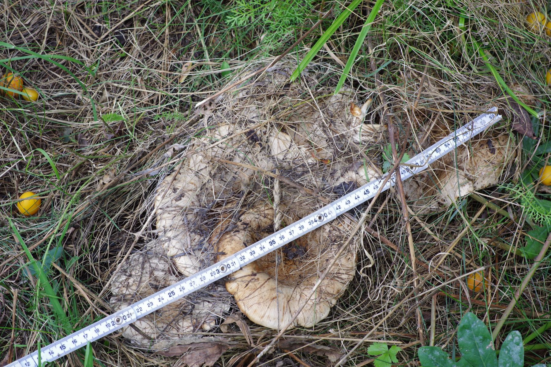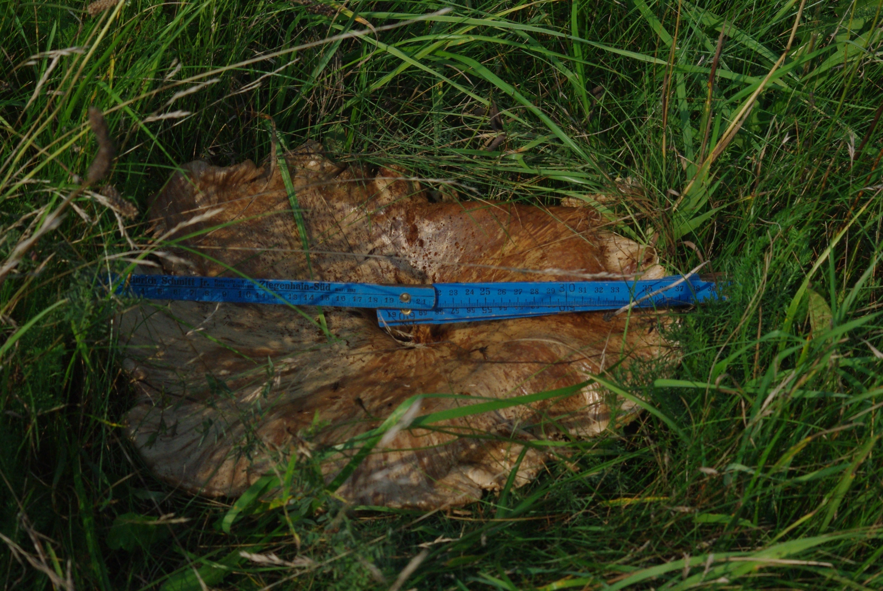 • Hallo, vielleicht interessiert es ja, da der Pilz gerade in diversen Threads erwähnt wird. Ich habe den regelmäíg auf dem Hof, Wiese, Wald und Obstgarten. Zumeist in unvollständigen Hexenringen, von denen der größte im Druchmesser knapp 30 m erreicht (siehe Luftbild, zugegebenermaßen nicht mehr wirklich ringförmig). Auffällig ist, dass im Folgejahr an der Pilzstelle ein etwa 30 cm breiter Streifen vegetationsfrei bleibt - weswegen man den so gut auf dem Luftbild sieht. Der Hexenring zieht pro Jahr um etwa 30...50 cm weiter. Vor einigen Tagen habe ich einen alten Pilz vermessen - 38 cm Hutdurchmesser, siehe Bild. Bei Interesse kann ich auch gern mehr Bilder einstellen, momentan sind die (auf den Wiesen) noch in allen Reifestadien vorhanden.