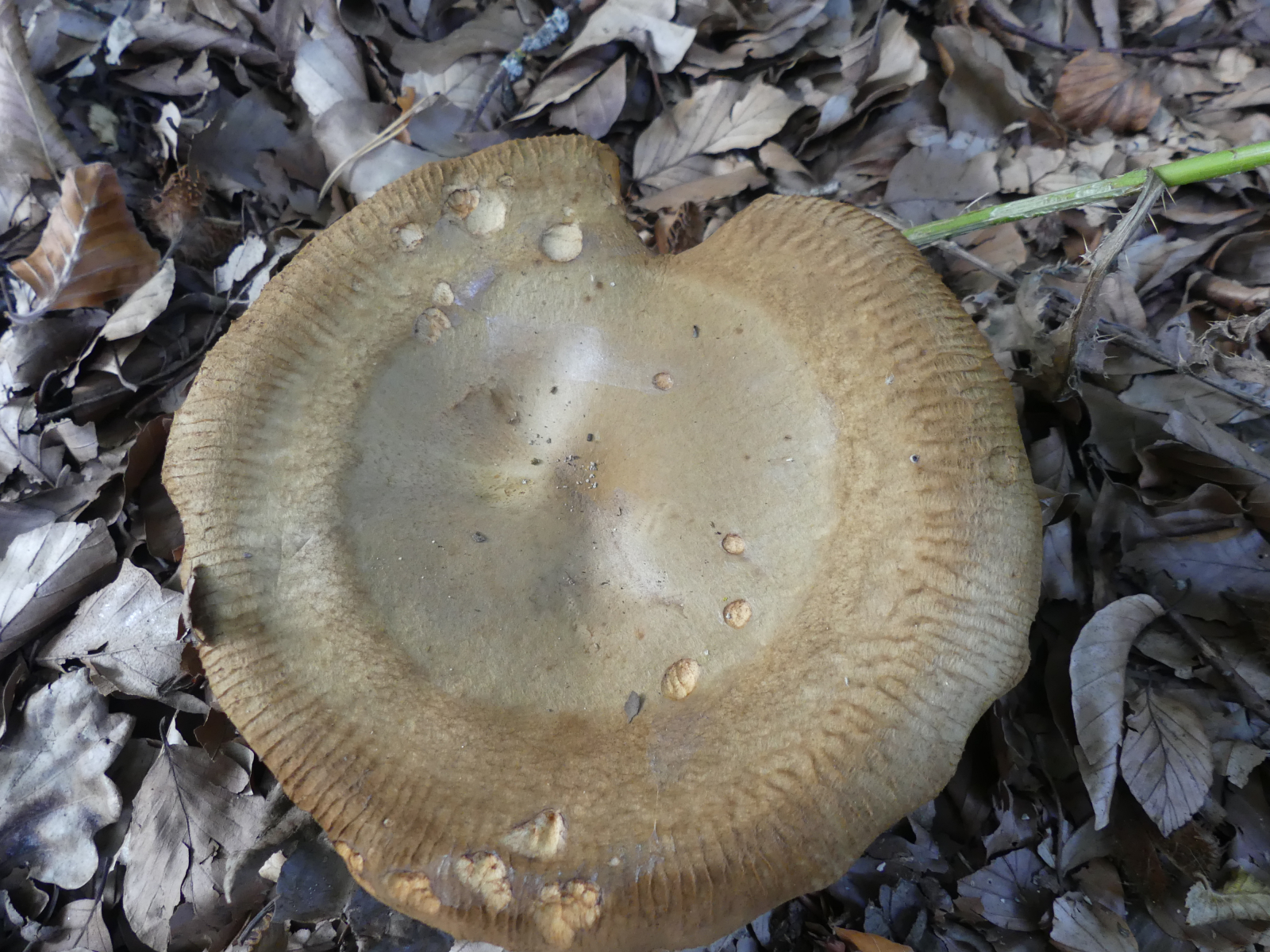 Huthaut samtig, Hutrand deutlich gefurcht. Hutdurchmesser ca. 14 cm, Pilzhöhe ca. 10 cm