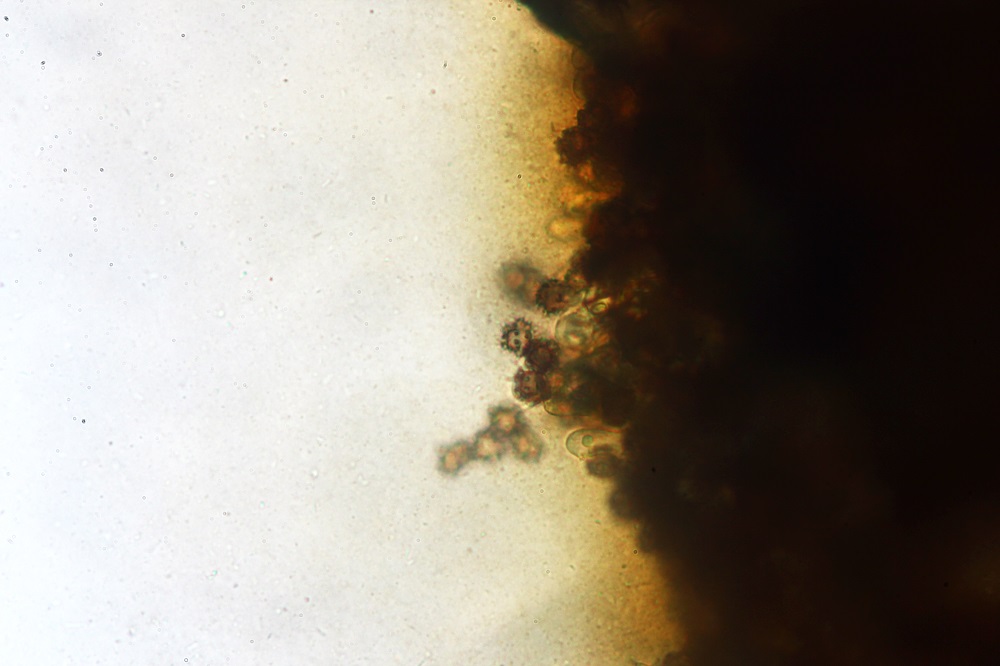 Es ist wieder eine Tomentella, wo ich hoffe das es eine Tomentella lateritia ist. Der Pilz besteht nicht aus filzigen Gewebe, auch gibt es keine Reaktion auf KOH (außer die Typische das die Farbe verschwindet).