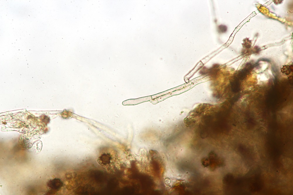 Die Hyphen sind hyalin und haben sowohl Schnallen als auch keine Schnallen.