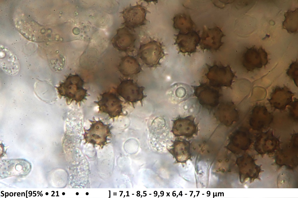 In Wasser taucht eine orangene Farbe auf. Die Sporen sind in der Länge (Maximal 9,5 und Minimal 7,5) und in der Breite (Maximal 9 und Minimal 6,5), also zusammengefasst eine Größe von 6,5-9,5 Mikrometer.