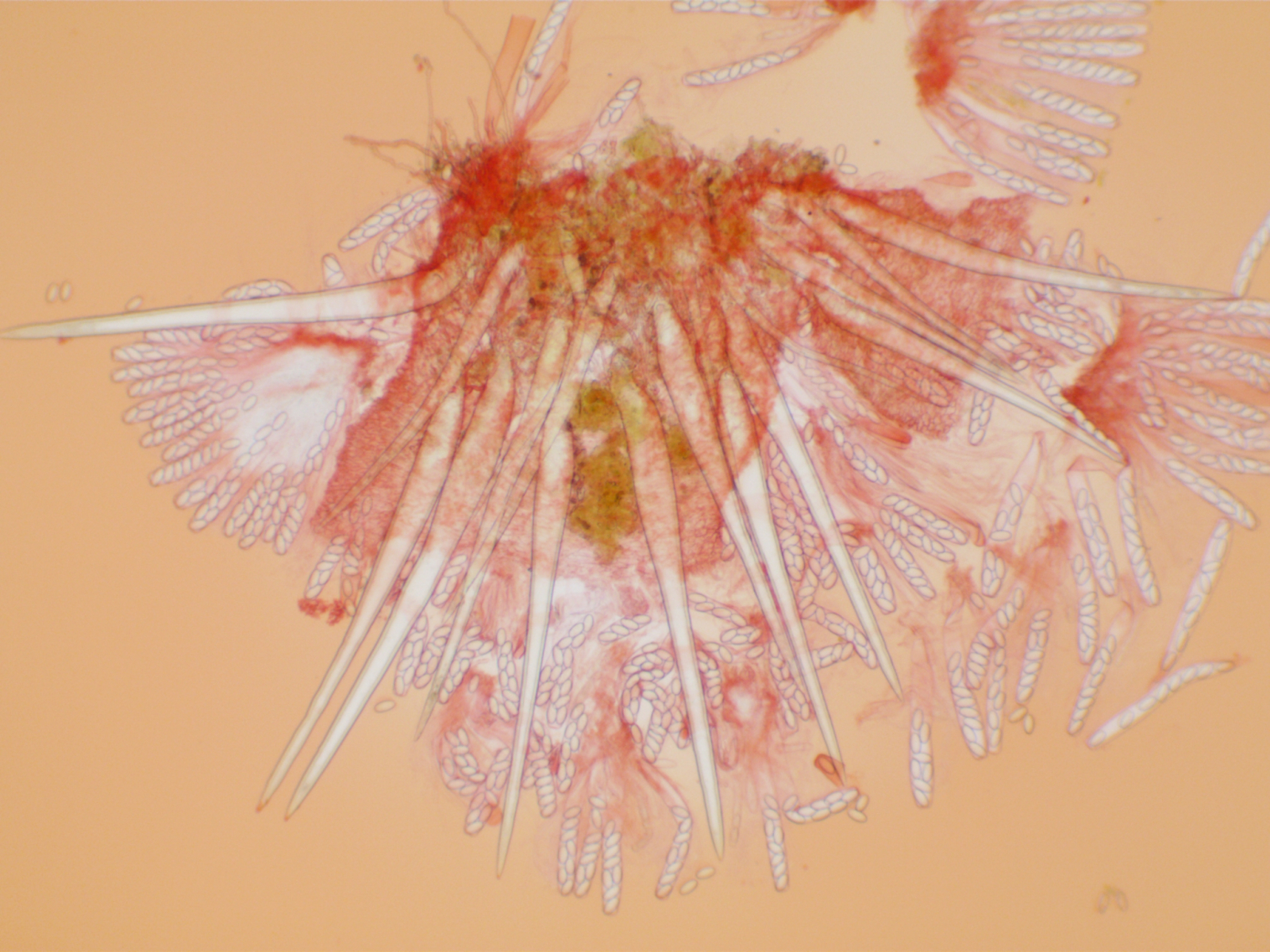 Mit den recht schlanken Sporen und den kräftigen Haaren käme Lasiobolus macrotrichus in Betracht.