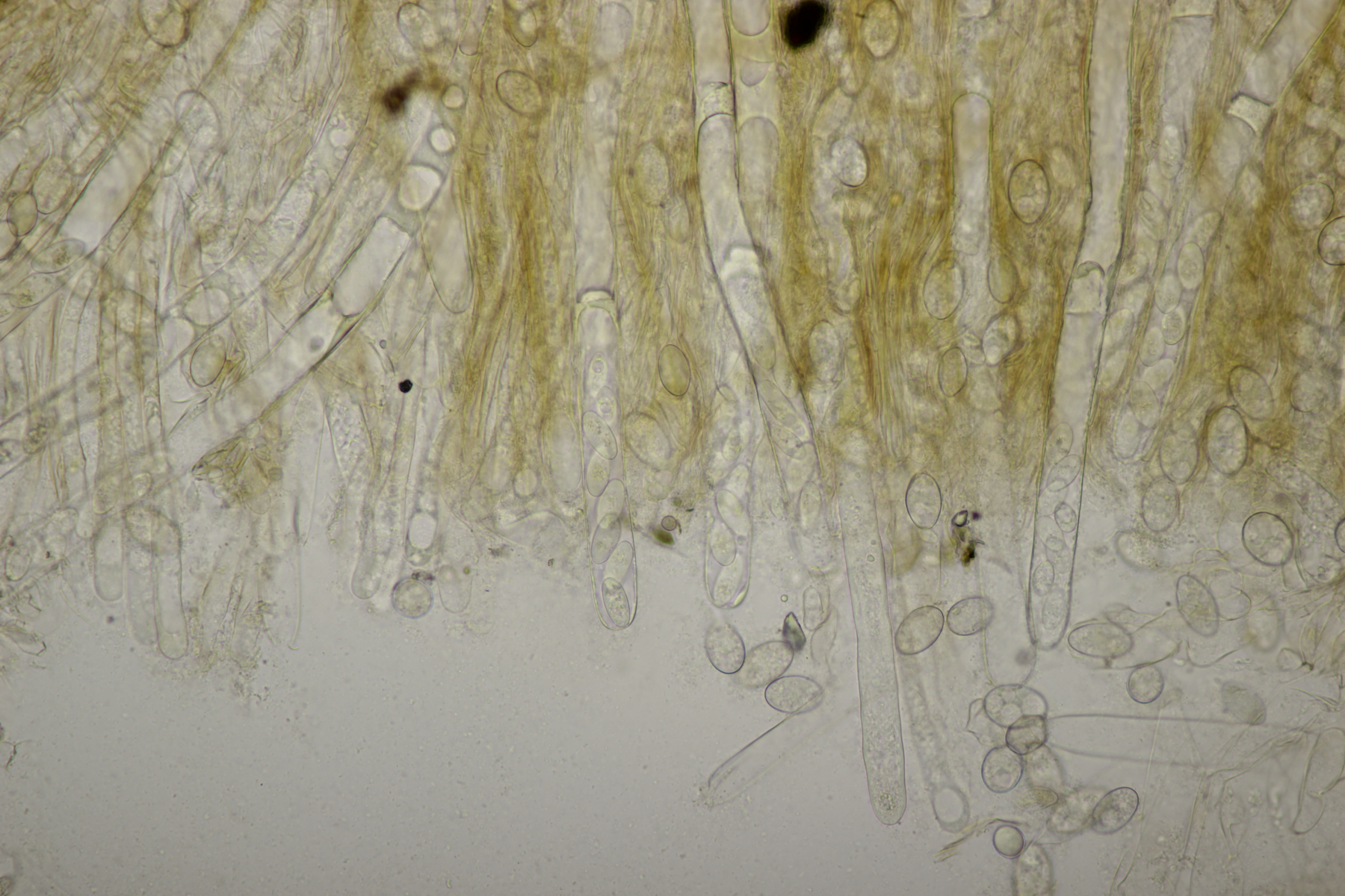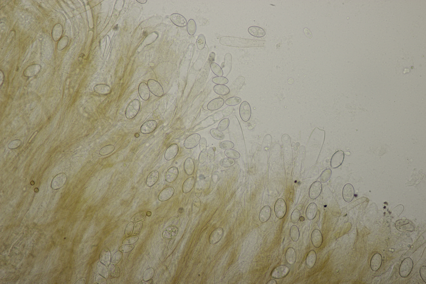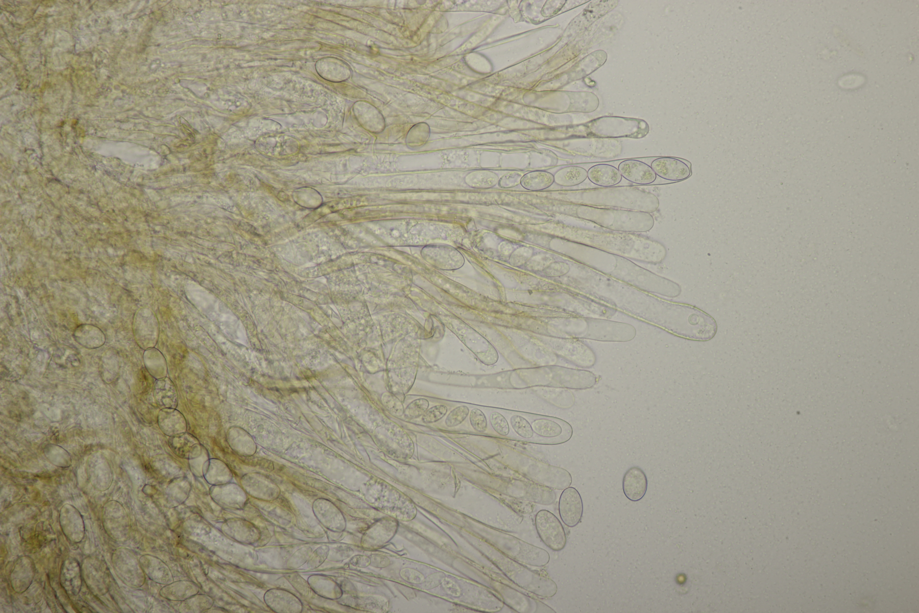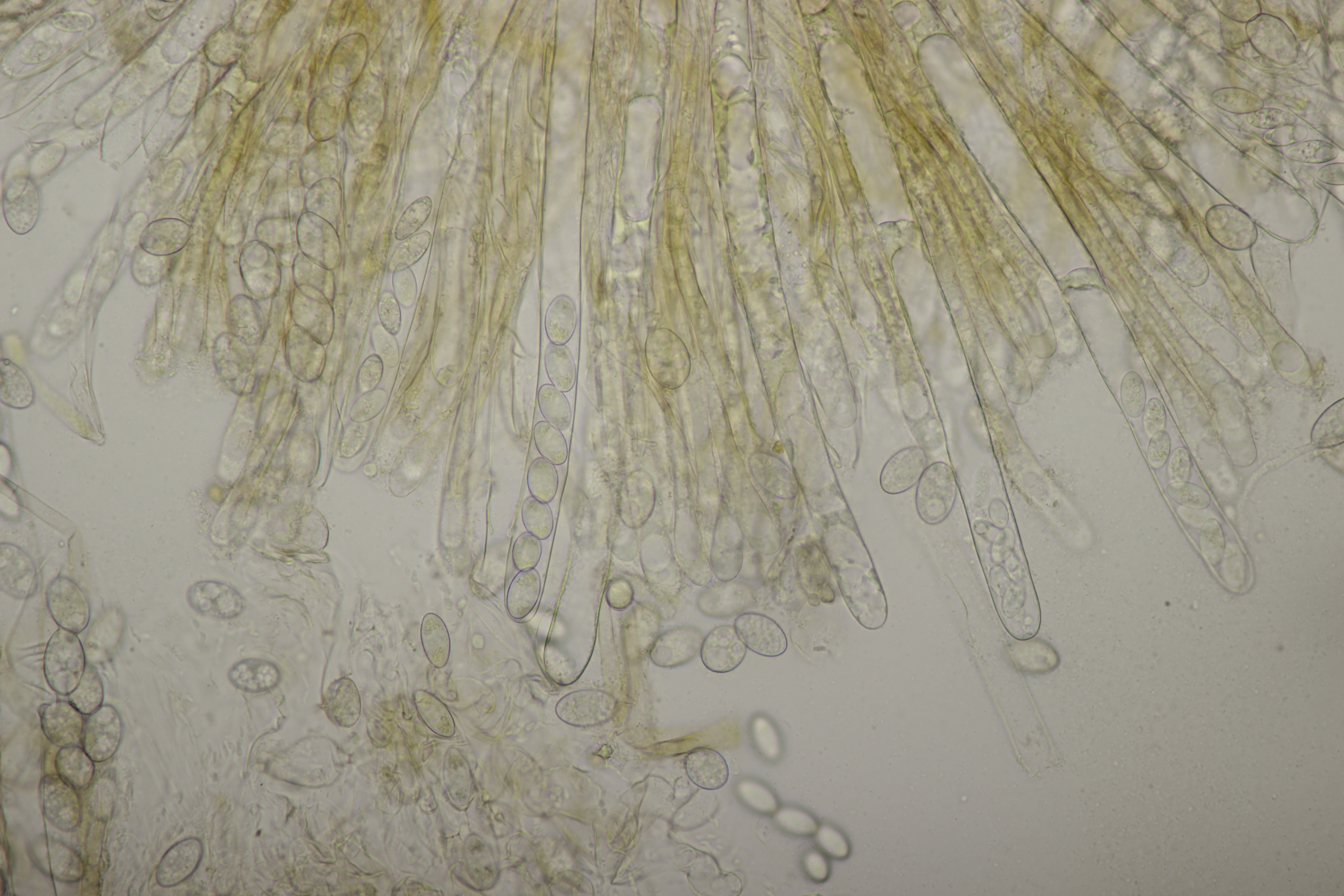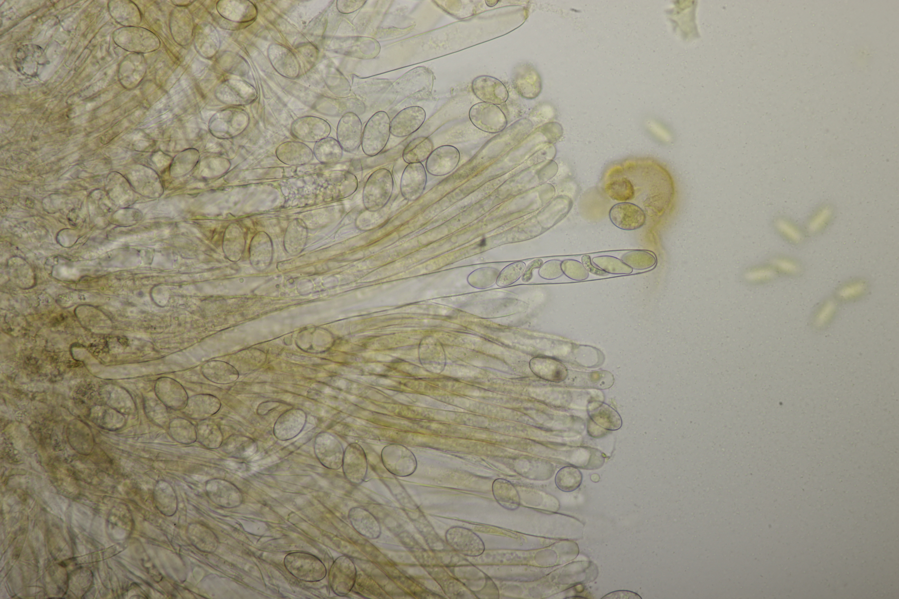 7. Ein Ascomycet aus dem Rotbachtal. Vor Ort war es leider etwas duster, deshalb wurden nachträglich Fotos zu Hause gemacht. Der ziemlich fleischige Geselle wuchs an einem Stamm, der schon länger im Rotbach liegt und u.a. auch Crepidotus crocophyllus hervorbringt. Bei FB wurde Peziza subisabellina ins Spiel gebracht. Paßt soweit auch alles, nur die Reaktion der Asci mit Lugol ist entweder sehr schwach oder gar nicht vorhanden.