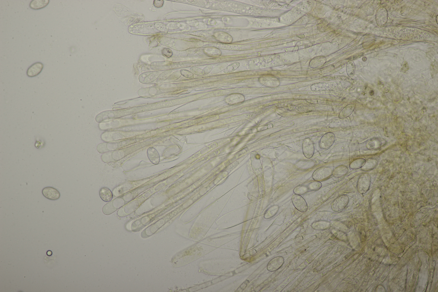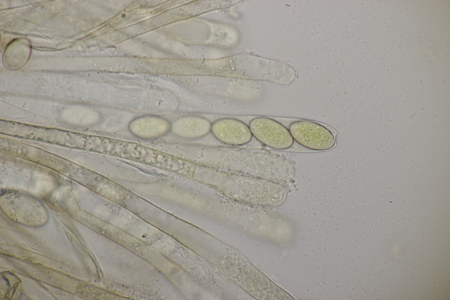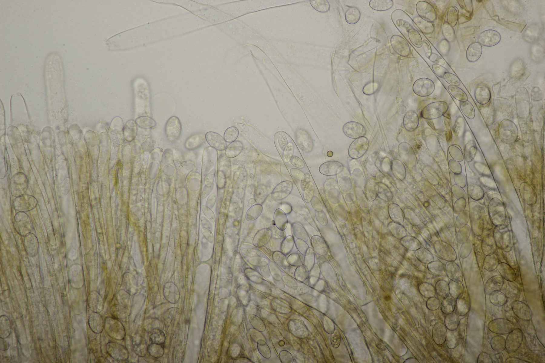 7. Ein Ascomycet aus dem Rotbachtal. Vor Ort war es leider etwas duster, deshalb wurden nachträglich Fotos zu Hause gemacht. Der ziemlich fleischige Geselle wuchs an einem Stamm, der schon länger im Rotbach liegt und u.a. auch Crepidotus crocophyllus hervorbringt. Bei FB wurde Peziza subisabellina ins Spiel gebracht. Paßt soweit auch alles, nur die Reaktion der Asci mit Lugol ist entweder sehr schwach oder gar nicht vorhanden.