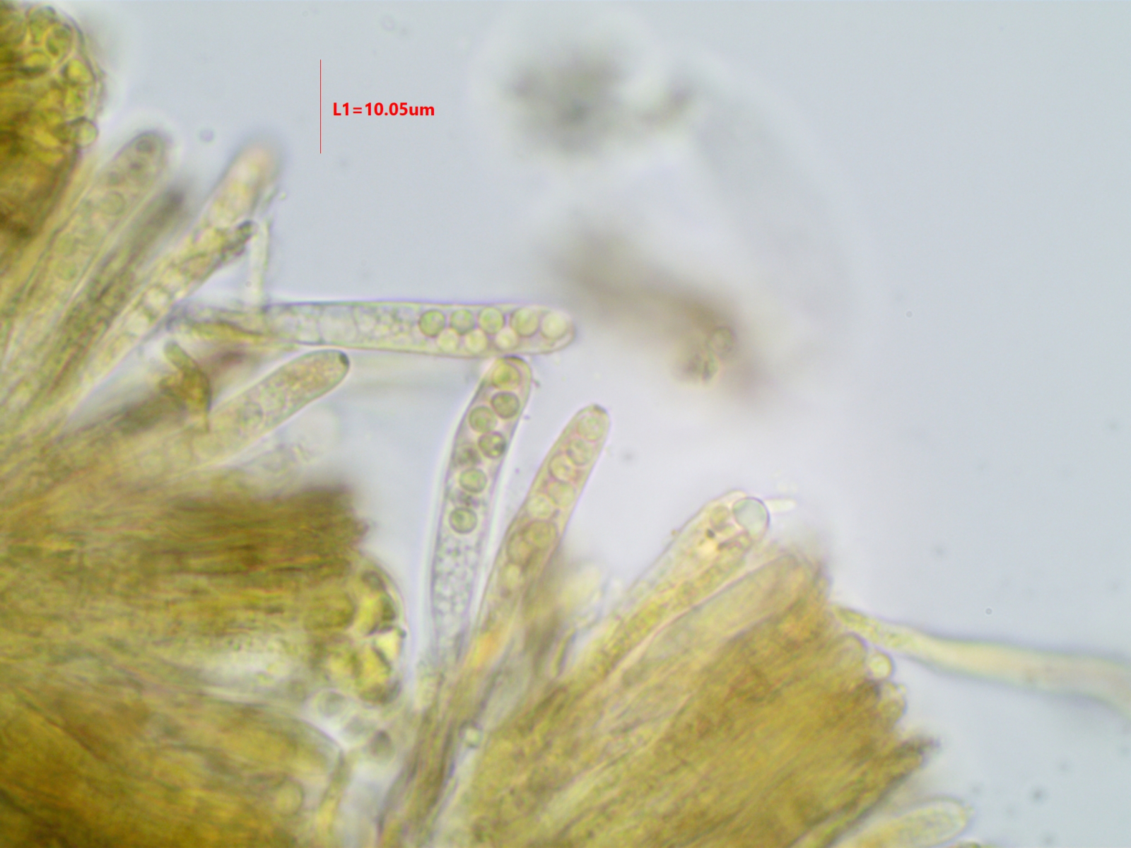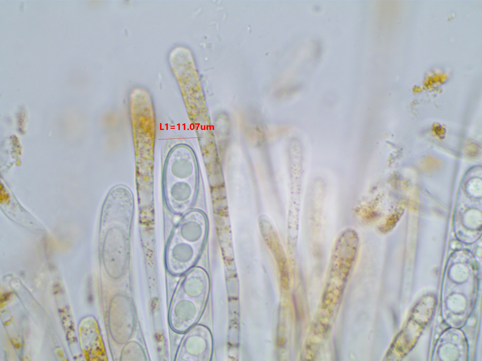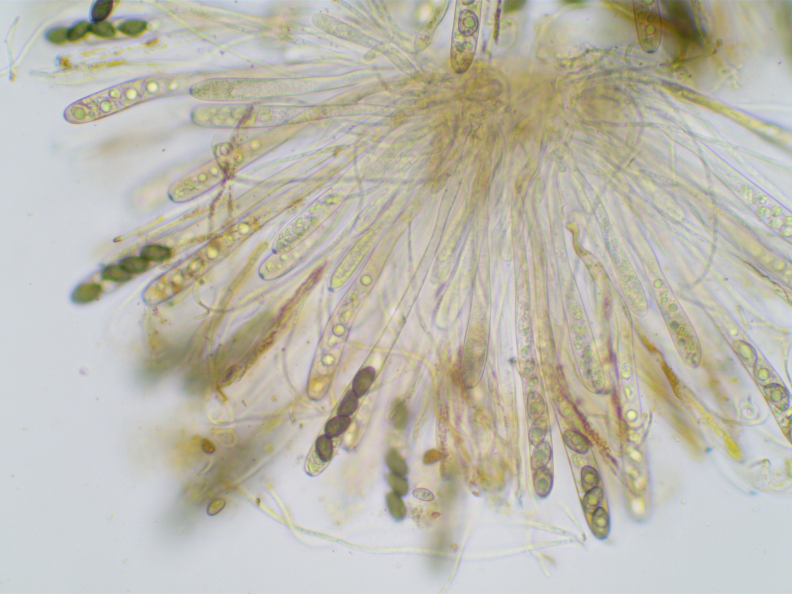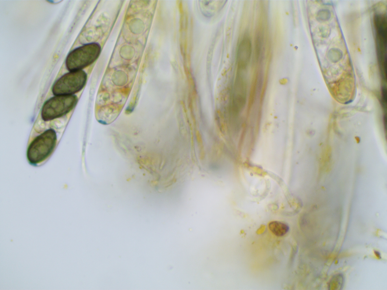Die Sporen sind ca. 14-15x8, die Iodreaktion ist sehr undeutlich und nur bei leeren Asci zu sehen, was ja eigentlich passen würde.