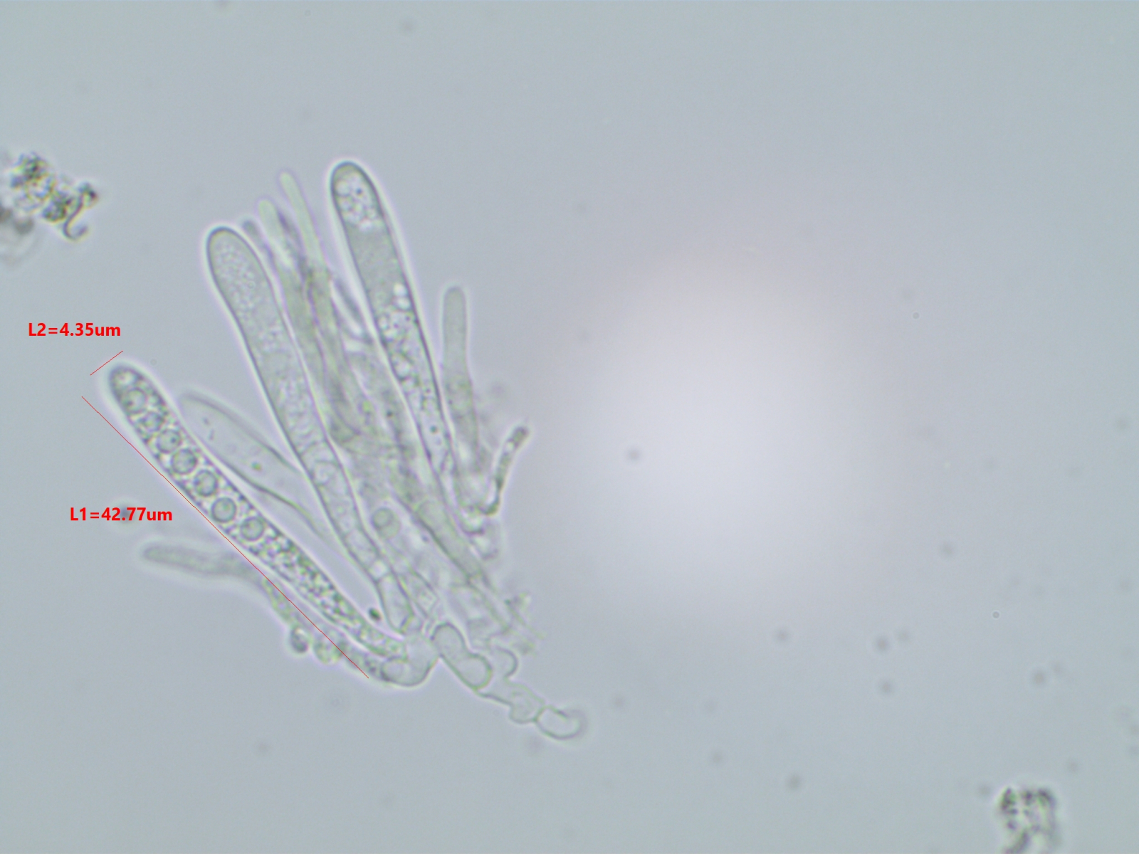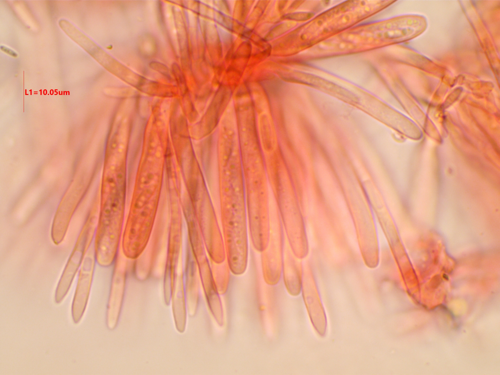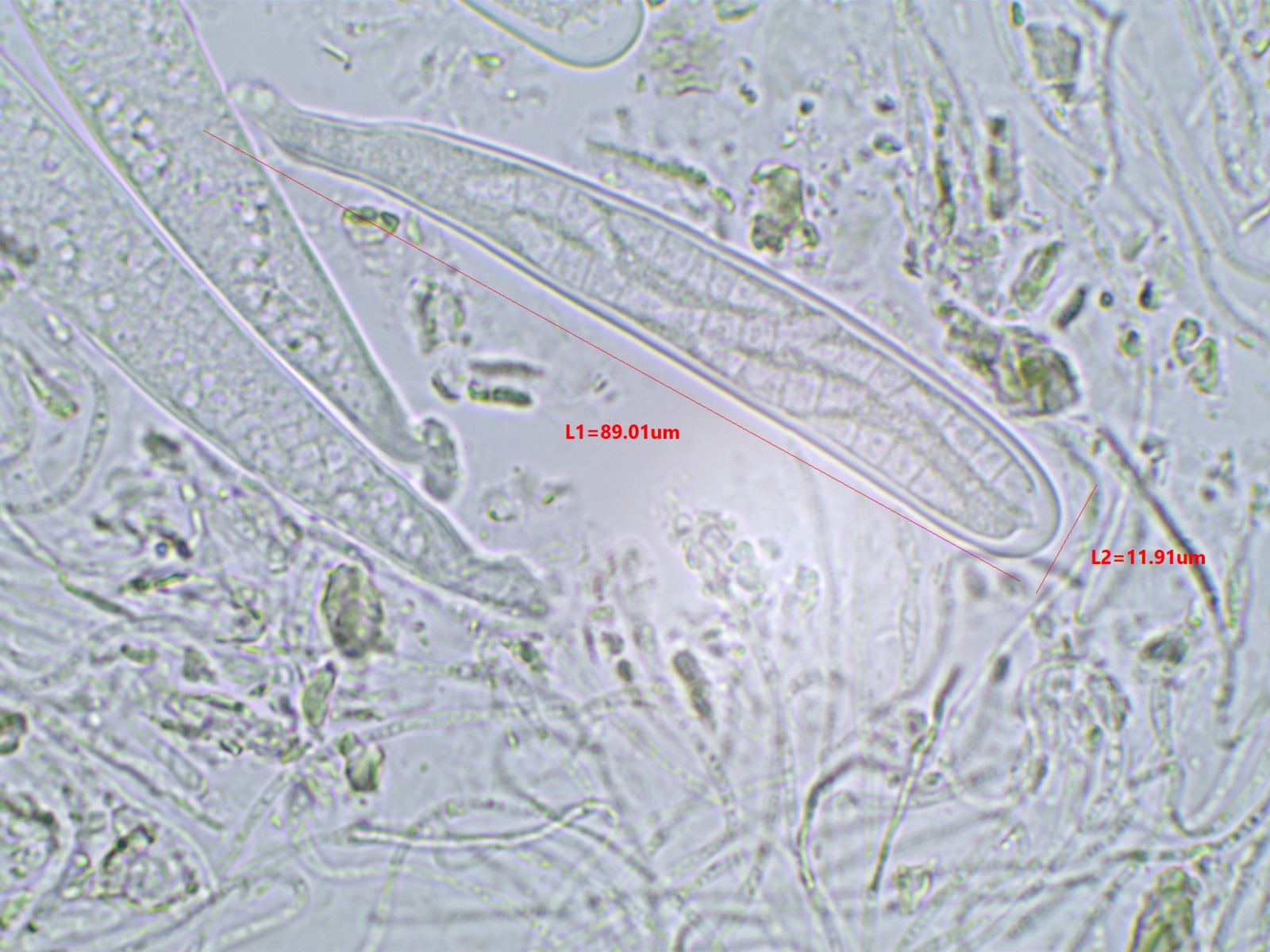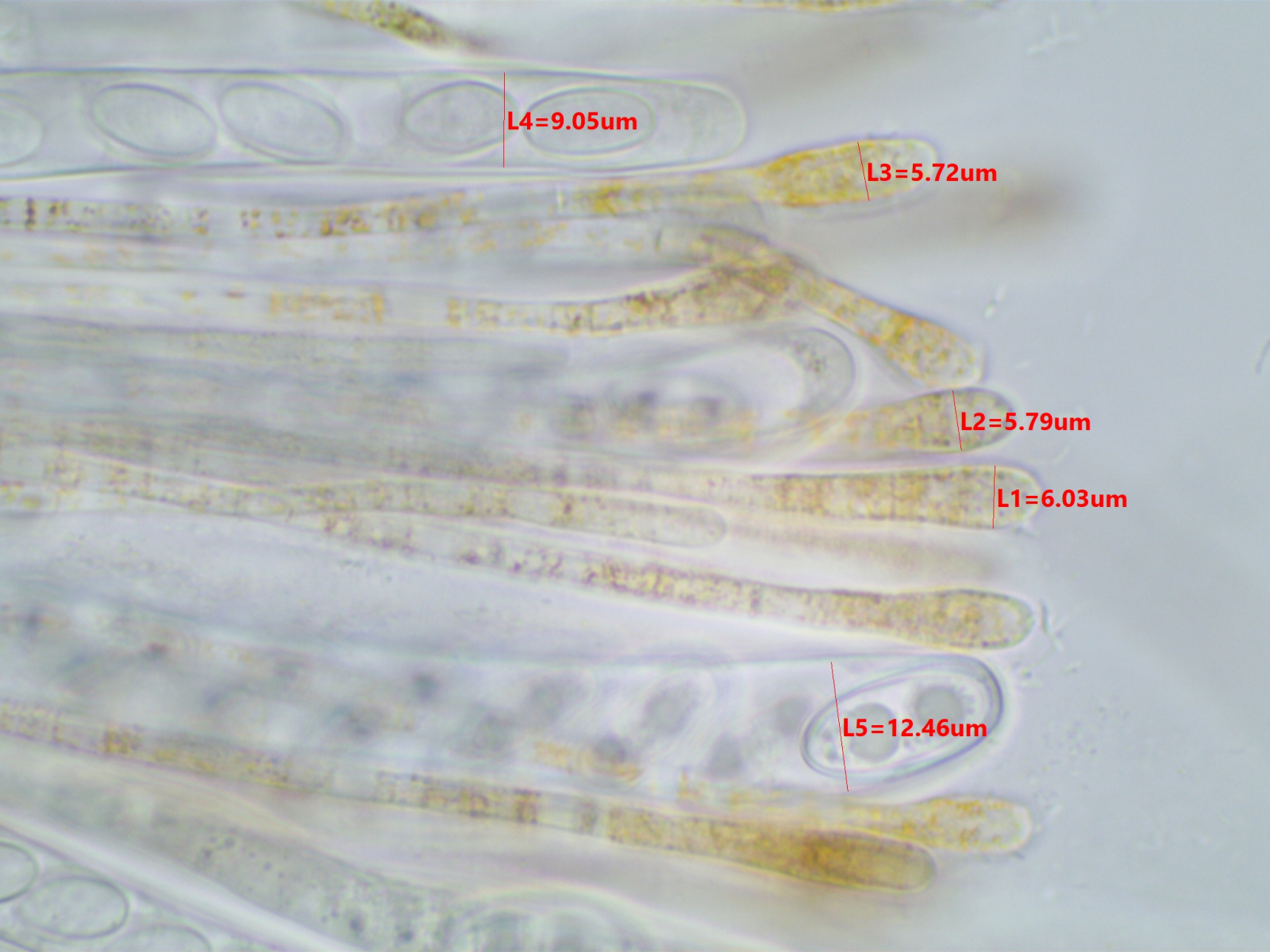 Die Sporen sind ca. 14-15x8, die Iodreaktion ist sehr undeutlich und nur bei leeren Asci zu sehen, was ja eigentlich passen würde.